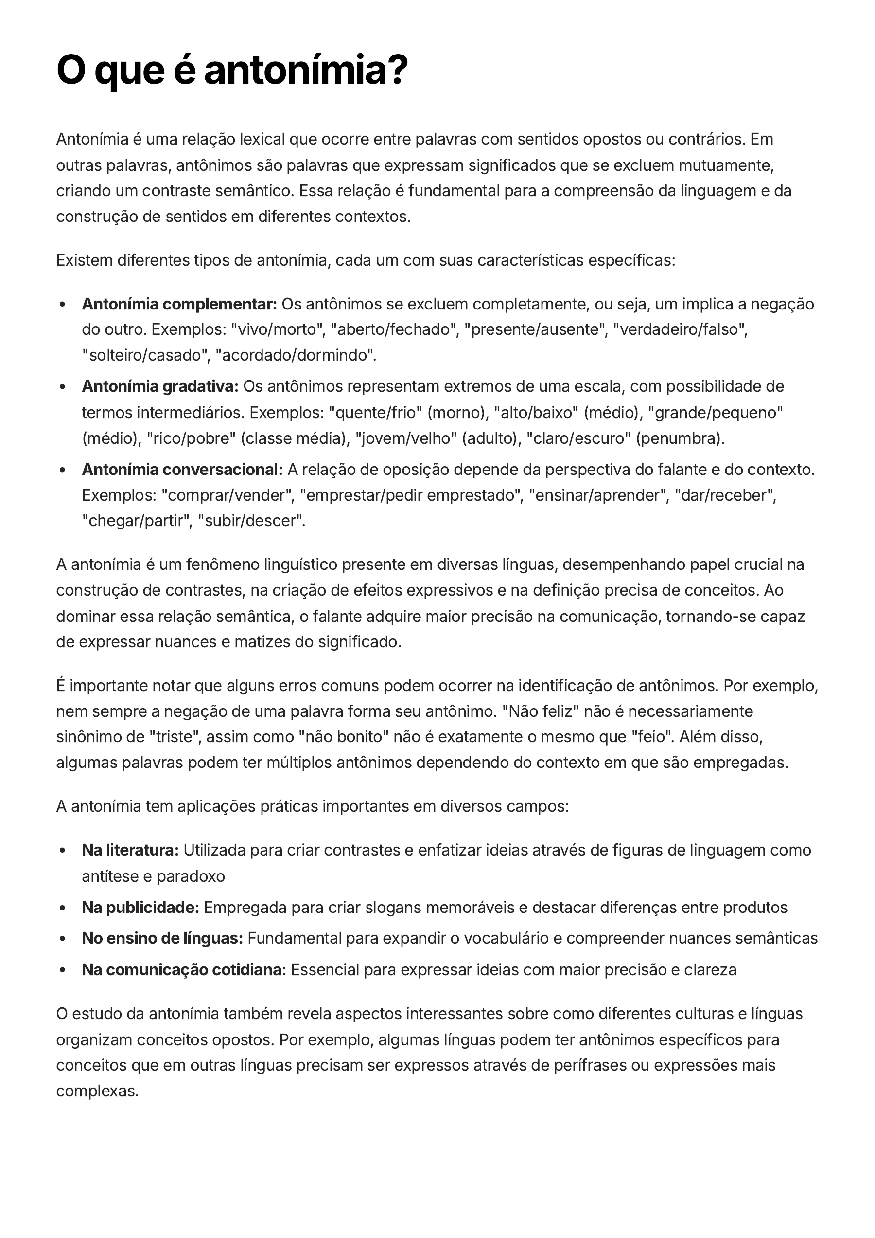 O que é antonímia? Antonímia é uma relação lexical que ocorre entre palavras com sentidos opostos ou contrários. Em outras palavras, antônimos são palavras que expressam significados que se excluem mutuamente, criando um contraste semântico. Essa relação é fundamental para a compreensão da linguagem e da construção de sentidos em diferentes contextos. Existem diferentes tipos de antonímia, cada um com suas características específicas: Antonímia complementar: Os antônimos se excluem completamente, ou seja, um implica a negação do outro. Exemplos: "vivo/morto", "aberto/fechado", "presente/ausente", "verdadeiro/falso", "solteiro/casado", "acordado/dormindo". Antonímia gradativa: Os antônimos representam extremos de uma escala, com possibilidade de termos intermediários. Exemplos: "quente/frio" (morno), "alto/baixo" (médio), "grande/pequeno" (médio), "rico/pobre" (classe média), "jovem/velho" (adulto), "claro/escuro" (penumbra). Antonímia conversacional: A relação de oposição depende da perspectiva do falante e do contexto. Exemplos: "comprar/vender", "emprestar/pedir emprestado", "ensinar/aprender", "dar/receber", "chegar/partir", "subir/descer". A antonímia é um fenômeno linguístico presente em diversas línguas, desempenhando papel crucial na construção de contrastes, na criação de efeitos expressivos e na definição precisa de conceitos. Ao dominar essa relação semântica, o falante adquire maior precisão na comunicação, tornando-se capaz de expressar nuances e matizes do significado. É importante notar que alguns erros comuns podem ocorrer na identificação de antônimos. Por exemplo, nem sempre a negação de uma palavra forma seu antônimo. "Não feliz" não é necessariamente sinônimo de "triste", assim como "não bonito" não é exatamente o mesmo que "feio". Além disso, algumas palavras podem ter múltiplos antônimos dependendo do contexto em que são empregadas. A antonímia tem aplicações práticas importantes em diversos campos: Na literatura: Utilizada para criar contrastes e enfatizar ideias através de figuras de linguagem como antítese e paradoxo Na publicidade: Empregada para criar slogans memoráveis e destacar diferenças entre produtos No ensino de línguas: Fundamental para expandir o vocabulário e compreender nuances semânticas Na comunicação cotidiana: Essencial para expressar ideias com maior precisão e clareza O estudo da antonímia também revela aspectos interessantes sobre como diferentes culturas e línguas organizam conceitos opostos. Por exemplo, algumas línguas podem ter antônimos específicos para conceitos que em outras línguas precisam ser expressos através de perífrases ou expressões mais complexas.
