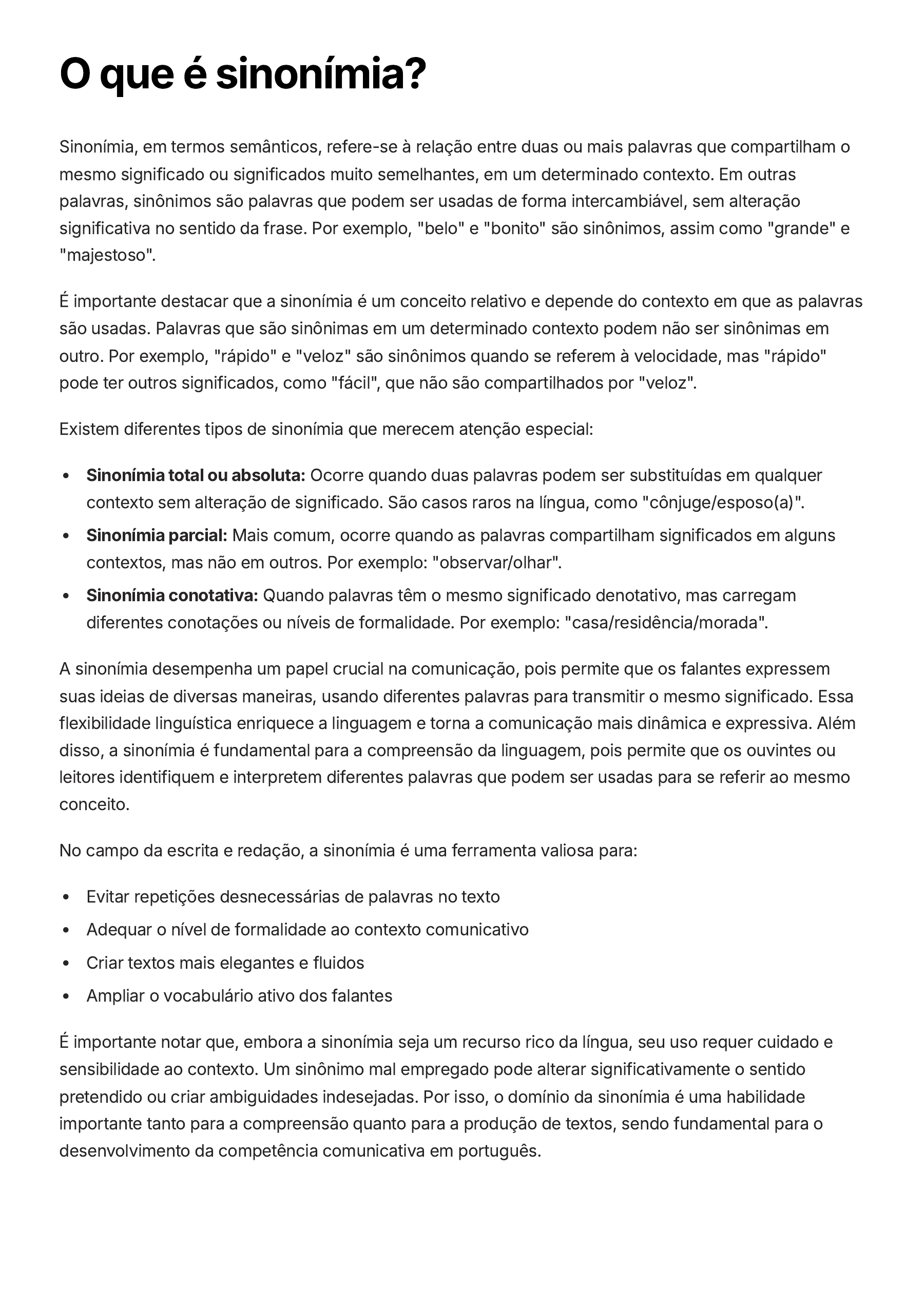 O que é sinonímia? Sinonímia, em termos semânticos, refere-se à relação entre duas ou mais palavras que compartilham o mesmo significado ou significados muito semelhantes, em um determinado contexto. Em outras palavras, sinônimos são palavras que podem ser usadas de forma intercambiável, sem alteração significativa no sentido da frase. Por exemplo, "belo" e "bonito" são sinônimos, assim como "grande" e "majestoso". É importante destacar que a sinonímia é um conceito relativo e depende do contexto em que as palavras são usadas. Palavras que são sinônimas em um determinado contexto podem não ser sinônimas em outro. Por exemplo, "rápido" e "veloz" são sinônimos quando se referem à velocidade, mas "rápido" pode ter outros significados, como "fácil", que não são compartilhados por "veloz". Existem diferentes tipos de sinonímia que merecem atenção especial: Sinonímia total ou absoluta: Ocorre quando duas palavras podem ser substituídas em qualquer contexto sem alteração de significado. São casos raros na língua, como "cônjuge/esposo(a)". Sinonímia parcial: Mais comum, ocorre quando as palavras compartilham significados em alguns contextos, mas não em outros. Por exemplo: "observar/olhar". Sinonímia conotativa: Quando palavras têm o mesmo significado denotativo, mas carregam diferentes conotações ou níveis de formalidade. Por exemplo: "casa/residência/morada". A sinonímia desempenha um papel crucial na comunicação, pois permite que os falantes expressem suas ideias de diversas maneiras, usando diferentes palavras para transmitir o mesmo significado. Essa flexibilidade linguística enriquece a linguagem e torna a comunicação mais dinâmica e expressiva. Além disso, a sinonímia é fundamental para a compreensão da linguagem, pois permite que os ouvintes ou leitores identifiquem e interpretem diferentes palavras que podem ser usadas para se referir ao mesmo conceito. No campo da escrita e redação, a sinonímia é uma ferramenta valiosa para: Evitar repetições desnecessárias de palavras no texto Adequar o nível de formalidade ao contexto comunicativo Criar textos mais elegantes e fluidos Ampliar o vocabulário ativo dos falantes É importante notar que, embora a sinonímia seja um recurso rico da língua, seu uso requer cuidado e sensibilidade ao contexto. Um sinônimo mal empregado pode alterar significativamente o sentido pretendido ou criar ambiguidades indesejadas. Por isso, o domínio da sinonímia é uma habilidade importante tanto para a compreensão quanto para a produção de textos, sendo fundamental para o desenvolvimento da competência comunicativa em português.