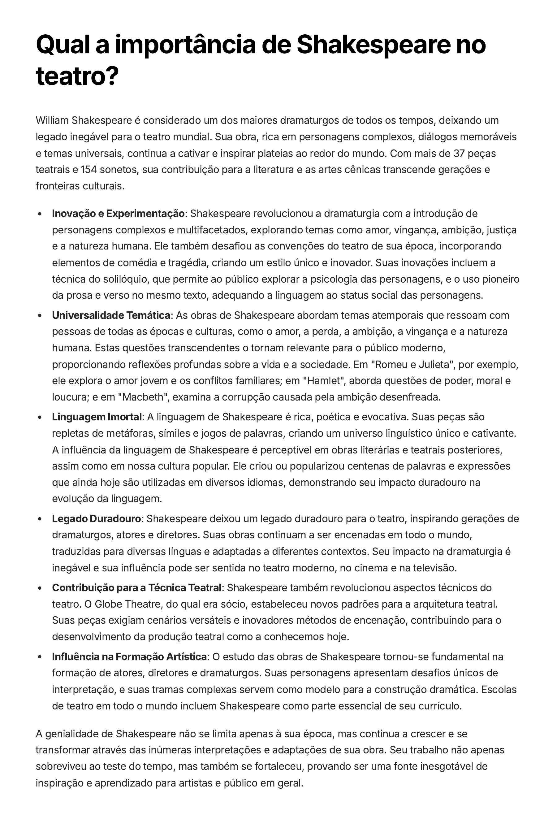 Qual a importância de Shakespeare no teatro? William Shakespeare é considerado um dos maiores dramaturgos de todos os tempos, deixando um legado inegável para o teatro mundial. Sua obra, rica em personagens complexos, diálogos memoráveis e temas universais, continua a cativar e inspirar plateias ao redor do mundo. Com mais de 37 peças teatrais e 154 sonetos, sua contribuição para a literatura e as artes cênicas transcende gerações e fronteiras culturais. Inovação e Experimentação: Shakespeare revolucionou a dramaturgia com a introdução de personagens complexos e multifacetados, explorando temas como amor, vingança, ambição, justiça e a natureza humana. Ele também desafiou as convenções do teatro de sua época, incorporando elementos de comédia e tragédia, criando um estilo único e inovador. Suas inovações incluem a técnica do solilóquio, que permite ao público explorar a psicologia das personagens, e o uso pioneiro da prosa e verso no mesmo texto, adequando a linguagem ao status social das personagens. Universalidade Temática: As obras de Shakespeare abordam temas atemporais que ressoam com pessoas de todas as épocas e culturas, como o amor, a perda, a ambição, a vingança e a natureza humana. Estas questões transcendentes o tornam relevante para o público moderno, proporcionando reflexões profundas sobre a vida e a sociedade. Em "Romeu e Julieta", por exemplo, ele explora o amor jovem e os conflitos familiares; em "Hamlet", aborda questões de poder, moral e loucura; e em "Macbeth", examina a corrupção causada pela ambição desenfreada. Linguagem Imortal: A linguagem de Shakespeare é rica, poética e evocativa. Suas peças são repletas de metáforas, símiles e jogos de palavras, criando um universo linguístico único e cativante. A influência da linguagem de Shakespeare é perceptível em obras literárias e teatrais posteriores, assim como em nossa cultura popular. Ele criou ou popularizou centenas de palavras e expressões que ainda hoje são utilizadas em diversos idiomas, demonstrando seu impacto duradouro na evolução da linguagem. Legado Duradouro: Shakespeare deixou um legado duradouro para o teatro, inspirando gerações de dramaturgos, atores e diretores. Suas obras continuam a ser encenadas em todo o mundo, traduzidas para diversas línguas e adaptadas a diferentes contextos. Seu impacto na dramaturgia é inegável e sua influência pode ser sentida no teatro moderno, no cinema e na televisão. Contribuição para a Técnica Teatral: Shakespeare também revolucionou aspectos técnicos do teatro. O Globe Theatre, do qual era sócio, estabeleceu novos padrões para a arquitetura teatral. Suas peças exigiam cenários versáteis e inovadores métodos de encenação, contribuindo para o desenvolvimento da produção teatral como a conhecemos hoje. Influência na Formação Artística: O estudo das obras de Shakespeare tornou-se fundamental na formação de atores, diretores e dramaturgos. Suas personagens apresentam desafios únicos de interpretação, e suas tramas complexas servem como modelo para a construção dramática. Escolas de teatro em todo o mundo incluem Shakespeare como parte essencial de seu currículo. A genialidade de Shakespeare não se limita apenas à sua época, mas continua a crescer e se transformar através das inúmeras interpretações e adaptações de sua obra. Seu trabalho não apenas sobreviveu ao teste do tempo, mas também se fortaleceu, provando ser uma fonte inesgotável de inspiração e aprendizado para artistas e público em geral.
