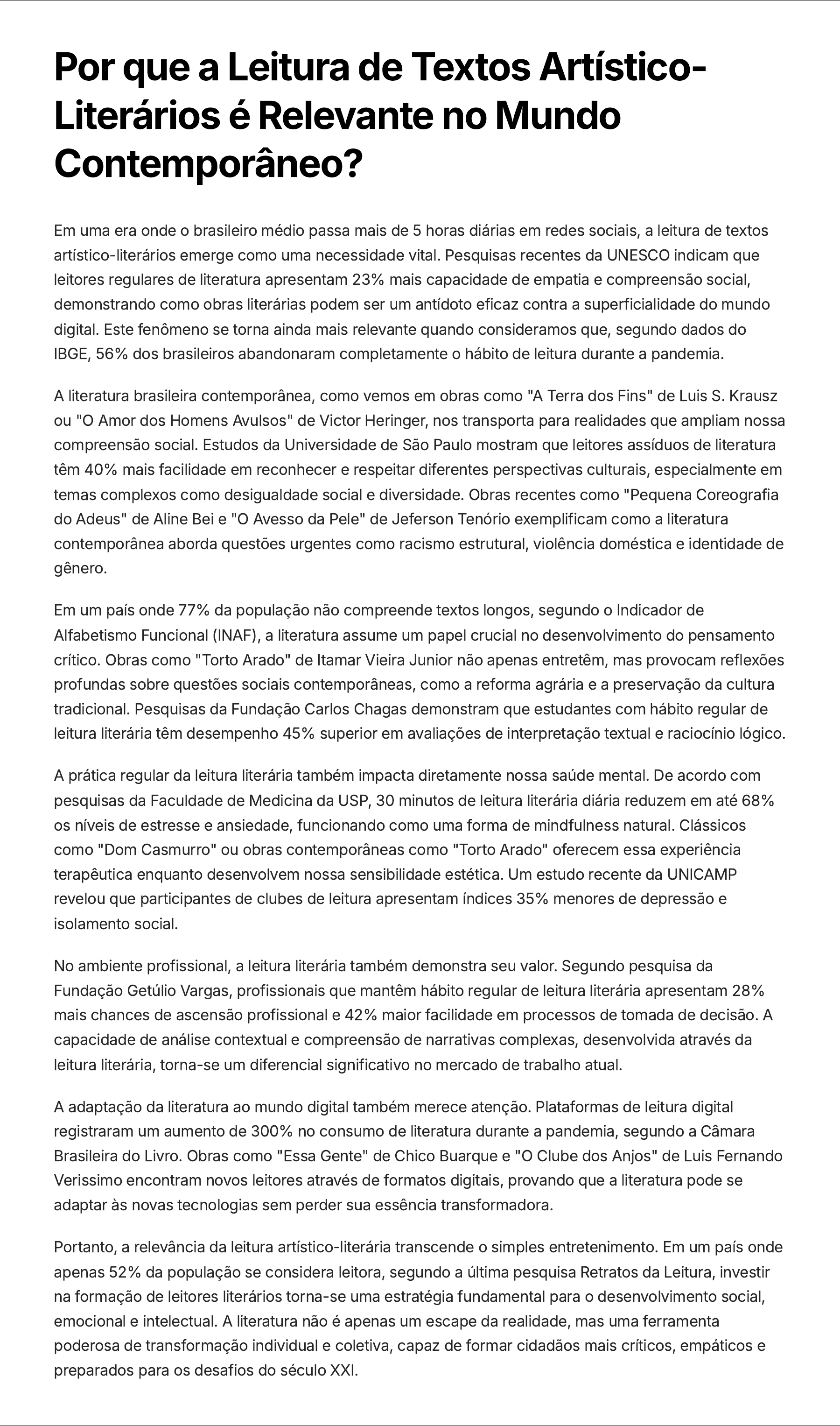 Por que a Leitura de Textos Artístico- Literários é Relevante no Mundo Contemporâneo? Em uma era onde o brasileiro médio passa mais de 5 horas diárias em redes sociais, a leitura de textos artístico-literários emerge como uma necessidade vital. Pesquisas recentes da UNESCO indicam que leitores regulares de literatura apresentam 23% mais capacidade de empatia e compreensão social, demonstrando como obras literárias podem ser um antídoto eficaz contra a superficialidade do mundo digital. Este fenômeno se torna ainda mais relevante quando consideramos que, segundo dados do IBGE, 56% dos brasileiros abandonaram completamente o hábito de leitura durante a pandemia. A literatura brasileira contemporânea, como vemos em obras como "A Terra dos Fins" de Luis S. Krausz ou "O Amor dos Homens Avulsos" de Victor Heringer, nos transporta para realidades que ampliam nossa compreensão social. Estudos da Universidade de São Paulo mostram que leitores assíduos de literatura têm 40% mais facilidade em reconhecer e respeitar diferentes perspectivas culturais, especialmente em temas complexos como desigualdade social e diversidade. Obras recentes como "Pequena Coreografia do Adeus" de Aline Bei e "O Avesso da Pele" de Jeferson Tenório exemplificam como a literatura contemporânea aborda questões urgentes como racismo estrutural, violência doméstica e identidade de gênero. Em um país onde 77% da população não compreende textos longos, segundo o Indicador de Alfabetismo Funcional (INAF), a literatura assume um papel crucial no desenvolvimento do pensamento crítico. Obras como "Torto Arado" de Itamar Vieira Junior não apenas entretêm, mas provocam reflexões profundas sobre questões sociais contemporâneas, como a reforma agrária e a preservação da cultura tradicional. Pesquisas da Fundação Carlos Chagas demonstram que estudantes com hábito regular de leitura literária têm desempenho 45% superior em avaliações de interpretação textual e raciocínio lógico. A prática regular da leitura literária também impacta diretamente nossa saúde mental. De acordo com pesquisas da Faculdade de Medicina da USP, 30 minutos de leitura literária diária reduzem em até 68% os níveis de estresse e ansiedade, funcionando como uma forma de mindfulness natural. Clássicos como "Dom Casmurro" ou obras contemporâneas como "Torto Arado" oferecem essa experiência terapêutica enquanto desenvolvem nossa sensibilidade estética. Um estudo recente da UNICAMP revelou que participantes de clubes de leitura apresentam índices 35% menores de depressão e isolamento social. No ambiente profissional, a leitura literária também demonstra seu valor. Segundo pesquisa da Fundação Getúlio Vargas, profissionais que mantêm hábito regular de leitura literária apresentam 28% mais chances de ascensão profissional e 42% maior facilidade em processos de tomada de decisão. A capacidade de análise contextual e compreensão de narrativas complexas, desenvolvida através da leitura literária, torna-se um diferencial significativo no mercado de trabalho atual. A adaptação da literatura ao mundo digital também merece atenção. Plataformas de leitura digital registraram um aumento de 300% no consumo de literatura durante a pandemia, segundo a Câmara Brasileira do Livro. Obras como "Essa Gente" de Chico Buarque e "O Clube dos Anjos" de Luis Fernando Verissimo encontram novos leitores através de formatos digitais, provando que a literatura pode se adaptar às novas tecnologias sem perder sua essência transformadora. Portanto, a relevância da leitura artístico-literária transcende o simples entretenimento. Em um país onde apenas 52% da população se considera leitora, segundo a última pesquisa Retratos da Leitura, investir na formação de leitores literários torna-se uma estratégia fundamental para o desenvolvimento social, emocional e intelectual. A literatura não é apenas um escape da realidade, mas uma ferramenta poderosa de transformação individual e coletiva, capaz de formar cidadãos mais críticos, empáticos e preparados para os desafios do século XXI.