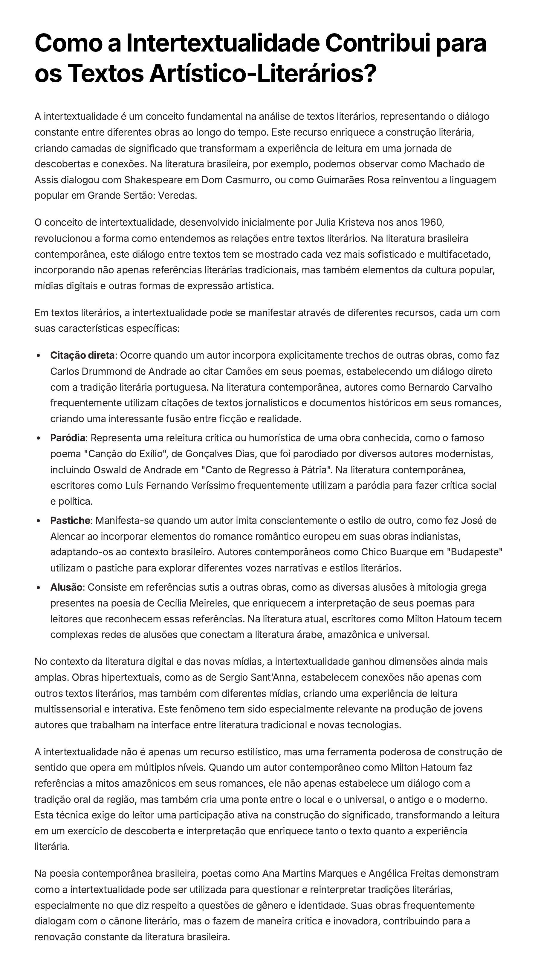 Como a Intertextualidade Contribui para os Textos Artístico-Literários? A intertextualidade é um conceito fundamental na análise de textos literários, representando o diálogo constante entre diferentes obras ao longo do tempo. Este recurso enriquece a construção literária, criando camadas de significado que transformam a experiência de leitura em uma jornada de descobertas e conexões. Na literatura brasileira, por exemplo, podemos observar como Machado de Assis dialogou com Shakespeare em Dom Casmurro, ou como Guimarães Rosa reinventou a linguagem popular em Grande Sertão: Veredas. O conceito de intertextualidade, desenvolvido inicialmente por Julia Kristeva nos anos 1960, revolucionou a forma como entendemos as relações entre textos literários. Na literatura brasileira contemporânea, este diálogo entre textos tem se mostrado cada vez mais sofisticado e multifacetado, incorporando não apenas referências literárias tradicionais, mas também elementos da cultura popular, mídias digitais e outras formas de expressão artística. Em textos literários, a intertextualidade pode se manifestar através de diferentes recursos, cada um com suas características específicas: Citação direta: Ocorre quando um autor incorpora explicitamente trechos de outras obras, como faz Carlos Drummond de Andrade ao citar Camões em seus poemas, estabelecendo um diálogo direto com a tradição literária portuguesa. Na literatura contemporânea, autores como Bernardo Carvalho frequentemente utilizam citações de textos jornalísticos e documentos históricos em seus romances, criando uma interessante fusão entre ficção e realidade. Paródia: Representa uma releitura crítica ou humorística de uma obra conhecida, como o famoso poema "Canção do Exílio", de Gonçalves Dias, que foi parodiado por diversos autores modernistas, incluindo Oswald de Andrade em "Canto de Regresso à Pátria". Na literatura contemporânea, escritores como Luís Fernando Veríssimo frequentemente utilizam a paródia para fazer crítica social e política. Pastiche: Manifesta-se quando um autor imita conscientemente o estilo de outro, como fez José de Alencar ao incorporar elementos do romance romântico europeu em suas obras indianistas, adaptando-os ao contexto brasileiro. Autores contemporâneos como Chico Buarque em "Budapeste" utilizam o pastiche para explorar diferentes vozes narrativas e estilos literários. Alusão: Consiste em referências sutis a outras obras, como as diversas alusões à mitologia grega presentes na poesia de Cecília Meireles, que enriquecem a interpretação de seus poemas para leitores que reconhecem essas referências. Na literatura atual, escritores como Milton Hatoum tecem complexas redes de alusões que conectam a literatura árabe, amazônica e universal. No contexto da literatura digital e das novas mídias, a intertextualidade ganhou dimensões ainda mais amplas. Obras hipertextuais, como as de Sergio Sant'Anna, estabelecem conexões não apenas com outros textos literários, mas também com diferentes mídias, criando uma experiência de leitura multissensorial e interativa. Este fenômeno tem sido especialmente relevante na produção de jovens autores que trabalham na interface entre literatura tradicional e novas tecnologias. A intertextualidade não é apenas um recurso estilístico, mas uma ferramenta poderosa de construção de sentido que opera em múltiplos níveis. Quando um autor contemporâneo como Milton Hatoum faz referências a mitos amazônicos em seus romances, ele não apenas estabelece um diálogo com a tradição oral da região, mas também cria uma ponte entre o local e o universal, o antigo e o moderno. Esta técnica exige do leitor uma participação ativa na construção do significado, transformando a leitura em um exercício de descoberta e interpretação que enriquece tanto o texto quanto a experiência literária. Na poesia contemporânea brasileira, poetas como Ana Martins Marques e Angélica Freitas demonstram como a intertextualidade pode ser utilizada para questionar e reinterpretar tradições literárias, especialmente no que diz respeito a questões de gênero e identidade. Suas obras frequentemente dialogam com o cânone literário, mas o fazem de maneira crítica e inovadora, contribuindo para a renovação constante da literatura brasileira.