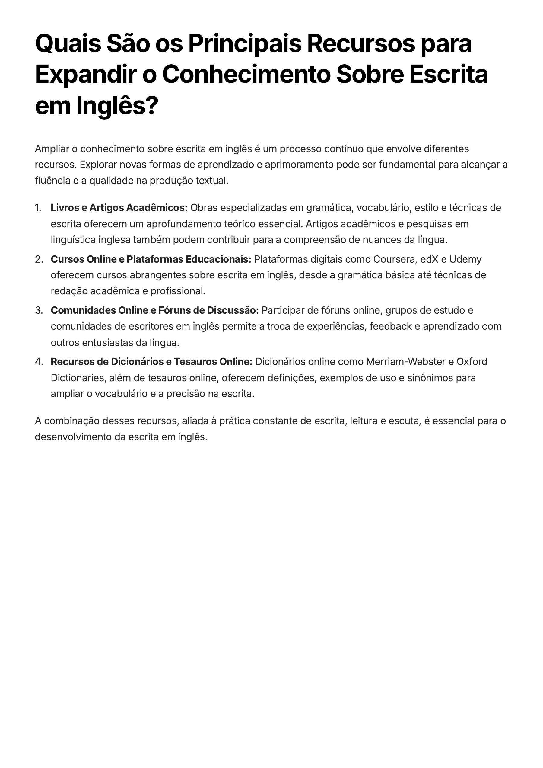 Quais São os Principais Recursos para Expandir o Conhecimento Sobre Escrita em Inglês? Ampliar o conhecimento sobre escrita em inglês é um processo contínuo que envolve diferentes recursos. Explorar novas formas de aprendizado e aprimoramento pode ser fundamental para alcançar a fluência e a qualidade na produção textual. Livros e Artigos Acadêmicos: Obras especializadas em gramática, vocabulário, estilo e técnicas de escrita oferecem um aprofundamento teórico essencial. Artigos acadêmicos e pesquisas em linguística inglesa também podem contribuir para a compreensão de nuances da língua. 1. Cursos Online e Plataformas Educacionais: Plataformas digitais como Coursera, edX e Udemy oferecem cursos abrangentes sobre escrita em inglês, desde a gramática básica até técnicas de redação acadêmica e profissional. 2. Comunidades Online e Fóruns de Discussão: Participar de fóruns online, grupos de estudo e comunidades de escritores em inglês permite a troca de experiências, feedback e aprendizado com outros entusiastas da língua. 3. Recursos de Dicionários e Tesauros Online: Dicionários online como Merriam-Webster e Oxford Dictionaries, além de tesauros online, oferecem definições, exemplos de uso e sinônimos para ampliar o vocabulário e a precisão na escrita. 4. A combinação desses recursos, aliada à prática constante de escrita, leitura e escuta, é essencial para o desenvolvimento da escrita em inglês.