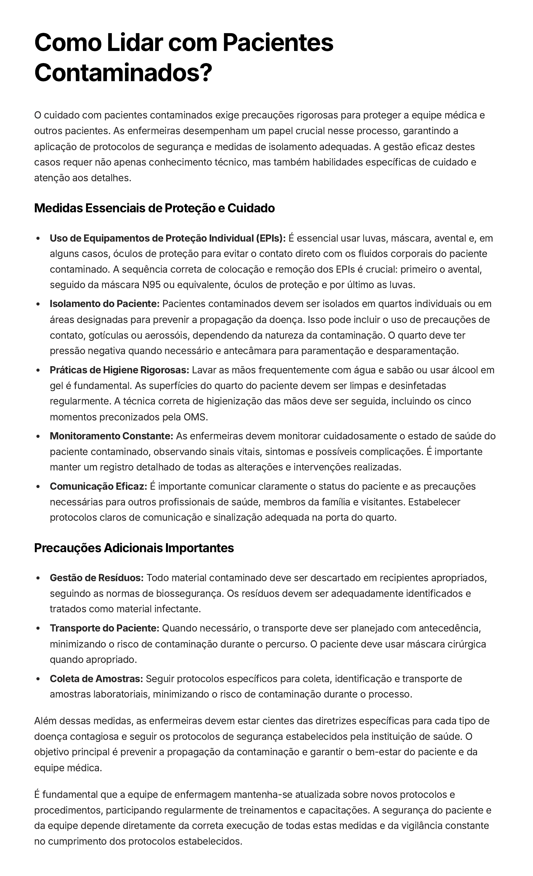 Como Lidar com Pacientes Contaminados? O cuidado com pacientes contaminados exige precauções rigorosas para proteger a equipe médica e outros pacientes. As enfermeiras desempenham um papel crucial nesse processo, garantindo a aplicação de protocolos de segurança e medidas de isolamento adequadas. A gestão eficaz destes casos requer não apenas conhecimento técnico, mas também habilidades específicas de cuidado e atenção aos detalhes. Medidas Essenciais de Proteção e Cuidado Uso de Equipamentos de Proteção Individual (EPIs): É essencial usar luvas, máscara, avental e, em alguns casos, óculos de proteção para evitar o contato direto com os fluidos corporais do paciente contaminado. A sequência correta de colocação e remoção dos EPIs é crucial: primeiro o avental, seguido da máscara N95 ou equivalente, óculos de proteção e por último as luvas. Isolamento do Paciente: Pacientes contaminados devem ser isolados em quartos individuais ou em áreas designadas para prevenir a propagação da doença. Isso pode incluir o uso de precauções de contato, gotículas ou aerossóis, dependendo da natureza da contaminação. O quarto deve ter pressão negativa quando necessário e antecâmara para paramentação e desparamentação. Práticas de Higiene Rigorosas: Lavar as mãos frequentemente com água e sabão ou usar álcool em gel é fundamental. As superfícies do quarto do paciente devem ser limpas e desinfetadas regularmente. A técnica correta de higienização das mãos deve ser seguida, incluindo os cinco momentos preconizados pela OMS. Monitoramento Constante: As enfermeiras devem monitorar cuidadosamente o estado de saúde do paciente contaminado, observando sinais vitais, sintomas e possíveis complicações. É importante manter um registro detalhado de todas as alterações e intervenções realizadas. Comunicação Eficaz: É importante comunicar claramente o status do paciente e as precauções necessárias para outros profissionais de saúde, membros da família e visitantes. Estabelecer protocolos claros de comunicação e sinalização adequada na porta do quarto. Precauções Adicionais Importantes Gestão de Resíduos: Todo material contaminado deve ser descartado em recipientes apropriados, seguindo as normas de biossegurança. Os resíduos devem ser adequadamente identificados e tratados como material infectante. Transporte do Paciente: Quando necessário, o transporte deve ser planejado com antecedência, minimizando o risco de contaminação durante o percurso. O paciente deve usar máscara cirúrgica quando apropriado. Coleta de Amostras: Seguir protocolos específicos para coleta, identificação e transporte de amostras laboratoriais, minimizando o risco de contaminação durante o processo. Além dessas medidas, as enfermeiras devem estar cientes das diretrizes específicas para cada tipo de doença contagiosa e seguir os protocolos de segurança estabelecidos pela instituição de saúde. O objetivo principal é prevenir a propagação da contaminação e garantir o bem-estar do paciente e da equipe médica. É fundamental que a equipe de enfermagem mantenha-se atualizada sobre novos protocolos e procedimentos, participando regularmente de treinamentos e capacitações. A segurança do paciente e da equipe depende diretamente da correta execução de todas estas medidas e da vigilância constante no cumprimento dos protocolos estabelecidos.