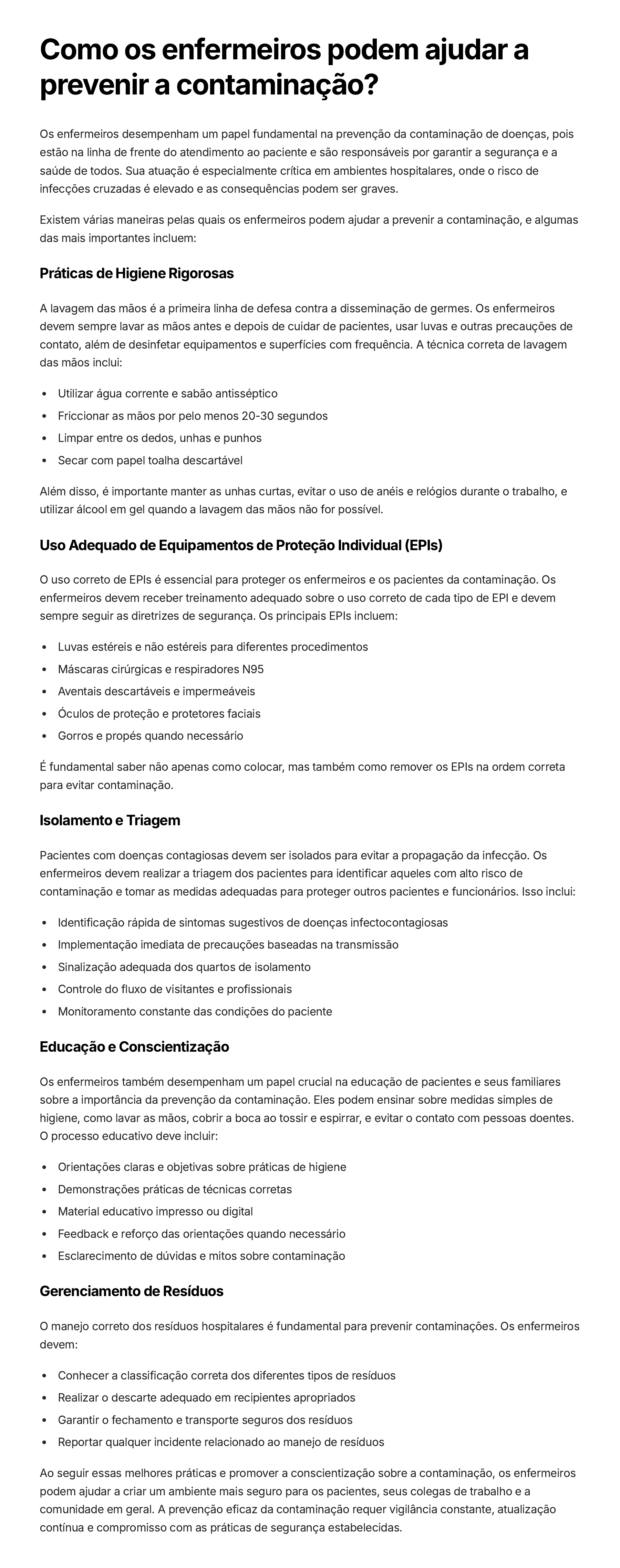Como os enfermeiros podem ajudar a prevenir a contaminação? Os enfermeiros desempenham um papel fundamental na prevenção da contaminação de doenças, pois estão na linha de frente do atendimento ao paciente e são responsáveis por garantir a segurança e a saúde de todos. Sua atuação é especialmente crítica em ambientes hospitalares, onde o risco de infecções cruzadas é elevado e as consequências podem ser graves. Existem várias maneiras pelas quais os enfermeiros podem ajudar a prevenir a contaminação, e algumas das mais importantes incluem: Práticas de Higiene Rigorosas A lavagem das mãos é a primeira linha de defesa contra a disseminação de germes. Os enfermeiros devem sempre lavar as mãos antes e depois de cuidar de pacientes, usar luvas e outras precauções de contato, além de desinfetar equipamentos e superfícies com frequência. A técnica correta de lavagem das mãos inclui: Utilizar água corrente e sabão antisséptico Friccionar as mãos por pelo menos 20-30 segundos Limpar entre os dedos, unhas e punhos Secar com papel toalha descartável Além disso, é importante manter as unhas curtas, evitar o uso de anéis e relógios durante o trabalho, e utilizar álcool em gel quando a lavagem das mãos não for possível. Uso Adequado de Equipamentos de Proteção Individual (EPIs) O uso correto de EPIs é essencial para proteger os enfermeiros e os pacientes da contaminação. Os enfermeiros devem receber treinamento adequado sobre o uso correto de cada tipo de EPI e devem sempre seguir as diretrizes de segurança. Os principais EPIs incluem: Luvas estéreis e não estéreis para diferentes procedimentos Máscaras cirúrgicas e respiradores N95 Aventais descartáveis e impermeáveis Óculos de proteção e protetores faciais Gorros e propés quando necessário É fundamental saber não apenas como colocar, mas também como remover os EPIs na ordem correta para evitar contaminação. Isolamento e Triagem Pacientes com doenças contagiosas devem ser isolados para evitar a propagação da infecção. Os enfermeiros devem realizar a triagem dos pacientes para identificar aqueles com alto risco de contaminação e tomar as medidas adequadas para proteger outros pacientes e funcionários. Isso inclui: Identificação rápida de sintomas sugestivos de doenças infectocontagiosas Implementação imediata de precauções baseadas na transmissão Sinalização adequada dos quartos de isolamento Controle do fluxo de visitantes e profissionais Monitoramento constante das condições do paciente Educação e Conscientização Os enfermeiros também desempenham um papel crucial na educação de pacientes e seus familiares sobre a importância da prevenção da contaminação. Eles podem ensinar sobre medidas simples de higiene, como lavar as mãos, cobrir a boca ao tossir e espirrar, e evitar o contato com pessoas doentes. O processo educativo deve incluir: Orientações claras e objetivas sobre práticas de higiene Demonstrações práticas de técnicas corretas Material educativo impresso ou digital Feedback e reforço das orientações quando necessário Esclarecimento de dúvidas e mitos sobre contaminação Gerenciamento de Resíduos O manejo correto dos resíduos hospitalares é fundamental para prevenir contaminações. Os enfermeiros devem: Conhecer a classificação correta dos diferentes tipos de resíduos Realizar o descarte adequado em recipientes apropriados Garantir o fechamento e transporte seguros dos resíduos Reportar qualquer incidente relacionado ao manejo de resíduos Ao seguir essas melhores práticas e promover a conscientização sobre a contaminação, os enfermeiros podem ajudar a criar um ambiente mais seguro para os pacientes, seus colegas de trabalho e a comunidade em geral. A prevenção eficaz da contaminação requer vigilância constante, atualização contínua e compromisso com as práticas de segurança estabelecidas.