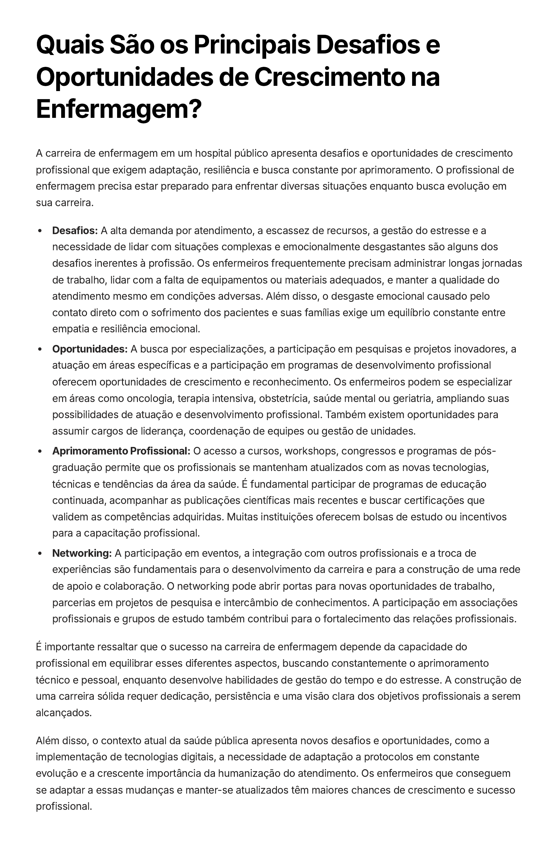 Quais São os Principais Desafios e Oportunidades de Crescimento na Enfermagem? A carreira de enfermagem em um hospital público apresenta desafios e oportunidades de crescimento profissional que exigem adaptação, resiliência e busca constante por aprimoramento. O profissional de enfermagem precisa estar preparado para enfrentar diversas situações enquanto busca evolução em sua carreira. Desafios: A alta demanda por atendimento, a escassez de recursos, a gestão do estresse e a necessidade de lidar com situações complexas e emocionalmente desgastantes são alguns dos desafios inerentes à profissão. Os enfermeiros frequentemente precisam administrar longas jornadas de trabalho, lidar com a falta de equipamentos ou materiais adequados, e manter a qualidade do atendimento mesmo em condições adversas. Além disso, o desgaste emocional causado pelo contato direto com o sofrimento dos pacientes e suas famílias exige um equilíbrio constante entre empatia e resiliência emocional. Oportunidades: A busca por especializações, a participação em pesquisas e projetos inovadores, a atuação em áreas específicas e a participação em programas de desenvolvimento profissional oferecem oportunidades de crescimento e reconhecimento. Os enfermeiros podem se especializar em áreas como oncologia, terapia intensiva, obstetrícia, saúde mental ou geriatria, ampliando suas possibilidades de atuação e desenvolvimento profissional. Também existem oportunidades para assumir cargos de liderança, coordenação de equipes ou gestão de unidades. Aprimoramento Profissional: O acesso a cursos, workshops, congressos e programas de pós- graduação permite que os profissionais se mantenham atualizados com as novas tecnologias, técnicas e tendências da área da saúde. É fundamental participar de programas de educação continuada, acompanhar as publicações científicas mais recentes e buscar certificações que validem as competências adquiridas. Muitas instituições oferecem bolsas de estudo ou incentivos para a capacitação profissional. Networking: A participação em eventos, a integração com outros profissionais e a troca de experiências são fundamentais para o desenvolvimento da carreira e para a construção de uma rede de apoio e colaboração. O networking pode abrir portas para novas oportunidades de trabalho, parcerias em projetos de pesquisa e intercâmbio de conhecimentos. A participação em associações profissionais e grupos de estudo também contribui para o fortalecimento das relações profissionais. É importante ressaltar que o sucesso na carreira de enfermagem depende da capacidade do profissional em equilibrar esses diferentes aspectos, buscando constantemente o aprimoramento técnico e pessoal, enquanto desenvolve habilidades de gestão do tempo e do estresse. A construção de uma carreira sólida requer dedicação, persistência e uma visão clara dos objetivos profissionais a serem alcançados. Além disso, o contexto atual da saúde pública apresenta novos desafios e oportunidades, como a implementação de tecnologias digitais, a necessidade de adaptação a protocolos em constante evolução e a crescente importância da humanização do atendimento. Os enfermeiros que conseguem se adaptar a essas mudanças e manter-se atualizados têm maiores chances de crescimento e sucesso profissional.