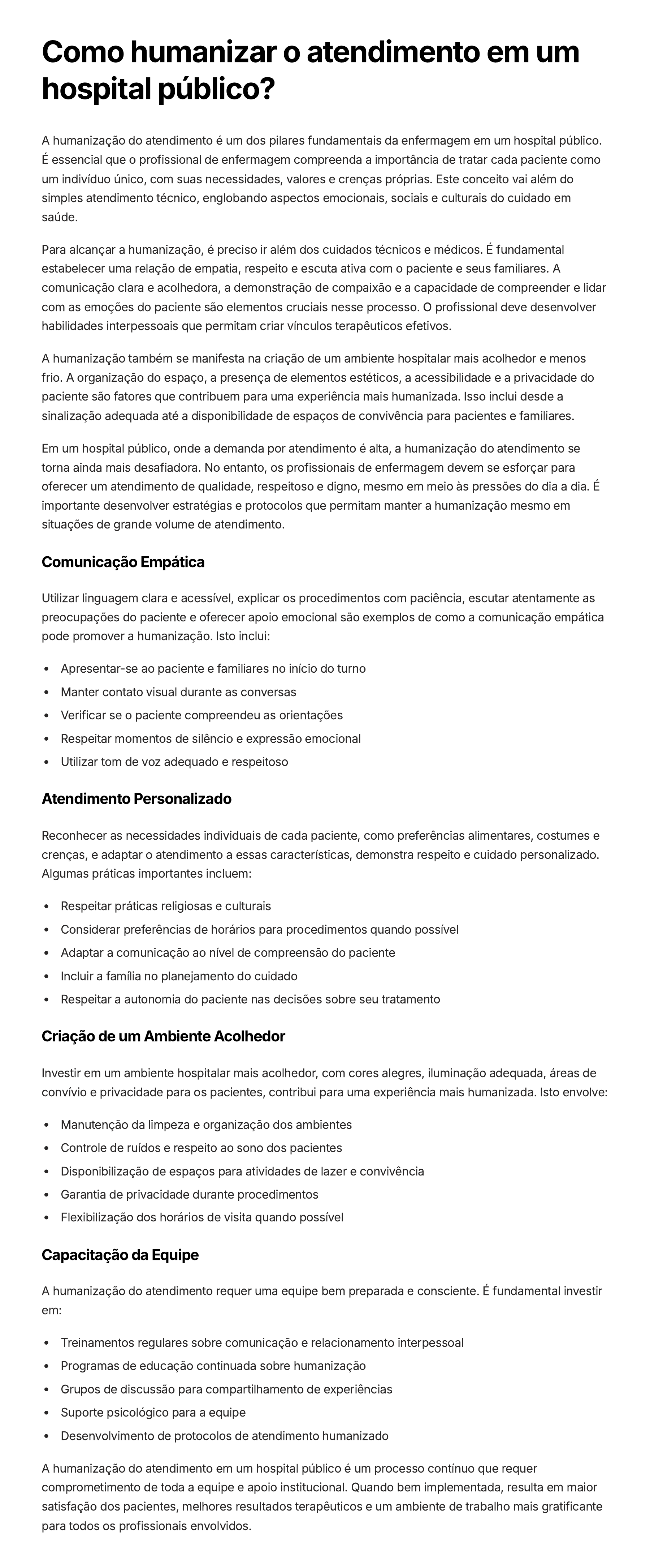 Como humanizar o atendimento em um hospital público? A humanização do atendimento é um dos pilares fundamentais da enfermagem em um hospital público. É essencial que o profissional de enfermagem compreenda a importância de tratar cada paciente como um indivíduo único, com suas necessidades, valores e crenças próprias. Este conceito vai além do simples atendimento técnico, englobando aspectos emocionais, sociais e culturais do cuidado em saúde. Para alcançar a humanização, é preciso ir além dos cuidados técnicos e médicos. É fundamental estabelecer uma relação de empatia, respeito e escuta ativa com o paciente e seus familiares. A comunicação clara e acolhedora, a demonstração de compaixão e a capacidade de compreender e lidar com as emoções do paciente são elementos cruciais nesse processo. O profissional deve desenvolver habilidades interpessoais que permitam criar vínculos terapêuticos efetivos. A humanização também se manifesta na criação de um ambiente hospitalar mais acolhedor e menos frio. A organização do espaço, a presença de elementos estéticos, a acessibilidade e a privacidade do paciente são fatores que contribuem para uma experiência mais humanizada. Isso inclui desde a sinalização adequada até a disponibilidade de espaços de convivência para pacientes e familiares. Em um hospital público, onde a demanda por atendimento é alta, a humanização do atendimento se torna ainda mais desafiadora. No entanto, os profissionais de enfermagem devem se esforçar para oferecer um atendimento de qualidade, respeitoso e digno, mesmo em meio às pressões do dia a dia. É importante desenvolver estratégias e protocolos que permitam manter a humanização mesmo em situações de grande volume de atendimento. Comunicação Empática Utilizar linguagem clara e acessível, explicar os procedimentos com paciência, escutar atentamente as preocupações do paciente e oferecer apoio emocional são exemplos de como a comunicação empática pode promover a humanização. Isto inclui: Apresentar-se ao paciente e familiares no início do turno Manter contato visual durante as conversas Verificar se o paciente compreendeu as orientações Respeitar momentos de silêncio e expressão emocional Utilizar tom de voz adequado e respeitoso Atendimento Personalizado Reconhecer as necessidades individuais de cada paciente, como preferências alimentares, costumes e crenças, e adaptar o atendimento a essas características, demonstra respeito e cuidado personalizado. Algumas práticas importantes incluem: Respeitar práticas religiosas e culturais Considerar preferências de horários para procedimentos quando possível Adaptar a comunicação ao nível de compreensão do paciente Incluir a família no planejamento do cuidado Respeitar a autonomia do paciente nas decisões sobre seu tratamento Criação de um Ambiente Acolhedor Investir em um ambiente hospitalar mais acolhedor, com cores alegres, iluminação adequada, áreas de convívio e privacidade para os pacientes, contribui para uma experiência mais humanizada. Isto envolve: Manutenção da limpeza e organização dos ambientes Controle de ruídos e respeito ao sono dos pacientes Disponibilização de espaços para atividades de lazer e convivência Garantia de privacidade durante procedimentos Flexibilização dos horários de visita quando possível Capacitação da Equipe A humanização do atendimento requer uma equipe bem preparada e consciente. É fundamental investir em: Treinamentos regulares sobre comunicação e relacionamento interpessoal Programas de educação continuada sobre humanização Grupos de discussão para compartilhamento de experiências Suporte psicológico para a equipe Desenvolvimento de protocolos de atendimento humanizado A humanização do atendimento em um hospital público é um processo contínuo que requer comprometimento de toda a equipe e apoio institucional. Quando bem implementada, resulta em maior satisfação dos pacientes, melhores resultados terapêuticos e um ambiente de trabalho mais gratificante para todos os profissionais envolvidos.