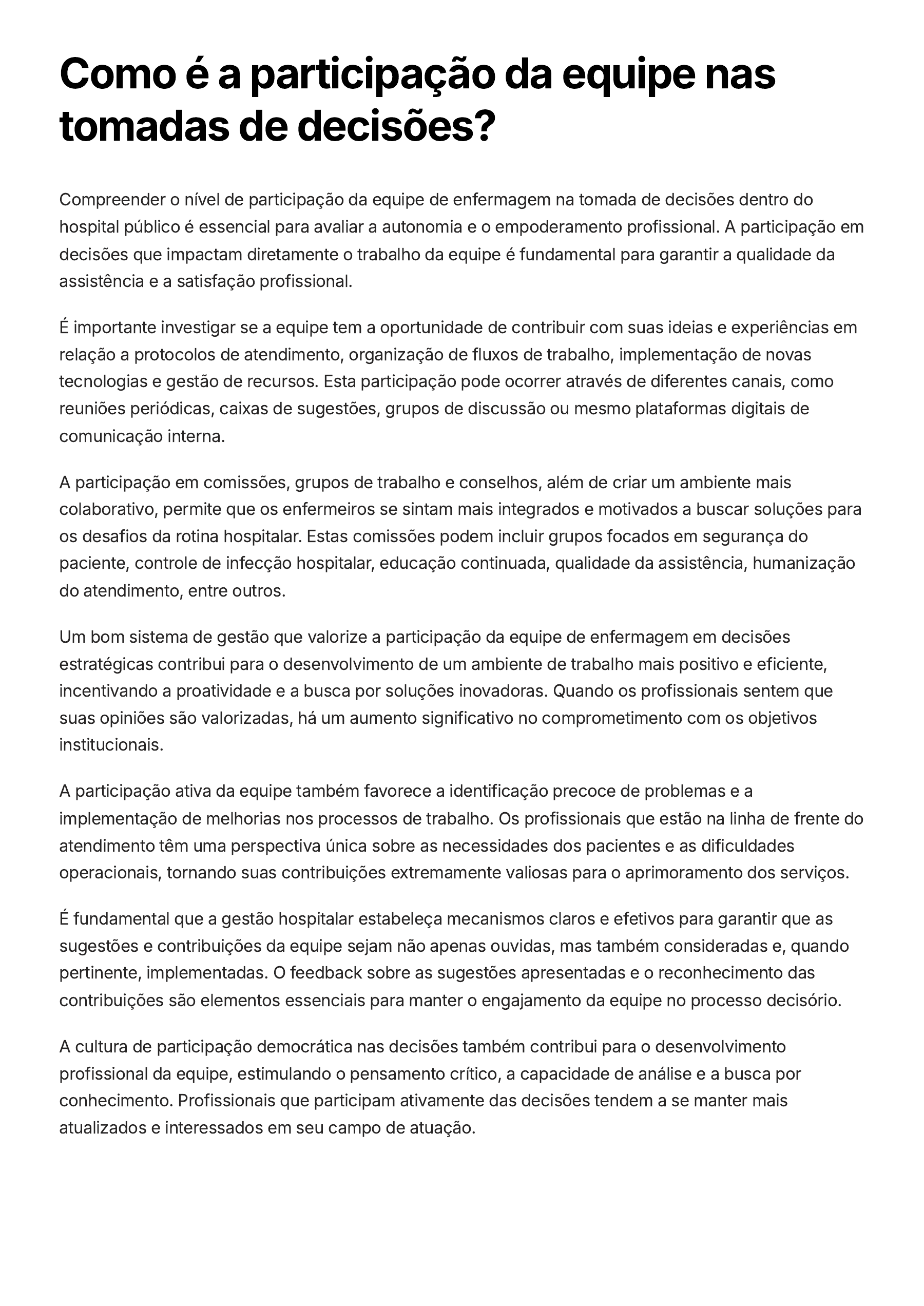Como é a participação da equipe nas tomadas de decisões? Compreender o nível de participação da equipe de enfermagem na tomada de decisões dentro do hospital público é essencial para avaliar a autonomia e o empoderamento profissional. A participação em decisões que impactam diretamente o trabalho da equipe é fundamental para garantir a qualidade da assistência e a satisfação profissional. É importante investigar se a equipe tem a oportunidade de contribuir com suas ideias e experiências em relação a protocolos de atendimento, organização de fluxos de trabalho, implementação de novas tecnologias e gestão de recursos. Esta participação pode ocorrer através de diferentes canais, como reuniões periódicas, caixas de sugestões, grupos de discussão ou mesmo plataformas digitais de comunicação interna. A participação em comissões, grupos de trabalho e conselhos, além de criar um ambiente mais colaborativo, permite que os enfermeiros se sintam mais integrados e motivados a buscar soluções para os desafios da rotina hospitalar. Estas comissões podem incluir grupos focados em segurança do paciente, controle de infecção hospitalar, educação continuada, qualidade da assistência, humanização do atendimento, entre outros. Um bom sistema de gestão que valorize a participação da equipe de enfermagem em decisões estratégicas contribui para o desenvolvimento de um ambiente de trabalho mais positivo e eficiente, incentivando a proatividade e a busca por soluções inovadoras. Quando os profissionais sentem que suas opiniões são valorizadas, há um aumento significativo no comprometimento com os objetivos institucionais. A participação ativa da equipe também favorece a identificação precoce de problemas e a implementação de melhorias nos processos de trabalho. Os profissionais que estão na linha de frente do atendimento têm uma perspectiva única sobre as necessidades dos pacientes e as dificuldades operacionais, tornando suas contribuições extremamente valiosas para o aprimoramento dos serviços. É fundamental que a gestão hospitalar estabeleça mecanismos claros e efetivos para garantir que as sugestões e contribuições da equipe sejam não apenas ouvidas, mas também consideradas e, quando pertinente, implementadas. O feedback sobre as sugestões apresentadas e o reconhecimento das contribuições são elementos essenciais para manter o engajamento da equipe no processo decisório. A cultura de participação democrática nas decisões também contribui para o desenvolvimento profissional da equipe, estimulando o pensamento crítico, a capacidade de análise e a busca por conhecimento. Profissionais que participam ativamente das decisões tendem a se manter mais atualizados e interessados em seu campo de atuação.