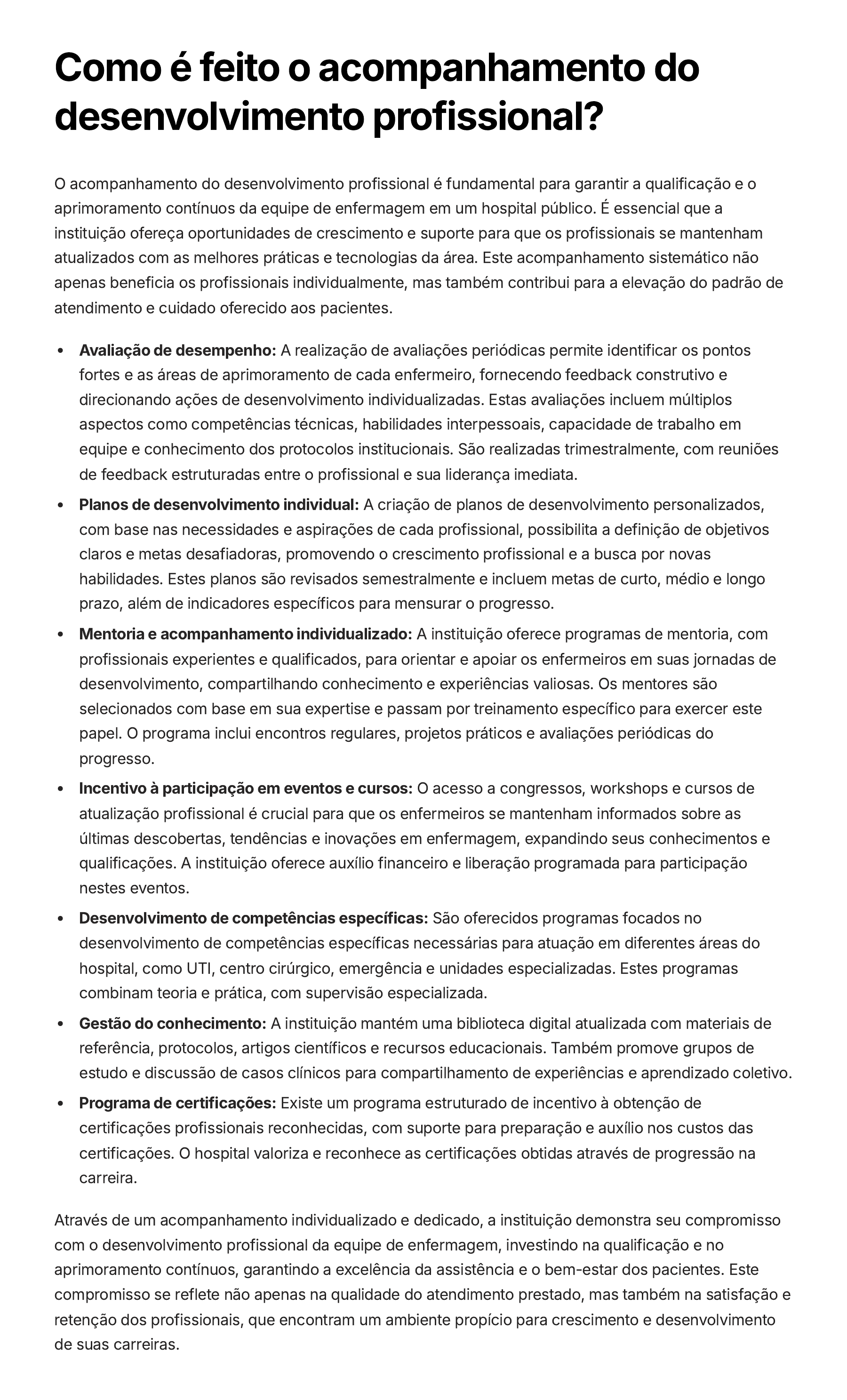 Como é feito o acompanhamento do desenvolvimento profissional? O acompanhamento do desenvolvimento profissional é fundamental para garantir a qualificação e o aprimoramento contínuos da equipe de enfermagem em um hospital público. É essencial que a instituição ofereça oportunidades de crescimento e suporte para que os profissionais se mantenham atualizados com as melhores práticas e tecnologias da área. Este acompanhamento sistemático não apenas beneficia os profissionais individualmente, mas também contribui para a elevação do padrão de atendimento e cuidado oferecido aos pacientes. Avaliação de desempenho: A realização de avaliações periódicas permite identificar os pontos fortes e as áreas de aprimoramento de cada enfermeiro, fornecendo feedback construtivo e direcionando ações de desenvolvimento individualizadas. Estas avaliações incluem múltiplos aspectos como competências técnicas, habilidades interpessoais, capacidade de trabalho em equipe e conhecimento dos protocolos institucionais. São realizadas trimestralmente, com reuniões de feedback estruturadas entre o profissional e sua liderança imediata. Planos de desenvolvimento individual: A criação de planos de desenvolvimento personalizados, com base nas necessidades e aspirações de cada profissional, possibilita a definição de objetivos claros e metas desafiadoras, promovendo o crescimento profissional e a busca por novas habilidades. Estes planos são revisados semestralmente e incluem metas de curto, médio e longo prazo, além de indicadores específicos para mensurar o progresso. Mentoria e acompanhamento individualizado: A instituição oferece programas de mentoria, com profissionais experientes e qualificados, para orientar e apoiar os enfermeiros em suas jornadas de desenvolvimento, compartilhando conhecimento e experiências valiosas. Os mentores são selecionados com base em sua expertise e passam por treinamento específico para exercer este papel. O programa inclui encontros regulares, projetos práticos e avaliações periódicas do progresso. Incentivo à participação em eventos e cursos: O acesso a congressos, workshops e cursos de atualização profissional é crucial para que os enfermeiros se mantenham informados sobre as últimas descobertas, tendências e inovações em enfermagem, expandindo seus conhecimentos e qualificações. A instituição oferece auxílio financeiro e liberação programada para participação nestes eventos. Desenvolvimento de competências específicas: São oferecidos programas focados no desenvolvimento de competências específicas necessárias para atuação em diferentes áreas do hospital, como UTI, centro cirúrgico, emergência e unidades especializadas. Estes programas combinam teoria e prática, com supervisão especializada. Gestão do conhecimento: A instituição mantém uma biblioteca digital atualizada com materiais de referência, protocolos, artigos científicos e recursos educacionais. Também promove grupos de estudo e discussão de casos clínicos para compartilhamento de experiências e aprendizado coletivo. Programa de certificações: Existe um programa estruturado de incentivo à obtenção de certificações profissionais reconhecidas, com suporte para preparação e auxílio nos custos das certificações. O hospital valoriza e reconhece as certificações obtidas através de progressão na carreira. Através de um acompanhamento individualizado e dedicado, a instituição demonstra seu compromisso com o desenvolvimento profissional da equipe de enfermagem, investindo na qualificação e no aprimoramento contínuos, garantindo a excelência da assistência e o bem-estar dos pacientes. Este compromisso se reflete não apenas na qualidade do atendimento prestado, mas também na satisfação e retenção dos profissionais, que encontram um ambiente propício para crescimento e desenvolvimento de suas carreiras.