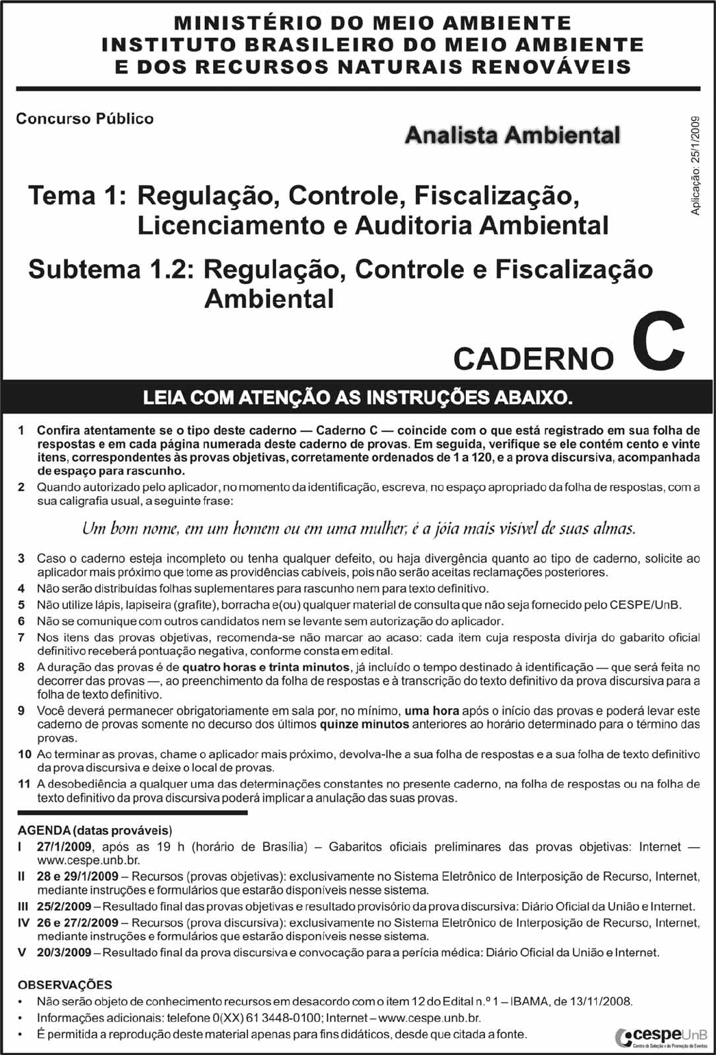 UnB/CESPE – IBAMA Caderno C Tema 1 – Subtema 1.2: Regulação, Controle e Fiscalização Ambiental – 1 – • De acordo com o comando a que cada um dos itens de 1 a 120 se refira, marque, na folha de respostas, para cada item: o campo designado com o código C, caso julgue o item CERTO; ou o campo designado com o código E, caso julgue o item ERRADO. A ausência de marcação ou a marcação de ambos os campos não serão apenadas, ou seja, não receberão pontuação negativa. Para as devidas marcações, use a folha de respostas, único documento válido para a correção das suas provas. • Nos itens que avaliam Conhecimentos de Informática, a menos que seja explicitamente informado o contrário, considere que: todos os programas mencionados estão em configuração-padrão, em português; o mouse está configurado para pessoas destras; expressões como clicar, clique simples e clique duplo referem-se a cliques com o botão esquerdo do mouse; teclar corresponde à operação de pressionar uma tecla e, rapidamente, liberá-la, acionando-a apenas uma vez. Considere também que não há restrições de proteção, de funcionamento e de uso em relação aos programas, arquivos, diretórios, recursos e equipamentos mencionados. CONHECIMENTOS BÁSICOS E COMPLEMENTARES Texto para os itens de 1 a 20 Reparação duas décadas depois Francisco Alves Mendes Filho ainda não era um mito da luta contra a devastação da Amazônia quando foi preso, em1 1981, acusado de subversão e incitamento à luta de classes no Acre, em plena ditadura militar. Chico Mendes se tornaria mundialmente conhecido, dali para a frente, por comandar uma campanha contra a ação de grileiros e latifundiários, responsáveis pela destruição da floresta e pela escravização do caboclo amazônico. Por isso mesmo foi assassinado, em 22 de dezembro de4 1988, na porta de casa, em Xapuri. O crime, cometido por uma dupla de fazendeiros, foi punido com uma sentença de 19 anos de cadeia para cada um. Faltava reparar a injustiça cometida pelos militares. E ela veio na quarta-feira 10, no palco do Teatro Plácido de Castro, em Rio Branco, na forma de uma portaria assinada7 pelo ministro da Justiça, Tarso Genro. Antes, porém, realizou-se uma sessão de julgamento da Comissão de Anistia, cujo resultado foi o reconhecimento, por unanimidade, da perseguição política sofrida por Chico Mendes no início dos anos 80 do século passado. A viúva do líder seringueiro, Izalmar Gadelha Mendes, vai receber uma pensão vitalícia de 3 mil reais mensais, além10 de indenização de 337,8 mil reais. Após assinar a portaria de anistia, Tarso Genro declarou que o assassinato de Chico Mendes está diretamente associado à perseguição sofrida pelo seringueiro durante a ditadura. “O Estado brasileiro não soube compreender o que ele (Mendes)13 representava naquele momento”, disse o ministro. “O Brasil pede perdão a Chico Mendes”, afirmou, ao assinar o documento. Acompanhada de dois filhos, Izalmar Mendes mostrou-se satisfeita com o resultado do julgamento. “Era a hora de limpar o nome do meu marido. Mais importante do que a indenização foi o pedido de desculpas feito pelo Estado”, disse a viúva.16 O caso de Chico Mendes foi relatado pela conselheira Sueli Bellato. Emocionada, ela disse ter lido muito sobre o seringueiro morto para, então, encadear os argumentos que a fizeram acatar o pedido de reconhecimento e indenização interposto por Izalmar Mendes. Chico Mendes foi vereador em Xapuri, onde nasceu, e se firmou como crítico de projetos governamentais19 de graves consequências ambientais, como a construção de estradas na região amazônica. No relatório, aprovado por unanimidade, a conselheira contou detalhes da vida de Chico Mendes, da infância pobre nos seringais ao dia em que foi assassinado. Segundo Sueli Bellato, a atuação de Mendes contra grileiros e latifundiários rendeu,22 durante a ditadura, um arquivo de 71 páginas redigidas por agentes do antigo Serviço Nacional de Informações (SNI). Foi por participar de um ato público, em 1980, que Chico Mendes passou a ser fichado e perseguido pelos militares. Em Rio Branco, o seringueiro fez um discurso exaltado contra a violência no campo provocada pelos fazendeiros.25 Na época, Chico Mendes foi enquadrado na Lei de Segurança Nacional, acusado de “atentado contra a paz, a prosperidade e a harmonia entre as classes sociais”. Preso em diversas ocasiões, só foi definitivamente absolvido em 1.º de março de 1984, quatro anos depois, portanto, de iniciadas as perseguições. De acordo com a conselheira Sueli Bellato, embora o relatório28 não tenha se aprofundado na questão, foi possível constatar que Chico Mendes também foi torturado enquanto estava sob custódia de policiais federais. Leandro Fortes. Internet: (com adaptações). A partir da leitura do texto acima, julgue os itens a seguir. 1 De acordo com o texto, é correto afirmar que a família de Chico Mendes será indenizada porque o seringueiro não sofreu perseguição política. 2 Conforme se depreende do texto, o ministro da Justiça não constata nenhuma relação entre a perseguição política sofrida por Chico Mendes durante a ditadura e o seu assassinato por fazendeiros em 1988. 3 A indenização à família de Chico Mendes foi aprovada em votação cujo resultado não evidenciou discordâncias entre os membros da Comissão de Anistia. 4 Segundo o texto, a relatora construiu seu parecer citando fatos ocorridos unicamente no período em que Chico Mendes foi perseguido pela ditadura militar. 5 O enquadramento de Chico Mendes na Lei de Segurança Nacional, citado pelo texto, evidencia a preocupação do governo militar com a militância política do líder dos seringueiros. UnB/CESPE – IBAMA Caderno C Tema 1 – Subtema 1.2: Regulação, Controle e Fiscalização Ambiental – 2 – Considerando aspectos linguísticos do texto Reparação duas décadas depois, julgue os i