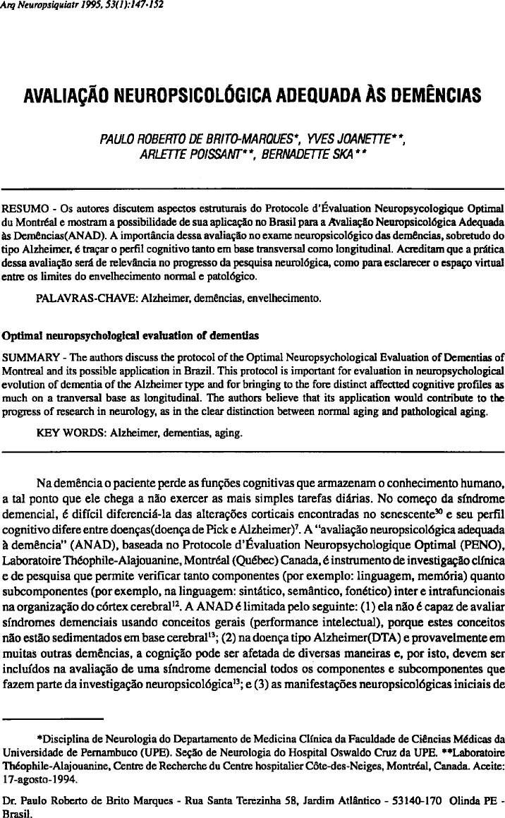 AVALIAÇÃO NEUROPSICOLÓGICA ADEQUADA ÀS DEMÊNCIAS PAULO ROBERTO DE BRITO-MARQUES*, YVES JOANETTE* *, ARLETTE POISSANT* *, BERNADETTE SKA * * RESUMO - Os autores discutem aspectos estruturais do Protocole d'Évaluation Neuropsycologique Optimal du Montreal e mostram a possibilidade de sua aplicação no Brasil para a Avaliação Neuropsicológica Adequada às Demências(ANAD). A importância dessa avaliação no exame neuropsicológico das demências, sobretudo do tipo Alzheimer, é traçar o perfil cognitivo tanto em base transversal como longitudinal. Acreditam que a prática dessa avaliação será de relevância no progresso da pesquisa neurológica, como para esclarecer o espaço virtual entre os limites do envelhecimento normal e patológico. PALAVRAS-CHAVE: Alzheimer, demências, envelhecimento. Optimal neuropsychological evaluation of dementias SUMMARY - The authors discuss the protocol of the Optimal Neuropsychological Evaluation of Dementias of Montreal and its possible application in Brazil. This protocol is important for evaluation in neuropsychological evolution of dementia of the Alzheimer type and for bringing to the fore distinct affectted cognitive profiles as much on a tranversal base as longitudinal. The authors believe that its application would contribute to the progress of research in neurology, as in the clear distinction between normal aging and pathological aging. KEY WORDS: Alzheimer, dementias, aging. Na demencia o paciente perde as funções cognitivas que armazenam o conhecimento humano, a tal ponto que ele chega a não exercer as mais simples tarefas diárias. No começo da síndrome demencial, é difícil diferenciá-la das alterações corticais encontradas no senescente30 e seu perfil cognitivo difere entre doenças(doença de Pick e Alzheimer)7. A "avaliação neuropsicológica adequada à demência" (ANAD), baseada no Protocole d'Évaluation Neuropsychologique Optimal (PENO), Laboratoire Théophile-Alajouanine, Montreal (Québec) Canada, é instrumento de investigação clínica e de pesquisa que permite verificar tanto componentes (por exemplo: linguagem, memória) quanto subcomponentes (por exemplo, na linguagem: sintático, semântico, fonético) inter e intrafuncionais na organização do córtex cerebral12. A ANAD é limitada pelo seguinte: (1) ela não é capaz de avaliar síndromes demenciais usando conceitos gerais (performance intelectual), porque estes conceitos não estão sedimentados em base cerebral13; (2) na doença tipo Alzheimer(DTA) e provavelmente em muitas outras demencias, a cognição pode ser afetada de diversas maneiras e, por isto, devem ser incluídos na avaliação de uma síndrome demencial todos os componentes e subcomponentes que fazem parte da investigação neuropsicológica13; e (3) as manifestações neuropsicológicas iniciais de *Disciplina de Neurologia do Departamento de Medicina Clínica da Faculdade de Ciências Médicas da Universidade de Pernambuco (UPE). Seção de Neurologia do Hospital Oswaldo Cruz da UPE. **Laboratoire Théophile-Alajouanine, Centre de Recherche du Centre hospitalier Côte-des-Neiges, Montréal, Canada. Aceite: 17-agosto-1994. Dr. Paulo Roberto de Brito Marques - Rua Santa Terezinha 58, Jardim Atlântico - 53140-170 Olinda PE - Brasil. uma demência não têm sido qualitativamente diferentes das encontradas no idoso normal. Exemplifica- se este fato com o teste de organização visual de Hooper, que é sensível tanto para o senescente quanto para o demente em fase inicial. Esta falta de poder patognomônico das manifestações neuropsicológicas impede a identificação de marcadores cognitivos qualitativos, quer na demência geral quer em uma doença demencial específica, como a de Alzheimer13. O objeto deste estudo é mostrar e discutir o perfil da avaliação neuropsicológica adequada aos casos com suspeita de demência, estendendo-o e dispondo-o à clínica e, principalmente, à pesquisa. MÉTODO E MATERIAL MÉTODO É confrontada a sensibilidade da ANAD à do Mini Mental State Examination, introduzido por Folstein5 e modificado por Lee Teng e Chang Chui15. Estes dois últimos testes, de Folstein, não individualizam todos os subcomponentes cognitivos que, de maneira heterogênea, estão presentes na fase precoce da demência (principalmente por alterações de linguagem)22. A ANAD é constituída de 20 provas que permitem documentar, de modo mais específico, certos componentes e subcomponentes mais importantes da memória, da linguagem, das gnosias, das praxias e da atenção. Estas 20 provas correspondem a um total de 74 itens, em média de 3 a 4 por tarefa. Deve-se efetuar a ANAD em um período de até 3 horas. MATERIAL ANAD-MEMÓRIA: Ml,série de palavras; M2,memória lógica; M3,reprodução visual; M4,evocação facilitada e MS, memória a longo prazo. ANAD-LINGUAGEM: LI,compreensão de palavras; L2,denominação verbal; L3,fluência verbal e semântica; L4, capacidade discursiva; e LS.repetição e leitura de palavras. ANAD-GNOSIAS: Gl,discriminação visual; G2,emparelhamento semântico visual; G3,orientação de linhas; e G4, teste dos Sinos. ANAD-PRAXIAS: PI,pantomimas; P2,gestos arbitrários; P3,desenho figurativo e geométrico; e P4,cópia da figura de Rey. ANAD-FUNÇÕES EXECUTIVAS: El,teste de Stroop; e E2,torre de Londres. RESULTADOS Avaliação da memória imediata foi feita por série de palavras, que foi usada no lugar de dígitos, porque: (a) existe forte correlação entre palavra e dígitos seriados; e (b) a série de palavras foi usada como recurso na tarefa M4 (evocação facilitada), ajustando a capacidade de memória a cada pessoa de acordo com a sua própria série. O teste de memória lógica avaliou a capacidade de memória imediata através de material verbal. A cotação foi feita por 5 medidas, que julgam tanto a performance quanto os erros. A prova de reprodução visual também foi tirada da escala clínica de memória de Weschsler. Ela permitiu ava