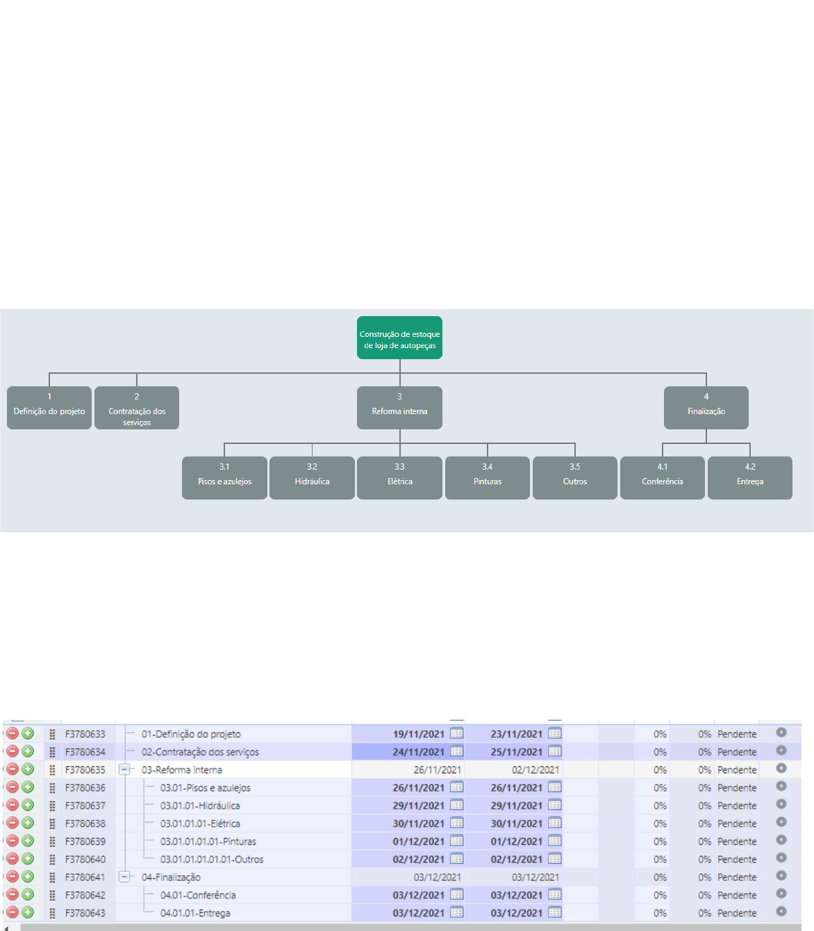 Planejamento do Projeto De acordo com o PMBOK®, o planejamento é a segunda fase a ser realizada em um gerenciamento de projetos. Porém, deve-se estar claro que essa é uma etapa contínua que deve ser realizada também durante a execução do projeto.Nosso projeto consiste na edificação de um epaço que terá como propósito estocar peças de uma loja de autopeças especializada de carros. Escopo Atualmente, o cliente dispõe de uma sala básica, sem capacidade apropriada para armazenar as mercadorias, capaz apenas de comportar 2 dias úteis de produtos para reposição. Desta forma, a fim de amortecer os preços de venda, e solucionar problemas como a escassez de produtos, e a instabilidade do mercado, onde o valor das mercadorias variam bastante devido, principalmente, ao aumento do frete cobrado pelas distribuidoras e ao aumento dos insumos para a produção dos produtos. Abaixo o conograma do escopo estabelecido: Tempo(Cronograma) Uma vez definida o escopo do projeto agora iremos definir o tempo de cada atividade de acordo com os pacotes de trabalho desmostrados no escopo passível de alteração durante o andamento do projeto: Custos -Custos estimados para todo o projeto que nosso financeiro calculou: -Custos diretos, mão de obra diretas – R$2574,00 -Mestre de obra – R$413,45 -Dois pedreiros e dois ajundantes – 649,99 - 3 sacos de cimentos 50 kg – 89,67 -Assoalhos de madeira – 6000,00 -4 patreleiras – 2159,60 -Tintas – 374,90 -Porta com trava de segurança – 3000,00 -Material rede elétrica – 2500,00 -Custos inderetos(passagem dos colaboradores da obra) – 534,60 Custos total estimado: 18396,21 Riscos Estratégias para riscos negativos ou ameaças: Eliminar: Alterar o plano do projeto para eliminar totalmnte o risco, protegendo os objetivos do projeto dos impactos deste risco eliminado. exemplo: Transferir a festa do campo para um salão coberto, eliminando o risco de chuva ou mal tempo. Transferir: Transferir o risco para um terceiro, transferindo os impactos e a responsabilidade. É preciso ter em mente que o risco não é eliminado, e quase sempre envolve o pagamento de prêmios a parte que está assumindo o risco. exemplo: Contratação de um seguro de carro ou residência. Mitigar: Reduzir a probabilidade ou impacto de um risco até um nível aceitável. exemplo: Ir ao banco sacar 100 mil reais no caixa eletrônico, acompanhado de seguranças fortemente armados e sair de lá em um carro blindado. Aceitar: Quando não é possível aplicar nenhuma das outras estratégias, e a equipe do projeto decide correr o risco. Nossa Empresa o seviço de seguro de obras como resposta ao risco de acidentes que possam ocorrer durante a exceção do serviço. Como plano de contingência em relação a atrasos de entrega de materiais, sempre realizamos cotação com mais de um fornecedor, então se um atrasar a a entrega temos a opação de aciona outro fornecedor para realizar a tarefa. Qualidade Gerenciar a qualidade do projeto requer um plano de qualidade aprovado englobando os principais processos de qualidade definidos abaixo. O plano de qualidade é desenvolvido e aprovado durante a fase de planejamento do projeto para confirmar requisitos e padrões da qualidade aplicáveis ao projeto e as suas entregas e gerenciar os processos de projeto. Recursos Humanos A equipe é composta por pessoas com funções e responsabilidades atribuídas com foco no término do projeto: -ADM da nossa empresa e do cliente -Gerente do projeto -Equipe de engenharia - Designer do projeto -Mestre de obras -Pedreiros e seus auxiliares Comunicações Geralmente a comunicação nos projetos é impactada por fatores ambientais e aspectos organizacionais. No primeiro caso, podemos ressaltar a estrutura e a cultura organizacional, normas e padrões governamentais ou da indústria que devem ser seguidos, a infraestrutura e os recursos humanos fornecidos para o projeto, entre outras questões internas e externas que o influenciam de alguma forma no que diz respeito ao local em que é realizado. As políticas, os procedimentos e os processos organizacionais também devem ser levados em conta para a construção do plano de comunicação — em especial os requisitos para se comunicar ditados pela empresa, as tecnologias disponibilizadas, as normas para qualidade e de segurança da informação, além dos procedimentos específicos para lidar com os dados financeiros. Além disso, também é indispensável considerar os processos e as tecnologias utilizadas para armazenar e recuperar as informações corporativas. Aqui podemos incluir os sistemas de arquivos dos projetos (em papel ou eletrônicos), bancos de dados, lições aprendidas e referências sobre os projetos anteriores. Nossa empre aplica o plano de comunicação no formato abaixo: Veículo Publico-alvo Frequência Conteúdo Forma Responsável Reunião semanal de avaliação Mestre de obras, diretor de operações do cliente Equipe de obra Semanal a partir do dia 19/11 Situação atual, Decisões urgentes próximos passos Reunião de 1h no canteiro de obras com ata registrada por e-mail Diretor de Engenharia e mestre de obras Sistema ERP Nossa empresa também oferece serviços de consultoria, com foco na otimização dos resultados das organizações por meio da melhoria dos processos de negócio.Nesse serviço priorizamos unir a gestão de negócios com a Tecnologia da Informação. O cliente não possui nenhum sistema que agregue flexibilidade e controle e com esse novo setor contruído; setor de estoque, será muito importante ter um sistema que auxilie no gerenciamento desse setor e todas as unidades organizacionais da empresa. O cliente contratou nosso serviço de consultoria e como possuímos convênio com a Sênior iremos implementar esse sistema na empresa. Abaixo demostramos os recursos que sistema irá proporcionar na gestão de negócio do cliente para o setor de estoque: Sistema para Controle de Estoque – ERP Sênior A soluç