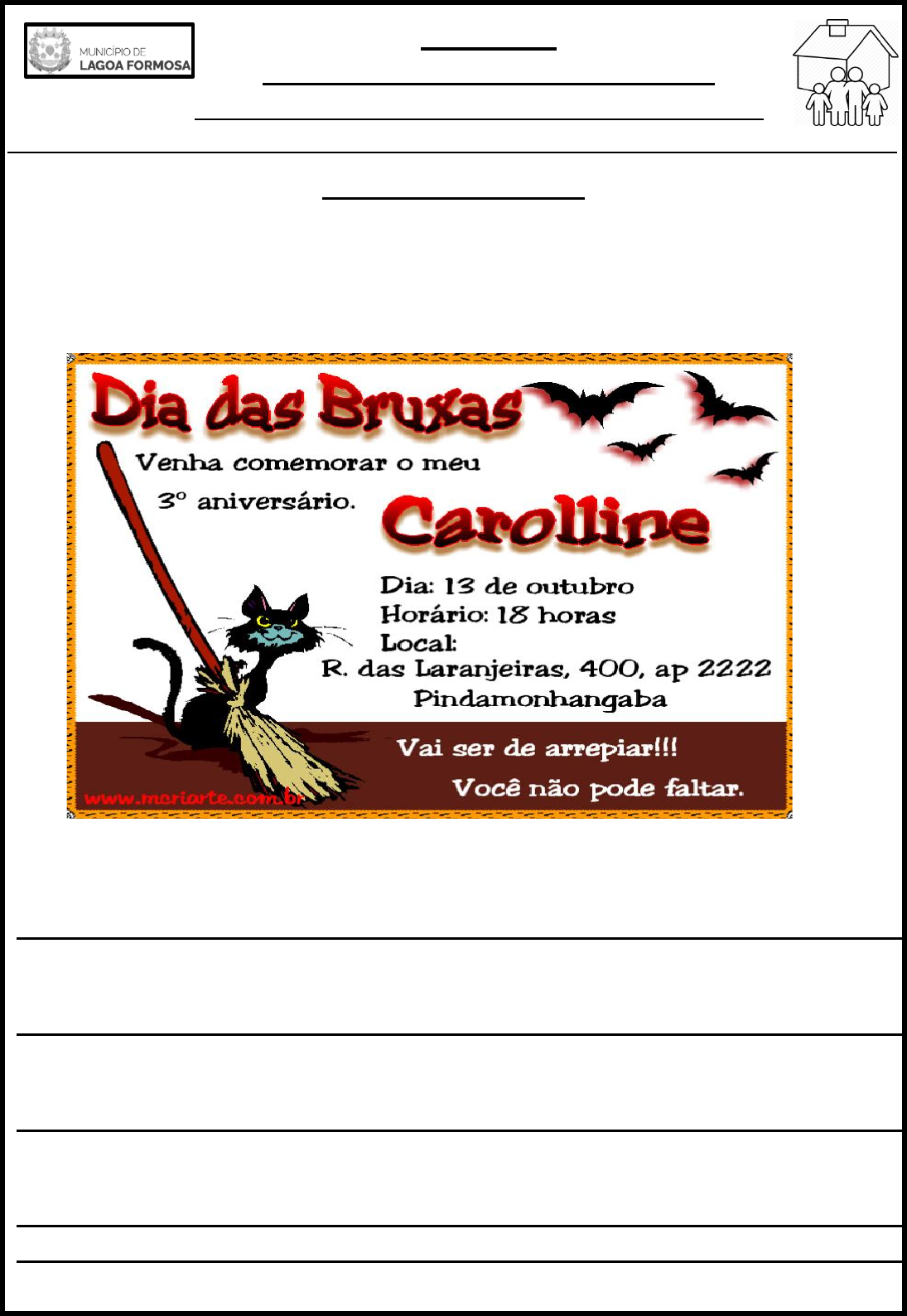PROJETO: “EM CASA TAMBÉM SE APRENDE” PORTUGUÊS -2º ANO DO ENSINO FUNDAMENTAL _____________________________________________________________________________ ATIVIDADE 66: 04 / 08/2020 ALUNO (A):(NOME COMPLETO)___________________________________________________________ _______________________________________________________________________________________ 1) LEIA O TEXTO ABAIXO: 2)RESPONDA ÀS QUESTÕES: A) QUE GÊNERO TEXTUAL É ESSE? B) PARA QUE SERVE UM CONVITE? C) ESSE É UM CONVITE PARA QUÊ? D) PORQUE VOCÊ ACHA QUE O TÍTULO DO CONVITE É “DIA DAS BRUXAS”? PRÁTICA DA ESCRITA 1) O QUE VOCÊ VÊ NO CONVITE? ( ) NÚMEROS ( )DESENHOS ( ) LETRAS ( ) PALAVRAS _____________________________________________________________________ 2) QUEM É A ANIVERSARIANTE? ( ) CAROLLINE ( ) CAMILA ( ) CAROL _____________________________________________________________________ 3) COMO SE ESCREVE O NOME DA ANIVERSARIANTE? ( ) CAROLINE ( ) CARROLLINE ( ) CAROLLINE _____________________________________________________________________ 4) QUANTAS LETRAS TEM O NOME DA CAROLLINE? ( ) 8 ( ) 7 ( ) 9 ( ) 10 ____________________________________________________________________ 5) QUAL É A LETRA QUE SE REPETE? ( ) A ( ) L ( ) N ( ) E 6) QUAIS SÃO AS CONSOANTES QUE FAZEM PARTE DESSA PALAVRA? ( ) CROLN ( ) CRLN ( ) OAIE _____________________________________________________________________ 7) PORQUE O TÍTULO DO CONVITE É “DIA DAS BRUXAS”? ( ) PORQUE SERÁ COMEMORADO O DIA DAS BRUXAS. ( ) PORQUE OS CONVIDADOS DEVERÃO IR VESTIDOS DE BRUXA. ( ) PORQUE O TEMA DO ANIVERSÁRIO SERÁ “DIA DAS BRUXAS”. 8) QUE DIA SERÁ COMEMORADO O ANIVERSÁRIO DE CAROLLINE? ( ) 18 DE OUTUBRO ( ) 13 DE OUTUBRO PROJETO: “EM CASA TAMBÉM SE APRENDE” PORTUGUÊS -2º ANO DO ENSINO FUNDAMENTAL _____________________________________________________________________________ ATIVIDADE 67:05 / 08 /2020 ALUNO (A):(NOME COMPLETO)___________________________________________________________ _______________________________________________________________________________________ 1) OBSERVE A IMAGEM: 2) FAÇA O QUE SE PEDE: A) ENCONTRE A LUVA E PINTE-A DE LISTRADO: AZUL E AMARELO. B) DESENHEESTRELAS LARANJA NO CARRINHO DE BEBÊ. C) FAÇA UM CÍRCULO ROXO NO URSO. D) MARQUE O BERÇO COM “X”. E) PINTE A BALEIA DE CINZA E DESENHE ÁGUA AO REDOR DELA. F) PINTE A BICICLETA DE VERMELHO. G) PINTE O CARRO DE VERDE. H) DESENHE UMA CRIANÇA DENTRO DO BARCO. I) DESENHE BOLINHAS NO VESTIDO. J) PINTE A BONECA USANDO MUITAS CORES. PROJETO: “EM CASA TAMBÉM SE APRENDE” PORTUGUÊS -2º ANO DO ENSINO FUNDAMENTAL _____________________________________________________________________________ ATIVIDADE 68: 06 / 08 /2020 ALUNO (A):(NOME COMPLETO)___________________________________________________________ _______________________________________________________________________________________ LISTA DE COMPRAS UMA LISTA DE COMPRAS É ELABORADA COM A FINALIDADE DE REGISTRAR OS ITENS QUE VOCÊ IRÁ COMPRAR. É UM RECURSO UTILIZADO PARA ORGANIZAÇÃO DA CASA, AJUDA A ECONOMIZAR TEMPO E AUXILIA NO CONTROLEDAS DESPEZAS DE UMA FAMÍLIA. 1) VEJA ALGUNS EXEMPLOS DE LISTAS DE COMPRAS: AGORA É SUA VEZ! 1)CLARINHA VAI À FEIRA PARA COMPRAR FRUTAS. AJUDE-A FAZENDO UMA LISTA PARA QUE ELA NÃO SE ESQUEÇA DE NADA. QUANTIDADE NOME DA FRUTA 2) PARA QUE SERVE UMA LISTA DE COMPRAS? _____________________________________________________________________ _____________________________________________________________________ 3) FAÇA SUA LISTA DE COMPRAS, SEPARANDO OS PRODUTOS ABAIXO: MAÇÂ – SABONETE-ARROZ – SABÃO EM PÓ – BATATA – LÁPIS – ESPONJA- CREME DENTAL – RÉGUA – PÃO – BORRACHA – PAPEL HIGIÊNICO – CANETA – CARNE – CADERNO- FEIJÃO – COLA – MAMÃO – AMACIANTE- APONTADOR- FRANGO – TINTA GUACHE- ÁGUA SANITÁRIA- ÁLCOOL – BANANA – PINCEL – BISCOITOS – DETERGENTE- FARINHA- SABÃO DE COCO – SHAMPOO – TAPIOCA. ALIMENTOS MATERIAL DE LIMPEZA MATERIAL ESCOLAR PROJETO: “EM CASA TAMBÉM SE APRENDE” PORTUGUÊS -2º ANO DO ENSINO FUNDAMENTAL _____________________________________________________________________________ ATIVIDADE 69 :07 /08/2020 ALUNO (A):(NOME COMPLETO)___________________________________________________________ _______________________________________________________________________________________ 1)CONVITE DE ANIVERSÁRIO 2) AGORA COMPLETE O CONVITE DE ANIVERSÁRIO: PROJETO: “EM CASA TAMBÉM SE APRENDE” PORTUGUÊS -2º ANO DO ENSINO FUNDAMENTAL _____________________________________________________________________________ ATIVIDADE 70 :10 /08/2020 ALUNO (A):(NOME COMPLETO)___________________________________________________________ _______________________________________________________________________________________ 1) LEIA COM ATENÇÃO: A SEMENTINHA ERA UMA VEZ UMA SEMENTINHA, TÃO PEQUENININHA, TÃO SIMPLESINHA... QUE COM CARINHO FOI BEM PLANTADA E COM AMOR ERA BEM CUIDADA. E DE REPENTE O QUE ACONTECEU? UMA PLANTINHA DE LÁ NASCEU. UMA BELA ÁRVORE VAI SE TORNAR. JUNTO CONOSCO, HÁ DE CRESCER. E BONS AMIGOS NÓS VAMOS SER! 2) OBSERVE A PLANTA ABAIXO E NUMERE SUAS PARTES. AGORA, PINTE BEM BONITO! 3) PROJETO: “EM CASA TAMBÉM SE APRENDE” MATEMÁTICA -2º ANO DO ENSINO FUNDAMENTAL _____________________________________________________________________________ ATIVIDADE 66:04 /08/2020 ALUNO (A):(NOME COMPLETO)___________________________________________________________ _______________________________________________________________________________________ PROJETO: “EM CASA TAMBÉM SE APRENDE” MATEMÁTICA -2º ANO DO ENSINO FUNDAMENTAL _____________________________________________________________________________ ATIVIDADE 67 : 05 / 08 /2020 ALUNO (A):(NOME COMPLETO)___________________________________________________________ _______________________________________________________________________________________ PROJETO: “EM CASA TAMBÉM SE APRENDE” MATEMÁTICA -2º ANO DO ENSINO FUNDAMENTAL _________