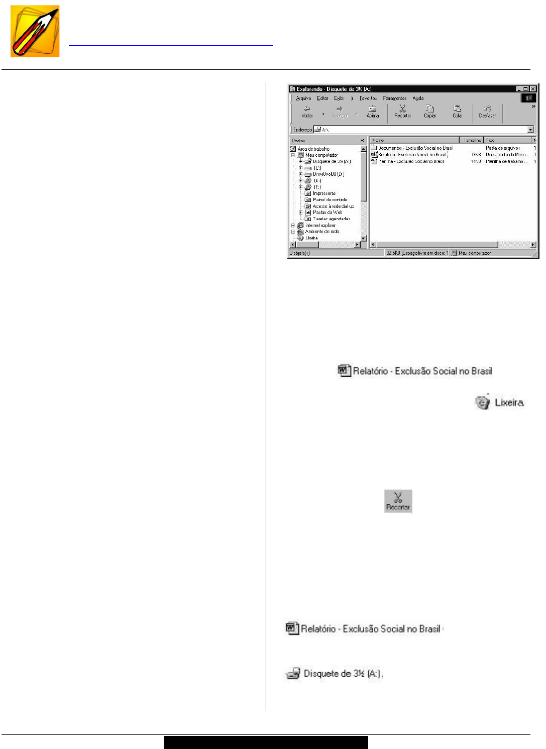 26 133 - CESPE - 2006 - CAIXA - TÉCNICO BANCÁRIO Nessa janela, existe funcionalidade que permite reordenar os arquivos listados em uma ordem que depende do tamanho do arquivo. ( ) Certo ( ) Errado 134 - CESPE - 2006 - CAIXA - TÉCNICO BANCÁRIO Considere que a janela Meus documentos do Windows XP esteja em execução e contenha informações acerca de uma lista de arquivos existentes da pasta Meus documentos. Com relação a essa janela e ao Windows XP, julgue os itens que se seguem. Nessa janela existe opção que permite iniciar uma ação que poderá levar à criação de uma nova pasta. ( ) Certo ( ) Errado 135 - CESPE - 2002 - BANCO DO BRASIL - ESCRITURÁRIO Utilizando o BB Crédito Informática, um indivíduo financiou R$ 3.000,00 para a aquisição de um microcomputador e, de acordo com as condições estabelecidas no texto IV, deverá quitar o débito em 24 parcelas mensais e postecipadas de R$ 190,76. Com base na situação hipotética acima e nas informações do texto IV, julgue os itens abaixo. A seguinte especificação para a aquisição do microcomputador seria atualmente possível: processador Intel Pentium 4 de 1,7 GHz, 512 MB de memória RAM, monitor de vídeo de 17 polegadas, HD de 40 GB, DVD/CDRW, placa fax/modem de 56 kbps, interface de rede local 10/100 Mbps, Windows XP Home Edition. ( ) Certo ( ) Errado 136 - CESPE - 2003 - BANCO DO BRASIL - ESCRITURÁRIO A figura acima mostra uma janela do Windows Explorer que está sendo executado em um computador cujo sistema operacional é o Windows 98. Com relação a essa figura, ao Windows 98 e a conceitos de hardware, julgue os itens seguintes. Caso se queira excluir o arquivo associado ao ícone , é suficiente arrastar esse ícone, pondo-o adequadamente sobre o ícone . Entretanto, se o disquete estiver protegido contra gravação, não será possível excluir esse arquivo. ( ) Certo ( ) Errado 137 - CESPE - 2003 - BANCO DO BRASIL - ESCRITURÁRIO Por meio do botão , é possível dividir um arquivo em dois ou mais arquivos menores, que podem ser salvos em dois ou mais disquetes diferentes. ( ) Certo ( ) Errado 138 - CESPE - 2003 - BANCO DO BRASIL - ESCRITURÁRIO O arquivo associado ao ícone ocupa, em espaço de memória do disquete inserido no drive correspondente ao ícone , mais de 19 milhões de bytes. ( ) Certo ( ) Errado