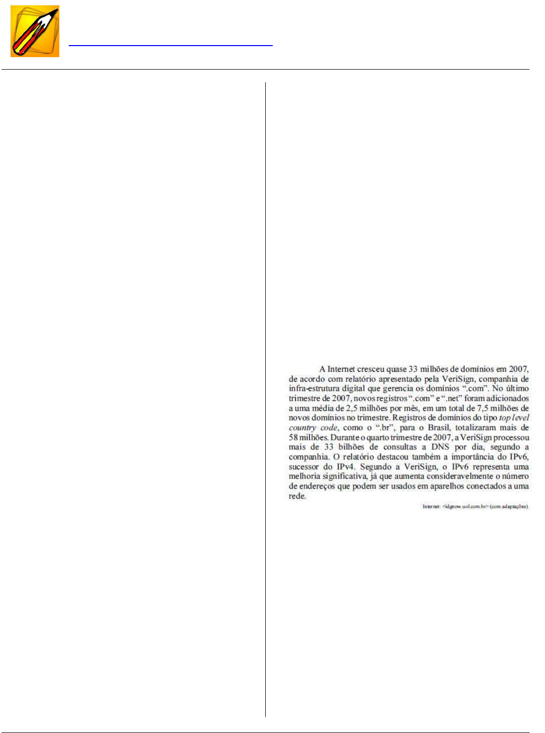 33 Assinale a opção que apresenta um protocolo responsável pelo envio de mensagens eletrônicas na Internet. a) UDP b) POP3 c) SNMP d) SMTP e) RTP 163 - CESPE - 2010 - MS - TODOS OS CARGOS Acerca de conceitos de organização de arquivos e Internet, julgue os itens seguintes. Firewall é o mecanismo usado em redes de computadores para controlar e autorizar o tráfego de informações, por meio do uso de filtros que são configurados de acordo com as políticas de segurança estabelecidas. ( ) Certo ( ) Errado 164 - CESPE - 2010 - MPS - TÉCNICO EM COMUNICAÇÃO SOCIAL Julgue os itens que se seguem, referentes a Internet e intranet. Um servidor DNS (domain name service) permite identificar os endereços IP de usuários e servidores da Internet, por meio da associação de um conjunto de números com domínios. ( ) Certo ( ) Errado 165 - CESPE - 2008 - BANCO DO BRASIL - ESCRITURÁRIO Um dos fatores mais significativos no aumento das possibilidades de ataque na Internet é o crescimento global do acesso de banda larga. Com computadores conectados 24 horas à Internet por meio de acesso de banda larga, a oportunidade de atacar sistemas em tempo real e de utilizar a capacidade ociosa de máquinas contaminadas para outros ataques é um recurso tentador demais para ser ignorado. A expansão e a diversificação do papel dos computadores na sociedade moderna também propiciam mais oportunidades para aqueles que buscam capitalizar-se no cibercrime. O uso de telefones celulares, as operações bancárias online, os jogos online e o comércio eletrônico, em geral, são vetores e alvos suficientes para assegurar aos inescrupulosos o bastante com o que se ocupar. Internet: (com adaptações). Tendo o texto acima como referência inicial, julgue os itens subseqüentes. A expressão "banda larga", mencionada no texto, refere-se a recursos que permitem a um usuário acessar serviços da Internet com taxas de transmissão de informação superiores às obtidas em redes de acesso convencionais, tais como as redes de acesso denominadas dial-up. Taxas da ordem de 2 Mbps, em vez de 56 kbps, constituem exemplo da diferença de taxas obtidas em redes de acesso banda larga e dial-up, respectivamente. ( ) Certo ( ) Errado 166 - CESPE - 2008 - BANCO DO BRASIL - ESCRITURÁRIO - Tendo o texto acima como referência inicial, julgue os itens seguintes. O protocolo IPv6, mencionado no texto, é uma proposta que permite aumentar o número de endereços IP e, com isso, aumentar o número de novos sítios web. ( ) Certo ( ) Errado 167 - CESPE - 2010 - EMBASA - ANALISTA DE SANEAMENTO Acerca de conceitos de Internet e intranet, julgue os itens seguintes. Para especificar como o servidor deve enviar informações de páginas web para o cliente, a Internet utiliza o protocolo de comunicação HTTP