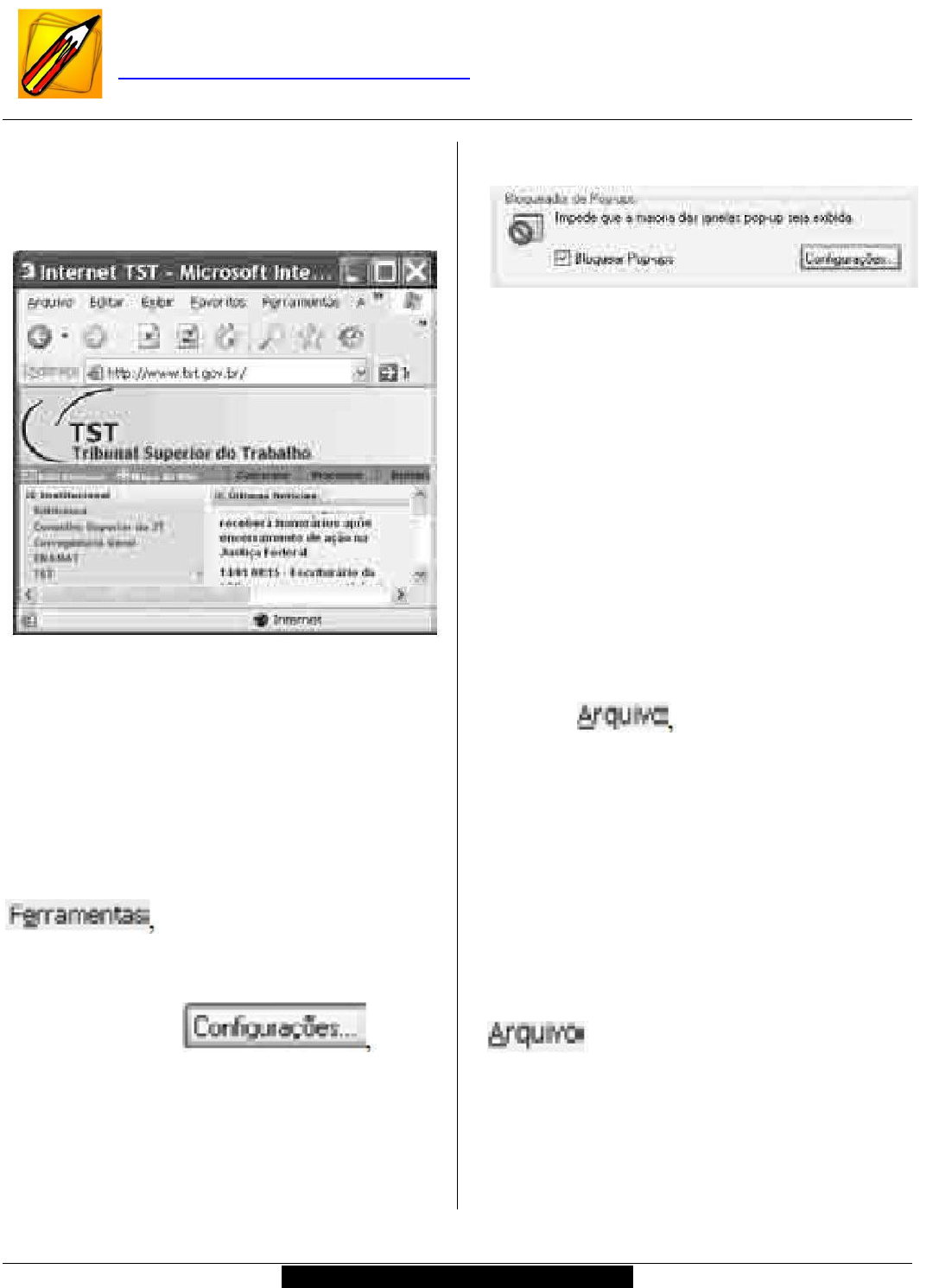 problema de segurança, o que impede a sua utilização em intranet. 214 - CESPE - 2008 - TST - ANALISTA JUDICIÁRIO A figura acima ilustra parte de uma página do sítio do TST, acessado por meio do Internet Explorer 6 (IE6), que está sendo executado em um computador cujo sistema operacional é o Windows XP. Considerando essa figura, julgue os itens a seguir acerca do IE6 e de conceitos de Internet e correio eletrônico. Na janela Opções da Internet, que pode ser executada a partir de opção do menu , é possível encontrar, em uma das guias dessa janela, a ferramenta ilustrada a seguir, que permite bloquear a exibição de pop- ups. Por meio de funcionalidades disponibilizadas ao se clicar o botão nessa ferramenta, podem-se especificar endereços de sítios para os quais é permitida a exibição de pop-ups. ( ) Certo ( ) Errado 215 - CESPE - 2008 - TST - ANALISTA JUDICIÁRIO As páginas que são visitadas na Internet em uma sessão de uso do IE6 podem ser armazenadas em uma pasta especial para exibição rápida em uma outra sessão de uso do IE6. O usuário não tem acesso aos arquivos armazenados nessa pasta, no entanto, é possível definir o tamanho do espaço em disco a ser usado de modo que, quando esse espaço for completamente ocupado, a referida pasta é automaticamente esvaziada. ( ) Certo ( ) Errado 216 - CESPE - 2008 - TST - ANALISTA JUDICIÁRIO No menu existe opção que permite enviar o endereço da página mostrada acima como link em uma mensagem de e-mail. Dessa forma, clicando esse link, o destinatário do e-mail poderá dar início a procedimento de acesso à referida página do TST. ( ) Certo ( ) Errado 217 - CESPE - 2008 - TST - ANALISTA JUDICIÁRIO O IE6 não permite a proteção do computador contra vírus de Internet, mas disponibiliza ferramenta inicializável por meio do menu que permite a proteção contra outros tipos de ameaças, incluindo as denominadas ferramentas de hacking, que, apesar de não serem vírus nem terem efeitos destrutivos, podem provocar danos. ( ) Certo ( ) Errado