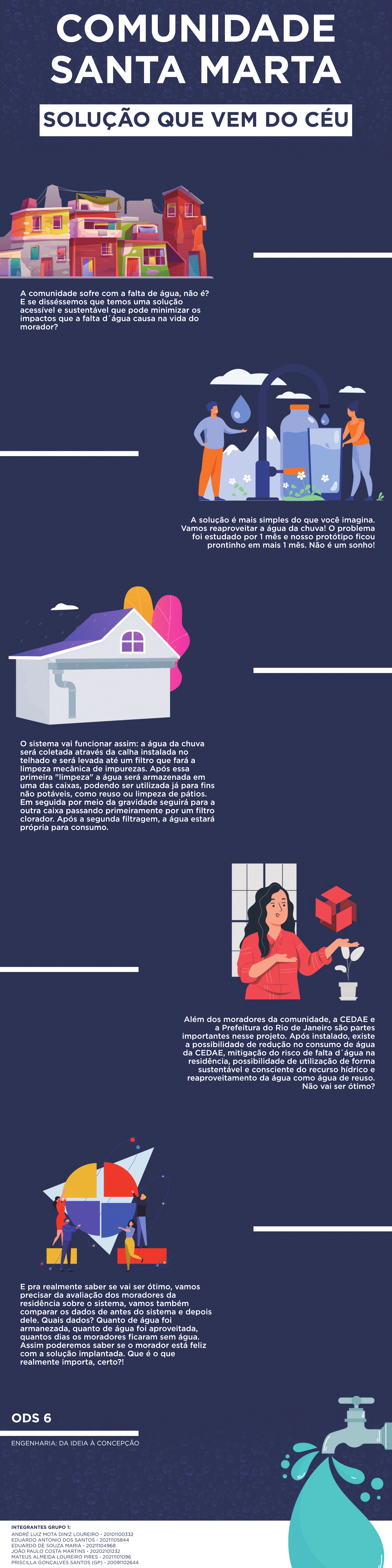 SOLUÇÃO QUE VEM DO CÉU A comunidade sofre com a falta de água, não é? E se disséssemos que temos uma solução acessível e sustentável que pode minimizar os impactos que a falta d́água causa na vida do morador? A solução é mais simples do que você imagina. Vamos reaproveitar a água da chuva! O problema foi estudado por 1 mês e nosso protótipo ficou prontinho em mais 1 mês. Não é um sonho! O sistema vai funcionar assim: a água da chuva será coletada através da calha instalada no telhado e será levada até um filtro que fará a limpeza mecânica de impurezas. Após essa primeira "limpeza" a água será armazenada em uma das caixas, podendo ser utilizada já para fins não potáveis, como reuso ou limpeza de pátios. Em seguida por meio da gEm seguida por meio da gravidade seguirá para a outra caixa passando primeiramente por um filtro clorador. Após a segunda filtragem, a água estará própria para consumo. Além dos moradores da comunidade, a CEDAE e a Prefeitura do Rio de Janeiro são partes importantes nesse projeto. Após instalado, existe a possibilidade de redução no consumo de água da CEDAE, mitigação do risco de falta d́água na residência, possibilidade de utilização de forma sustentável e consciente do recurso hídrico e reapreaproveitamento da água como água de reuso. Não vai ser ótimo? E pra realmente saber se vai ser ótimo, vamos precisar da avaliação dos moradores da residência sobre o sistema, vamos também comparar os dados de antes do sistema e depois dele. Quais dados? Quanto de água foi armanezada, quanto de água foi aproveitada, quantos dias os moradores ficaram sem água. AsAssim poderemos saber se o morador está feliz com a solução implantada. Que é o que realmente importa, certo?! ODS 6 ENGENHARIA: DA IDEIA À CONCEPÇÃO ANDRÉ LUIZ MOTA DINIZ LOUREIRO - 20101100332 EDUARDO ANTONIO DOS SANTOS - 20211105844 EDUARDO DE SOUZA MARIA - 20211104968 JOÃO PAULO COSTA MARTINS - 20202101232 MATEUS ALMEIDA LOUREIRO PIRES - 20211101096 PRISCILLA GONÇALVES SANTOS (GP) - 20091102644 INTEGRANTES GRUPO 1: COMUNIDADE SANTA MARTA