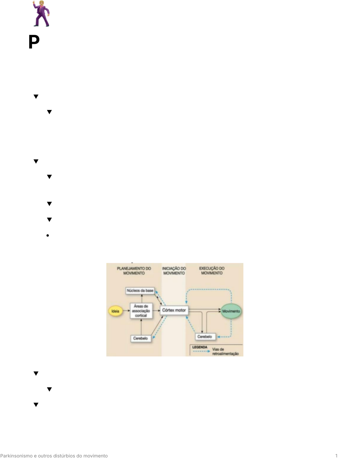 Parkinsonismo e outros distúrbios do movimento 1 � Parkinsonismo e outros distúrbios do movimento o que são distúrbios de movimento? grupo de condições neurológicas nas quais há redução dos movimentos - hipocinético Parkinsonismo), ou excesso de movimentos - hipercinéticos (coreias; miociclonias), não justificados por paresia ou espasticidade. como é dividido o movimento no SNC 3 fases)? planejamento do movimento → áreas corticais → apoio dos núcleos da base; iniciação do movimento: córtex motor; execução do movimento: cerebelo (faz controle de ‘ʼqualidadeʼʼ); núcleos da base, córtex motor e cerebelo trabalham juntos para realização do movimento. quais os principais transtornos hipercinéticos? tremor, distonia, abalos (tiques, mioclonias e estereotipias). quais os principais transtornos hipocinéticos? Parkinsonismo e outros distúrbios do movimento 2 Parkinsonismo → síndrome composta por sinais e sintomas: bradicinesia/hipocinesia/acinesia, rigidez muscular, freezing da marcha, instabilidade postural e tremor. outros Stiff person; catatonia. tipos de distúrbio de movimento como é caracterizada a síndrome parkinsoniana? caracterizada por bradicinesia (redução de amplitude e velocidade do movimento); tremor de repouso predominante; rigidez muscular (aumento do tônus muscular). o que é tremor e onde pode estar presente? é um movimento rítmico, regular, oscilatório que acomete uma ou mais partes do corpo → movimento repetitivo. cada frequência caracteriza um tipo de tremor → características variáveis dependendo do tipo de doença; pode estar presente no parkinsonismo; tremor essencial; doenças cerebelares. quais os 3 componentes básicos do tremor? Repouso → posição mais relaxada possível do membro (sinal de contar moedas); Postural → paciente assume postura de membro mais antigravitacional possível (estendendo braços para frente) - e isso desencadeia tremor; Cinético → deintenção/ação, tremor exacerbado, tremor de movimento, paciente se mexe e temos exacerbação do tremor. parkinsonismo que é a mesma coisa que síndrome parkinsoniana que não é mesma coisa que doença de Parkinson. o que caracteriza a síndrome parkinsoniana? bradicinesia (redução de amplitude e velocidade do movimento); tremor (movimento rítmico e regular), rigidez muscular (aumento tônus muscular); o que é importante saber sobre os tremores? se ocorre em repouso ou movimento, fatores desencadeantes, se tem algo que melhore o tremor. Parkinsonismo e outros distúrbios do movimento 3 o que é distonia? movimentos de co-contração da musculatura agonista e antagonista por determinado tempo, previsíveis, repetitivas, distonias focais (cervical; membros); distonias hereditárias DYT. Não consegue fazer movimento fica sempre contraído. o que é coreia? movimentos irregulares, involuntários, sem propósito, arrítmicos, rápidos, não sustentados, que mudam de um sítio para outro. movimentos que parecem dança, imprevisível quanto a duração, distribuição e direção; doença de Huntington (genética autossômica dominante), Coreia de Sydenhan (estreptocócica). o que são os tiques? abalos rápidos repentinos, estereotipados (se repelem e não tem propósito); suprimíveis por um tempo. Ex: Síndrome de Tourette (acomete paciente na infância e adolescência; pode perdurar pra vida adulta). o que é estereotipia ? movimentos coordenados, sem propósito, que se repetem continuamente e de maneira idêntica → mais complexos e lentos em relação aos tiques. ex: temos o transtorno do espectro autosta, síndromes que causam atraso no desenvolvimento psicomotor. o que é mioclonia? abalos súbitos, de curta duração, involuntários, arritmicos. semelhantes a um ‘ʼchoqueʼ ,̓ positivos ou negativos, crises epiléticas podem ter mioclonias, acontecem no sono. no início do sono → sente um ‘ʼchoqueʼʼ musculatura pula (comum). patológica → algumas síndromes epiléticas, síndromes de distúrbio de movimento. o que é ataxia? ocorre em síndrome cerebelar. Parkinsonismo e outros distúrbios do movimento 4 perda da coordenação motora fina; base alargada (paciente caminha com dificuldade - disbasia); disartria (dificuldade na articulação das palavras). paciente caminha como se estivesse etilizado. ex → ataxias espinocerebelares, causas genéticas ou secundárias AVC. O que são os transtornos de movimento funcionais? mimetizam os demais distúrbios do movimento, porém não orgânicos, relacionados a psique do paciente = psicogênico/funcional. fenomenologia do movimento ajuda a diferenciar. conjunto de sinais/ critérios diagnósticos da Síndrome Parkinsoniana? bradicinesia (critério maior) → redução da amplitude de movimento e lentidão do movimento. mais um dos 3 rigidez (muscular), tremor, instabilidade postural (essa saiu dos critérios novos por ser tardia). quais as causas da Síndrome Parkinsoniana? doença de Parkinson, causas secundárias: AVC, infecções no SNC, medicações (neurolépticos), transtorno metabólico, tumor, hidrocefalia de pressão normal. Parkinsonismo hereditários Parkinsonismo atípicos (dx diferencial com doença de Parkinson). como se caracteriza a bradicinesia? lentidão dos movimentos amplitude e velocidade reduzidas presença de decremento do movimento (paciente inicia movimento com grande amplitude e depois vai reduzindo). quais os sinais craniais da bradicinesia? sintomas mais axiais (face e cervical). hipofonia → fala mais baixo hipomimica facial → fascieis em máscara, inexpressiva) redução da frequência do piscamento Parkinsonismo e outros distúrbios do movimento 5 aprosodia (perda da entonação da fala) Sinal de Myerson (reflexo glabelar → normal até 23 piscamentos). sinais apendiculares da bradicinesia? MMSS finger-tap (abrir e fechar a pinça várias vezes) → avalia a amplitude do movimento e a velocidade de prono-supinação, abrir e fechar as mãos. (paciente 