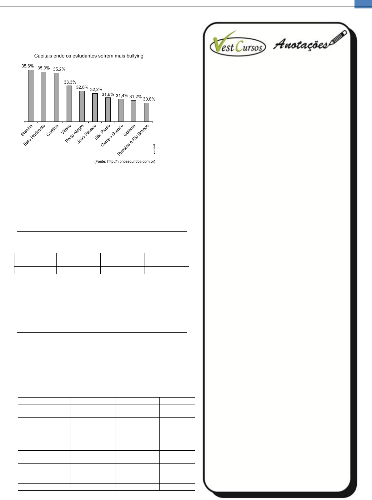 19 CURSO DE MATEMÁTICA ANUAL – AULA 17 – Prof. Raul Brito ESTATÍSTICA I TEXTO PARA A PRÓXIMA QUESTÃO: Um levantamento, realizado pelo IBGE em diversas escolas das capitais brasileiras, apurou onde a prática de bullying é mais comum, conforme indicado no gráfico abaixo: Questão 07 Em relação aos dados obtidos nessa pesquisa é correto afirmar que a média percentual de estudantes que sofrem bullying, nas capitais brasileiras, é igual a: a) 38,65% d) 32,92% b) 35,89% e) 30,66% c) 33,94% Questão 08 A composição de uma certa população, por faixa etária, é verificada na tabela abaixo: CRIANÇAS (O a 14 anos) JOVENS (15 a 24 anos) ADULTOS (25 a 60 anos) IDOSOS (+ de 60 anos) 32% 24% 38% 6% Num gráfico de setores, o ângulo central correspondente à população de jovens medirá, aproximadamente: a) 86° d) 67° b) 54° e) 94° c) 78° Questão 09 A lâmpada incandescente atravessou o século XX, mas, hoje, devido à preocupação com o aquecimento global, tende a se apagar. Nos anos 90, houve a expansão dos modelos compactos das lâmpadas fluorescentes; e, em 2008, foi patenteada a lâmpada LED. O quadro abaixo apresenta os gastos estimados, ao longo de cinco anos, com o uso desses três tipos de lâmpadas, para uma casa com vinte lâmpadas. Incandescente Fluorescente LED Investimento inicial com lâmpadas R$ 36,00 R$ 700,00* R$ 1500,00 Potência média de consumo das lâmpadas 60W 18W 8W Consumo de energia 6.480 kWh 1944 kWh 1080 kWh Lâmpadas queimadas 110 14 zero Gasto com energia R$ 2628,00 R$ 778,00 R$ 348 Gasto com lâmpadas R$ 195,00 R$ 140,00 zero Total R$ 2859,00 R$ 1618,00 R$ 1848,00 20 CURSO DE MATEMÁTICA ANUAL – AULA 17 – Prof. Raul Brito ESTATÍSTICA I Com base nessas informações, considere as seguintes afirmações I. Quarenta lâmpadas incandescentes custam mais que uma lâmpada LED. II. O consumo de energia de uma lâmpada LED equivale a do consumo de energia de uma lâmpada incandescente. III. Em média, o tempo que uma lâmpada fluorescente leva para queimar é sete vezes maior que o tempo que uma incandescente leva para queimar. Quais estão corretas? a) Apenas I. b) Apenas II. c) Apenas III. d) Apenas I e II. e) Apenas II e III. Questão 10 A média aritmética entre os divisores primos e positivos do número 2310 é a) 5,6. b) 6,0. c) 6,3. d) 6,7. 1 6