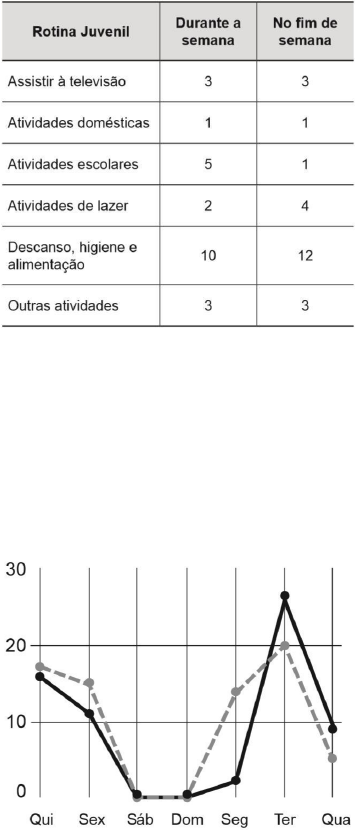 72 Caderno de material complementar e de apoio 6. (ENEM - 2012) Uma pesquisa realizada por estudantes da Faculdade de Estatística mostra, em horas por dia, como jovens entre 12 e 18 anos gastam seu tempo, tanto durante a semana (de Segunda- feira a sexta-feira), como no fim de semana (sábado e domingo). A seguinte tabela ilustra os resultados da pesquisa. De acordo com esta pesquisa, quantas horas de seu tempo gasta um jovem entre 12 e 18 anos, na semana interfira ( de segunda-feira a domingo), nas atividades escolares? a) 20 b) 21 c) 24 d) 25 e) 27 7. (ENEM - 2012) A Figura a seguir apresenta dois gráficos com informações sobre as reclamações diárias recebidas e resolvidas pelo Setor de Atendimento ao Cliente (SAC) de uma empresa, em uma dada semana. O gráfico de linha tracejada informa o número de reclamações recebidas no dia, o de linha contínua é o numero de reclamações resolvidas no dia. As reclamações podem ser resolvidas no mesmo dia ou demorarem mais de um dia para serem resolvidas. O gerente de atendimento deseja identificar os dias da semana em que o nível de eficiência pode ser considerado muito bom, ou seja, os dias em que o número de reclamações resolvidas excede o número de reclamações recebidas. O gerente de atendimento pôde concluir, baseado no conceito de eficiência utilizado na empresa e nas informações do gráfico, que nível de eficiência foi muito bom na a) segunda e na terça-feira. b) terça e na quarta-feira. c) terça e na quinta-feira. d) quinta-feira , no sábado e no domingo. e) segunda, na quinta e na sexta-feira.
