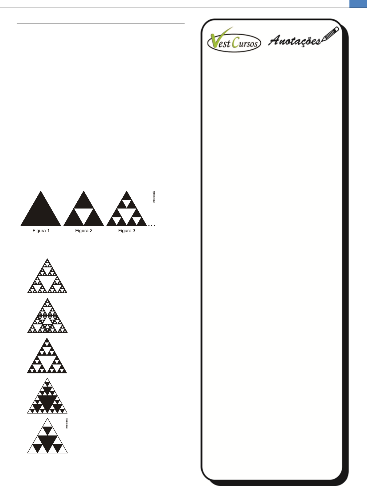 5 CURSO DE MATEMÁTICA ANUAL – AULA 11 – Prof. Raul Brito PROGRESSÃO GEOMÉTRICA EXERCÍCIOS PROPOSTOS Questão 01 (Enem 2008) Fractal (do latim fractus, fração, quebrado) - objeto que pode ser dividido em partes que possuem semelhança com o objeto inicial. A geometria fractal, criada no século XX, estuda as propriedades e o comportamento dos fractais - objetos geométricos formados por repetições de padrões similares. O triângulo de Sierpinski, uma das formas elementares da geometria fractal, pode ser obtido por meio dos seguintes passos: 1. comece com um triângulo equilátero (figura 1); 2. construa um triângulo em que cada lado tenha a metade do tamanho do lado do triângulo anterior e faça três cópias; 3. posicione essas cópias de maneira que cada triângulo tenha um vértice comum com um dos vértices de cada um dos outros dois triângulos, conforme ilustra a figura 2; 4. repita sucessivamente os passos 2 e 3 para cada cópia dos triângulos obtidos no passo 3 (figura 3). De acordo com o procedimento descrito, a figura 4 da sequência apresentada acima é a) b) c) d) e) 6 CURSO DE MATEMÁTICA ANUAL – AULA 11 – Prof. Raul Brito PROGRESSÃO GEOMÉTRICA Questão 02 (Espm 2013) Para que a sequência ( 9, 5,3) se transfor- me numa progressão geométrica, devemos somar a cada um dos seus termos um certo número. Esse número é: a) par b) quadrado perfeito c) primo d) maior que 15 e) não inteiro Questão 03 (Espcex (Aman) 2013) Um fractal é um objeto geométrico que pode ser dividido em partes, cada uma das quais semelhantes ao objeto original. Em muitos casos, um fractal é gerado pela repetição indefinida de um padrão. A figura abaixo segue esse princípio. Para construí-la, inicia-se com uma faixa de comprimento m na primeira linha. Para obter a segunda linha, uma faixa de comprimento m é dividida em três partes congruentes, suprimindo-se a parte do meio. Procede-se de maneira análoga para a obtenção das demais linhas, conforme indicado na figura. Se, partindo de uma faixa de comprimento m, esse procedimento for efetuado infinitas vezes, a soma das medidas dos comprimentos de todas as faixas é a) 3 m b) 4 m c) 5 m d) 6 m e) 7 m Questão 04 (Pucrj 2013) A sequência (2, x, y, 8) representa uma progressão geométrica. O produto xy vale: a) 8 b) 10 c) 12 d) 14 e) 16