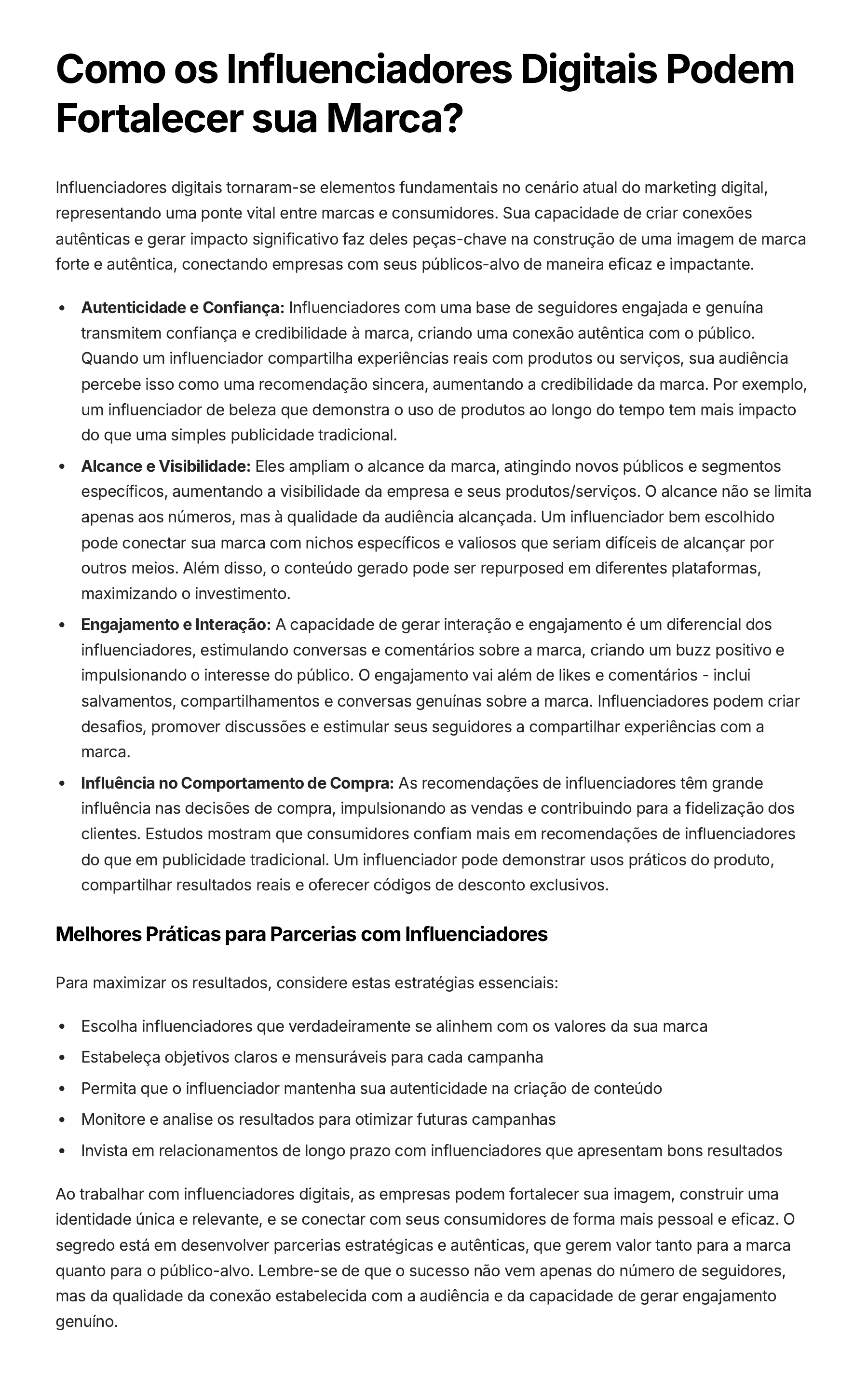 Como os Influenciadores Digitais Podem Fortalecer sua Marca? Influenciadores digitais tornaram-se elementos fundamentais no cenário atual do marketing digital, representando uma ponte vital entre marcas e consumidores. Sua capacidade de criar conexões autênticas e gerar impacto significativo faz deles peças-chave na construção de uma imagem de marca forte e autêntica, conectando empresas com seus públicos-alvo de maneira eficaz e impactante. Autenticidade e Confiança: Influenciadores com uma base de seguidores engajada e genuína transmitem confiança e credibilidade à marca, criando uma conexão autêntica com o público. Quando um influenciador compartilha experiências reais com produtos ou serviços, sua audiência percebe isso como uma recomendação sincera, aumentando a credibilidade da marca. Por exemplo, um influenciador de beleza que demonstra o uso de produtos ao longo do tempo tem mais impacto do que uma simples publicidade tradicional. Alcance e Visibilidade: Eles ampliam o alcance da marca, atingindo novos públicos e segmentos específicos, aumentando a visibilidade da empresa e seus produtos/serviços. O alcance não se limita apenas aos números, mas à qualidade da audiência alcançada. Um influenciador bem escolhido pode conectar sua marca com nichos específicos e valiosos que seriam difíceis de alcançar por outros meios. Além disso, o conteúdo gerado pode ser repurposed em diferentes plataformas, maximizando o investimento. Engajamento e Interação: A capacidade de gerar interação e engajamento é um diferencial dos influenciadores, estimulando conversas e comentários sobre a marca, criando um buzz positivo e impulsionando o interesse do público. O engajamento vai além de likes e comentários - inclui salvamentos, compartilhamentos e conversas genuínas sobre a marca. Influenciadores podem criar desafios, promover discussões e estimular seus seguidores a compartilhar experiências com a marca. Influência no Comportamento de Compra: As recomendações de influenciadores têm grande influência nas decisões de compra, impulsionando as vendas e contribuindo para a fidelização dos clientes. Estudos mostram que consumidores confiam mais em recomendações de influenciadores do que em publicidade tradicional. Um influenciador pode demonstrar usos práticos do produto, compartilhar resultados reais e oferecer códigos de desconto exclusivos. Melhores Práticas para Parcerias com Influenciadores Para maximizar os resultados, considere estas estratégias essenciais: Escolha influenciadores que verdadeiramente se alinhem com os valores da sua marca Estabeleça objetivos claros e mensuráveis para cada campanha Permita que o influenciador mantenha sua autenticidade na criação de conteúdo Monitore e analise os resultados para otimizar futuras campanhas Invista em relacionamentos de longo prazo com influenciadores que apresentam bons resultados Ao trabalhar com influenciadores digitais, as empresas podem fortalecer sua imagem, construir uma identidade única e relevante, e se conectar com seus consumidores de forma mais pessoal e eficaz. O segredo está em desenvolver parcerias estratégicas e autênticas, que gerem valor tanto para a marca quanto para o público-alvo. Lembre-se de que o sucesso não vem apenas do número de seguidores, mas da qualidade da conexão estabelecida com a audiência e da capacidade de gerar engajamento genuíno.