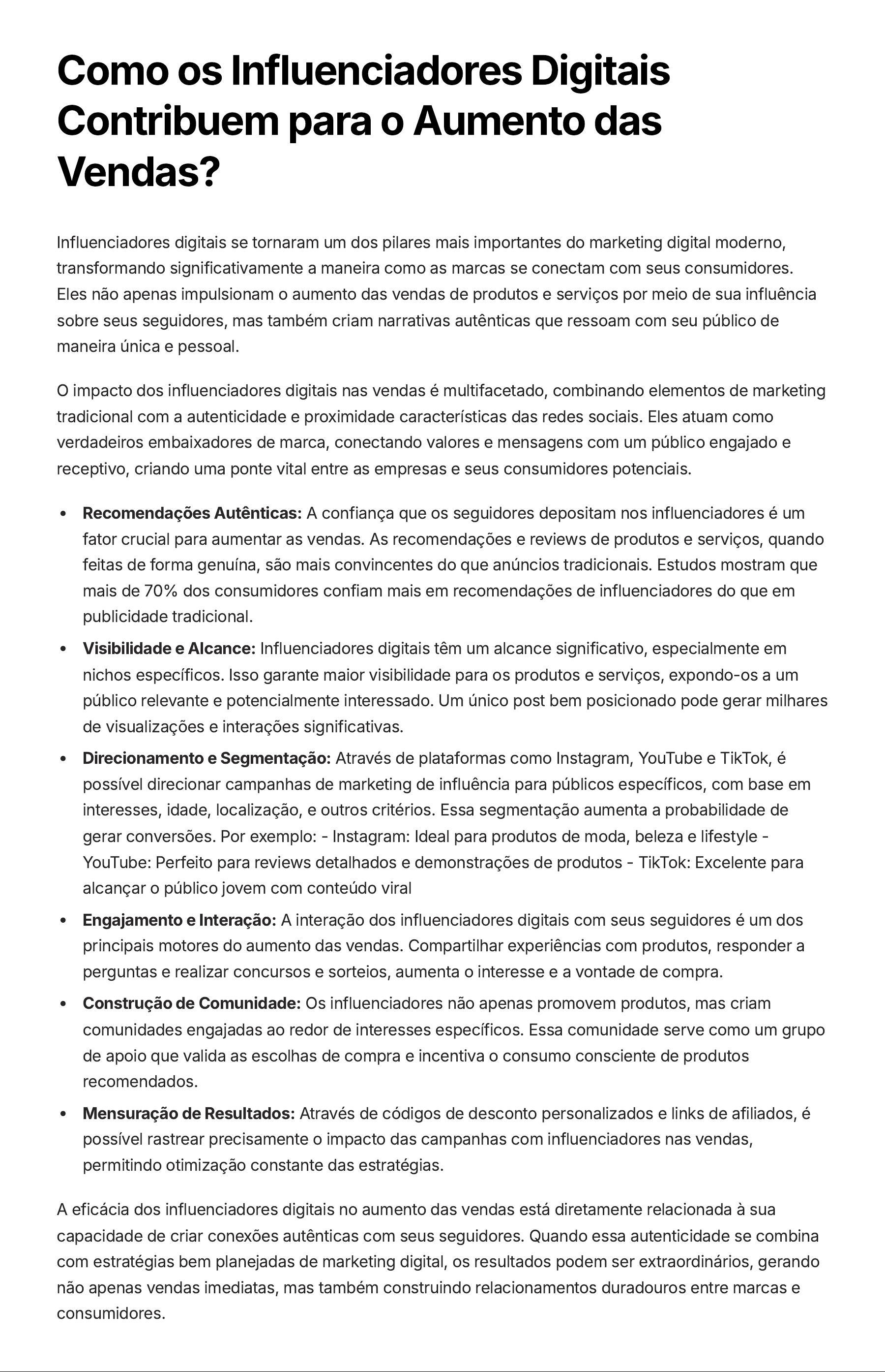 Como os Influenciadores Digitais Contribuem para o Aumento das Vendas? Influenciadores digitais se tornaram um dos pilares mais importantes do marketing digital moderno, transformando significativamente a maneira como as marcas se conectam com seus consumidores. Eles não apenas impulsionam o aumento das vendas de produtos e serviços por meio de sua influência sobre seus seguidores, mas também criam narrativas autênticas que ressoam com seu público de maneira única e pessoal. O impacto dos influenciadores digitais nas vendas é multifacetado, combinando elementos de marketing tradicional com a autenticidade e proximidade características das redes sociais. Eles atuam como verdadeiros embaixadores de marca, conectando valores e mensagens com um público engajado e receptivo, criando uma ponte vital entre as empresas e seus consumidores potenciais. Recomendações Autênticas: A confiança que os seguidores depositam nos influenciadores é um fator crucial para aumentar as vendas. As recomendações e reviews de produtos e serviços, quando feitas de forma genuína, são mais convincentes do que anúncios tradicionais. Estudos mostram que mais de 70% dos consumidores confiam mais em recomendações de influenciadores do que em publicidade tradicional. Visibilidade e Alcance: Influenciadores digitais têm um alcance significativo, especialmente em nichos específicos. Isso garante maior visibilidade para os produtos e serviços, expondo-os a um público relevante e potencialmente interessado. Um único post bem posicionado pode gerar milhares de visualizações e interações significativas. Direcionamento e Segmentação: Através de plataformas como Instagram, YouTube e TikTok, é possível direcionar campanhas de marketing de influência para públicos específicos, com base em interesses, idade, localização, e outros critérios. Essa segmentação aumenta a probabilidade de gerar conversões. Por exemplo: - Instagram: Ideal para produtos de moda, beleza e lifestyle - YouTube: Perfeito para reviews detalhados e demonstrações de produtos - TikTok: Excelente para alcançar o público jovem com conteúdo viral Engajamento e Interação: A interação dos influenciadores digitais com seus seguidores é um dos principais motores do aumento das vendas. Compartilhar experiências com produtos, responder a perguntas e realizar concursos e sorteios, aumenta o interesse e a vontade de compra. Construção de Comunidade: Os influenciadores não apenas promovem produtos, mas criam comunidades engajadas ao redor de interesses específicos. Essa comunidade serve como um grupo de apoio que valida as escolhas de compra e incentiva o consumo consciente de produtos recomendados. Mensuração de Resultados: Através de códigos de desconto personalizados e links de afiliados, é possível rastrear precisamente o impacto das campanhas com influenciadores nas vendas, permitindo otimização constante das estratégias. A eficácia dos influenciadores digitais no aumento das vendas está diretamente relacionada à sua capacidade de criar conexões autênticas com seus seguidores. Quando essa autenticidade se combina com estratégias bem planejadas de marketing digital, os resultados podem ser extraordinários, gerando não apenas vendas imediatas, mas também construindo relacionamentos duradouros entre marcas e consumidores.