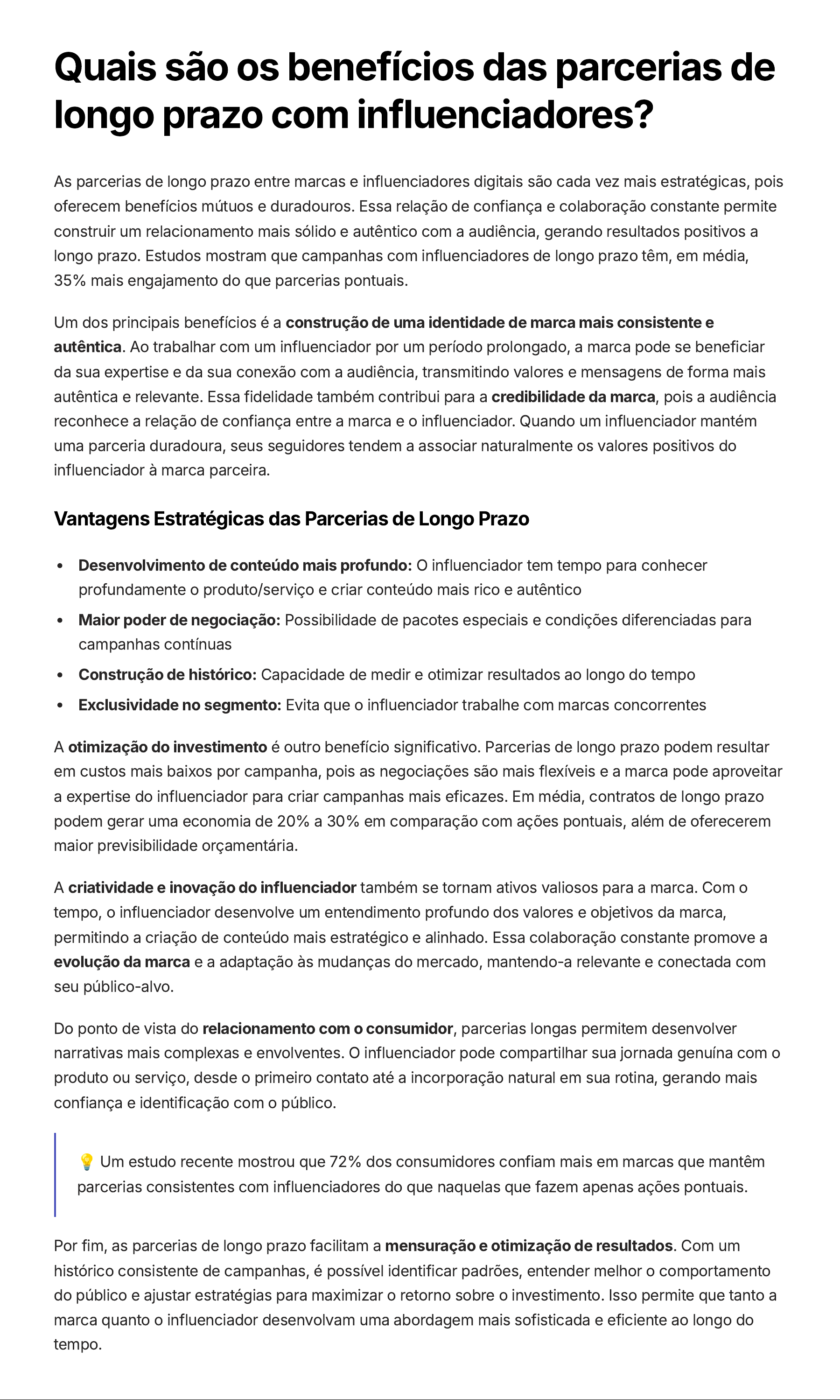 Quais são os benefícios das parcerias de longo prazo com influenciadores? As parcerias de longo prazo entre marcas e influenciadores digitais são cada vez mais estratégicas, pois oferecem benefícios mútuos e duradouros. Essa relação de confiança e colaboração constante permite construir um relacionamento mais sólido e autêntico com a audiência, gerando resultados positivos a longo prazo. Estudos mostram que campanhas com influenciadores de longo prazo têm, em média, 35% mais engajamento do que parcerias pontuais. Um dos principais benefícios é a construção de uma identidade de marca mais consistente e autêntica. Ao trabalhar com um influenciador por um período prolongado, a marca pode se beneficiar da sua expertise e da sua conexão com a audiência, transmitindo valores e mensagens de forma mais autêntica e relevante. Essa fidelidade também contribui para a credibilidade da marca, pois a audiência reconhece a relação de confiança entre a marca e o influenciador. Quando um influenciador mantém uma parceria duradoura, seus seguidores tendem a associar naturalmente os valores positivos do influenciador à marca parceira. Vantagens Estratégicas das Parcerias de Longo Prazo Desenvolvimento de conteúdo mais profundo: O influenciador tem tempo para conhecer profundamente o produto/serviço e criar conteúdo mais rico e autêntico Maior poder de negociação: Possibilidade de pacotes especiais e condições diferenciadas para campanhas contínuas Construção de histórico: Capacidade de medir e otimizar resultados ao longo do tempo Exclusividade no segmento: Evita que o influenciador trabalhe com marcas concorrentes A otimização do investimento é outro benefício significativo. Parcerias de longo prazo podem resultar em custos mais baixos por campanha, pois as negociações são mais flexíveis e a marca pode aproveitar a expertise do influenciador para criar campanhas mais eficazes. Em média, contratos de longo prazo podem gerar uma economia de 20% a 30% em comparação com ações pontuais, além de oferecerem maior previsibilidade orçamentária. A criatividade e inovação do influenciador também se tornam ativos valiosos para a marca. Com o tempo, o influenciador desenvolve um entendimento profundo dos valores e objetivos da marca, permitindo a criação de conteúdo mais estratégico e alinhado. Essa colaboração constante promove a evolução da marca e a adaptação às mudanças do mercado, mantendo-a relevante e conectada com seu público-alvo. Do ponto de vista do relacionamento com o consumidor, parcerias longas permitem desenvolver narrativas mais complexas e envolventes. O influenciador pode compartilhar sua jornada genuína com o produto ou serviço, desde o primeiro contato até a incorporação natural em sua rotina, gerando mais confiança e identificação com o público. � Um estudo recente mostrou que 72% dos consumidores confiam mais em marcas que mantêm parcerias consistentes com influenciadores do que naquelas que fazem apenas ações pontuais. Por fim, as parcerias de longo prazo facilitam a mensuração e otimização de resultados. Com um histórico consistente de campanhas, é possível identificar padrões, entender melhor o comportamento do público e ajustar estratégias para maximizar o retorno sobre o investimento. Isso permite que tanto a marca quanto o influenciador desenvolvam uma abordagem mais sofisticada e eficiente ao longo do tempo.
