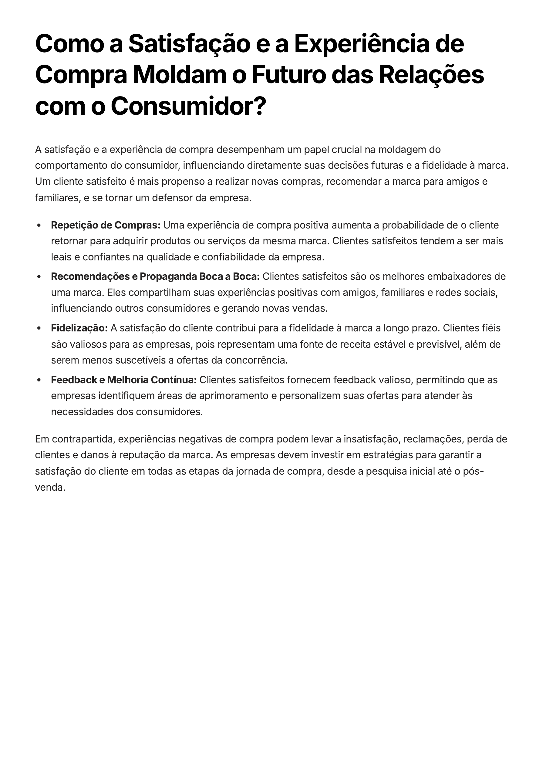 Como a Satisfação e a Experiência de Compra Moldam o Futuro das Relações com o Consumidor? A satisfação e a experiência de compra desempenham um papel crucial na moldagem do comportamento do consumidor, influenciando diretamente suas decisões futuras e a fidelidade à marca. Um cliente satisfeito é mais propenso a realizar novas compras, recomendar a marca para amigos e familiares, e se tornar um defensor da empresa. Repetição de Compras: Uma experiência de compra positiva aumenta a probabilidade de o cliente retornar para adquirir produtos ou serviços da mesma marca. Clientes satisfeitos tendem a ser mais leais e confiantes na qualidade e confiabilidade da empresa. Recomendações e Propaganda Boca a Boca: Clientes satisfeitos são os melhores embaixadores de uma marca. Eles compartilham suas experiências positivas com amigos, familiares e redes sociais, influenciando outros consumidores e gerando novas vendas. Fidelização: A satisfação do cliente contribui para a fidelidade à marca a longo prazo. Clientes fiéis são valiosos para as empresas, pois representam uma fonte de receita estável e previsível, além de serem menos suscetíveis a ofertas da concorrência. Feedback e Melhoria Contínua: Clientes satisfeitos fornecem feedback valioso, permitindo que as empresas identifiquem áreas de aprimoramento e personalizem suas ofertas para atender às necessidades dos consumidores. Em contrapartida, experiências negativas de compra podem levar a insatisfação, reclamações, perda de clientes e danos à reputação da marca. As empresas devem investir em estratégias para garantir a satisfação do cliente em todas as etapas da jornada de compra, desde a pesquisa inicial até o pós- venda. Como a Inovação e a Tecnologia Estão Revolucionando as Decisões de Consumo na Era Digital? A inovação e a tecnologia desempenham um papel fundamental nas decisões de consumo no mundo contemporâneo. A rápida evolução tecnológica molda as preferências dos consumidores, impacta a forma como eles pesquisam, compram e interagem com produtos e serviços, além de influenciar as expectativas e o comportamento de compra. A inovação tecnológica cria novas necessidades e desejos, impulsionando a procura por produtos e serviços inovadores. Smartphones, carros autônomos, dispositivos inteligentes, aplicativos e plataformas online são apenas alguns exemplos de como a tecnologia impactou diretamente o consumo. A facilidade de acesso à informação e a personalização proporcionadas pela tecnologia contribuem para decisões de compra mais informadas e personalizadas. A tecnologia também facilita o acesso a uma ampla gama de produtos e serviços, tornando o processo de compra mais conveniente e eficiente. As compras online, por exemplo, eliminam a necessidade de deslocamento físico e oferecem uma variedade maior de opções, comparando preços, lendo avaliações e acessando informações detalhadas sobre produtos. Além disso, a personalização de ofertas, anúncios direcionados e recomendações personalizadas, impulsionadas por algoritmos, otimizam a experiência de compra e influenciam as escolhas dos consumidores. A tecnologia influencia a experiência de consumo e a interação com produtos e serviços. As empresas utilizam tecnologias de realidade aumentada e virtual para oferecer experiências imersivas, permitindo que os consumidores visualizem e experimentem produtos virtualmente antes de comprá-los. A coleta e análise de dados por meio de dispositivos inteligentes e aplicativos permitem que as empresas entendam melhor as necessidades e preferências dos consumidores, adaptando seus produtos e serviços para atender às expectativas e necessidades individuais. Em resumo, a inovação e a tecnologia moldam as decisões de consumo ao criar novas necessidades e desejos, facilitar o acesso e a conveniência, personalizar a experiência de compra e oferecer novas formas de interagir com produtos e serviços. É fundamental para as empresas acompanhar as tendências tecnológicas e adaptar suas estratégias de marketing e oferta de produtos para atender às demandas e expectativas dos consumidores em constante mudança. Como a Segmentação de Mercado Pode Revolucionar suas Estratégias de Marketing? A segmentação de mercado é fundamental para o sucesso das estratégias de marketing. Ela permite que as empresas dividam seu público-alvo em grupos distintos com características, necessidades e desejos semelhantes. Ao entender esses grupos específicos, as empresas podem desenvolver campanhas de marketing personalizadas e direcionadas, aumentando a efetividade de seus esforços e otimizando o retorno sobre o investimento. A segmentação de mercado permite que as empresas se concentrem em seus esforços de marketing nos grupos mais propensos a comprar seus produtos ou serviços. Isso significa que as empresas podem direcionar suas mensagens, ofertas e canais de comunicação para alcançar o público-alvo de forma mais eficaz, economizando tempo e recursos. Existem diversos critérios para segmentar o mercado, como: Demográfico: Idade, gênero, renda, localização geográfica, nível de escolaridade, estado civil, tamanho da família. Psicográfico: Estilo de vida, valores, personalidade, atitudes, interesses, opiniões. Comportamental: Hábitos de compra, fidelidade à marca, propensão à compra, ocasiões de compra, benefícios buscados. Ao segmentar o mercado, as empresas podem desenvolver estratégias de marketing mais eficientes, personalizadas e direcionadas, levando em consideração as características e necessidades específicas de cada grupo de consumidores. Isso permite que as empresas otimizem seus recursos, maximizem o retorno sobre o investimento e construam relacionamentos mais fortes com seus clientes.