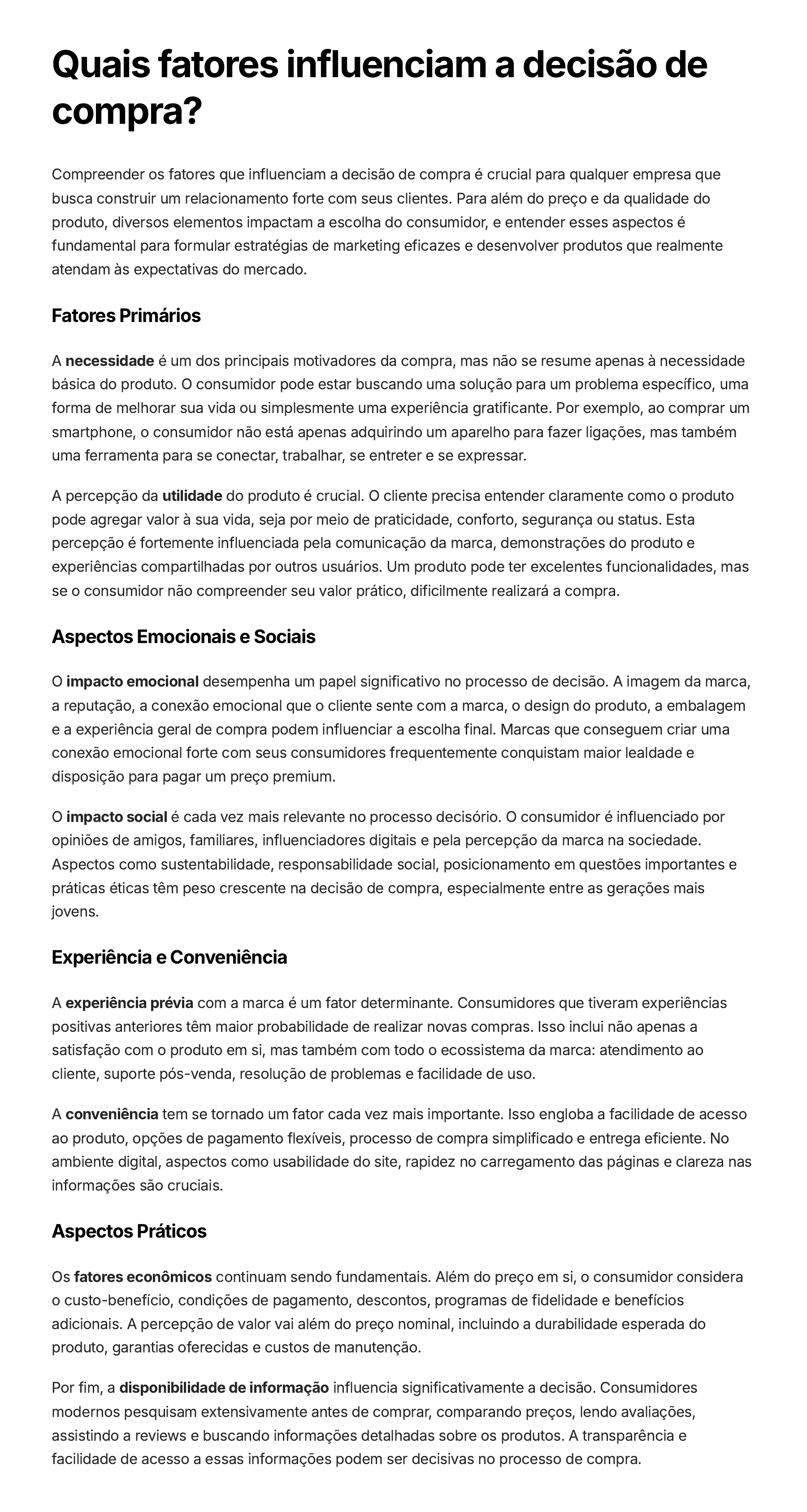 Quais fatores influenciam a decisão de compra? Compreender os fatores que influenciam a decisão de compra é crucial para qualquer empresa que busca construir um relacionamento forte com seus clientes. Para além do preço e da qualidade do produto, diversos elementos impactam a escolha do consumidor, e entender esses aspectos é fundamental para formular estratégias de marketing eficazes e desenvolver produtos que realmente atendam às expectativas do mercado. Fatores Primários A necessidade é um dos principais motivadores da compra, mas não se resume apenas à necessidade básica do produto. O consumidor pode estar buscando uma solução para um problema específico, uma forma de melhorar sua vida ou simplesmente uma experiência gratificante. Por exemplo, ao comprar um smartphone, o consumidor não está apenas adquirindo um aparelho para fazer ligações, mas também uma ferramenta para se conectar, trabalhar, se entreter e se expressar. A percepção da utilidade do produto é crucial. O cliente precisa entender claramente como o produto pode agregar valor à sua vida, seja por meio de praticidade, conforto, segurança ou status. Esta percepção é fortemente influenciada pela comunicação da marca, demonstrações do produto e experiências compartilhadas por outros usuários. Um produto pode ter excelentes funcionalidades, mas se o consumidor não compreender seu valor prático, dificilmente realizará a compra. Aspectos Emocionais e Sociais O impacto emocional desempenha um papel significativo no processo de decisão. A imagem da marca, a reputação, a conexão emocional que o cliente sente com a marca, o design do produto, a embalagem e a experiência geral de compra podem influenciar a escolha final. Marcas que conseguem criar uma conexão emocional forte com seus consumidores frequentemente conquistam maior lealdade e disposição para pagar um preço premium. O impacto social é cada vez mais relevante no processo decisório. O consumidor é influenciado por opiniões de amigos, familiares, influenciadores digitais e pela percepção da marca na sociedade. Aspectos como sustentabilidade, responsabilidade social, posicionamento em questões importantes e práticas éticas têm peso crescente na decisão de compra, especialmente entre as gerações mais jovens. Experiência e Conveniência A experiência prévia com a marca é um fator determinante. Consumidores que tiveram experiências positivas anteriores têm maior probabilidade de realizar novas compras. Isso inclui não apenas a satisfação com o produto em si, mas também com todo o ecossistema da marca: atendimento ao cliente, suporte pós-venda, resolução de problemas e facilidade de uso. A conveniência tem se tornado um fator cada vez mais importante. Isso engloba a facilidade de acesso ao produto, opções de pagamento flexíveis, processo de compra simplificado e entrega eficiente. No ambiente digital, aspectos como usabilidade do site, rapidez no carregamento das páginas e clareza nas informações são cruciais. Aspectos Práticos Os fatores econômicos continuam sendo fundamentais. Além do preço em si, o consumidor considera o custo-benefício, condições de pagamento, descontos, programas de fidelidade e benefícios adicionais. A percepção de valor vai além do preço nominal, incluindo a durabilidade esperada do produto, garantias oferecidas e custos de manutenção. Por fim, a disponibilidade de informação influencia significativamente a decisão. Consumidores modernos pesquisam extensivamente antes de comprar, comparando preços, lendo avaliações, assistindo a reviews e buscando informações detalhadas sobre os produtos. A transparência e facilidade de acesso a essas informações podem ser decisivas no processo de compra.