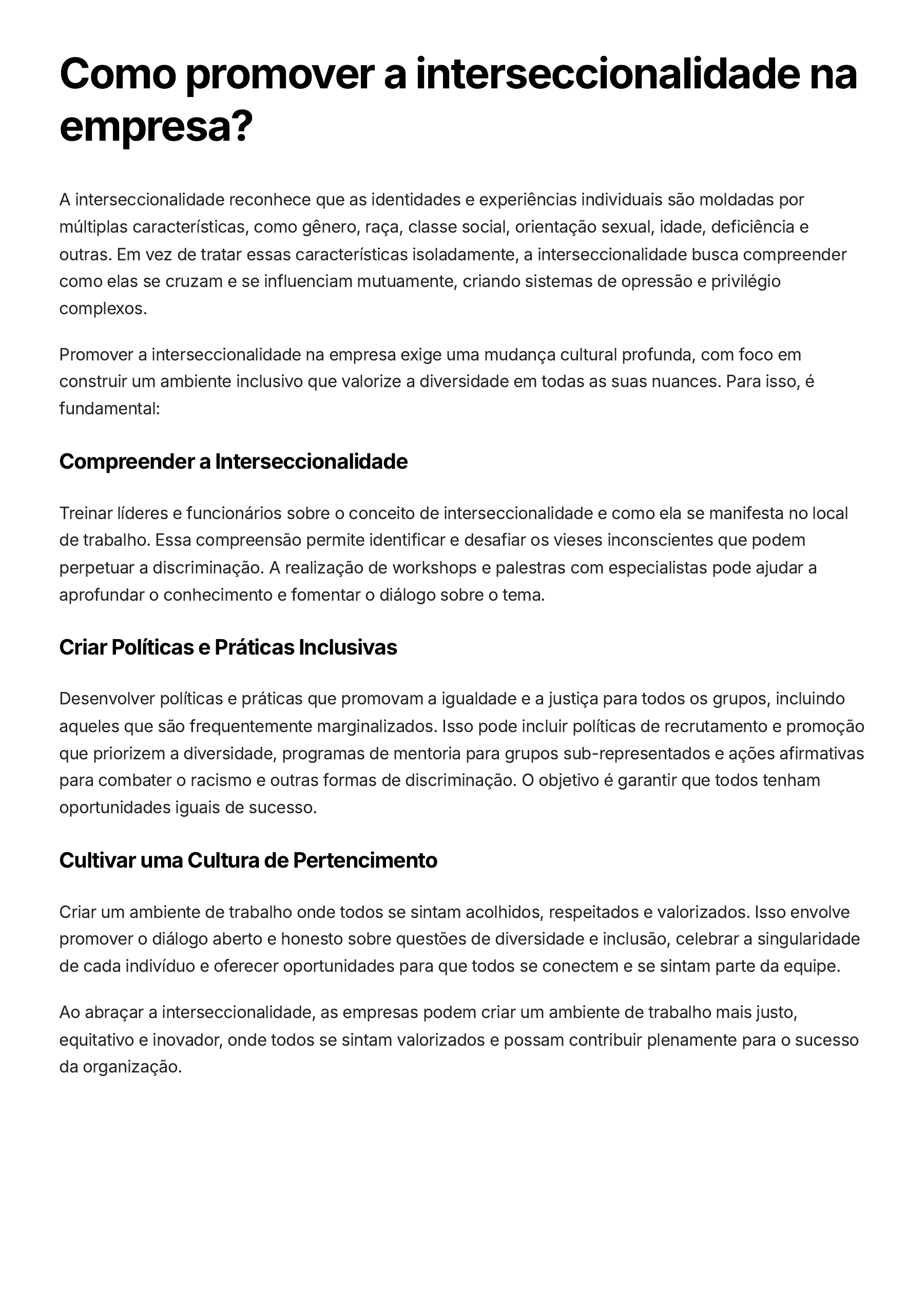 Como promover a interseccionalidade na empresa? A interseccionalidade reconhece que as identidades e experiências individuais são moldadas por múltiplas características, como gênero, raça, classe social, orientação sexual, idade, deficiência e outras. Em vez de tratar essas características isoladamente, a interseccionalidade busca compreender como elas se cruzam e se influenciam mutuamente, criando sistemas de opressão e privilégio complexos. Promover a interseccionalidade na empresa exige uma mudança cultural profunda, com foco em construir um ambiente inclusivo que valorize a diversidade em todas as suas nuances. Para isso, é fundamental: Compreender a Interseccionalidade Treinar líderes e funcionários sobre o conceito de interseccionalidade e como ela se manifesta no local de trabalho. Essa compreensão permite identificar e desafiar os vieses inconscientes que podem perpetuar a discriminação. A realização de workshops e palestras com especialistas pode ajudar a aprofundar o conhecimento e fomentar o diálogo sobre o tema. Criar Políticas e Práticas Inclusivas Desenvolver políticas e práticas que promovam a igualdade e a justiça para todos os grupos, incluindo aqueles que são frequentemente marginalizados. Isso pode incluir políticas de recrutamento e promoção que priorizem a diversidade, programas de mentoria para grupos sub-representados e ações afirmativas para combater o racismo e outras formas de discriminação. O objetivo é garantir que todos tenham oportunidades iguais de sucesso. Cultivar uma Cultura de Pertencimento Criar um ambiente de trabalho onde todos se sintam acolhidos, respeitados e valorizados. Isso envolve promover o diálogo aberto e honesto sobre questões de diversidade e inclusão, celebrar a singularidade de cada indivíduo e oferecer oportunidades para que todos se conectem e se sintam parte da equipe. Ao abraçar a interseccionalidade, as empresas podem criar um ambiente de trabalho mais justo, equitativo e inovador, onde todos se sintam valorizados e possam contribuir plenamente para o sucesso da organização. Como podemos apoiar a saúde mental dos colaboradores? Programas de Bem-Estar Mental Oferecer programas de bem-estar mental, como meditação guiada, mindfulness, yoga e terapia online, demonstra cuidado com a saúde mental dos funcionários. Essas iniciativas ajudam a reduzir o estresse, melhorar o sono e promover a autoconsciência. Linhas de Apoio e Aconselhamento Estabelecer linhas de apoio telefônico ou online com psicólogos e profissionais de saúde mental permite que os funcionários busquem ajuda confidencialmente, sem receio de estigma. Essa ferramenta é essencial para lidar com questões de saúde mental e fornecer suporte durante momentos desafiadores. Grupos de Apoio e Redes de Conexão Criar grupos de apoio ou comunidades online para que os funcionários compartilhem suas experiências e aprendam com outros que enfrentam desafios semelhantes. O sentimento de pertencimento e o apoio mútuo são fundamentais para a saúde mental, especialmente em ambientes de trabalho estressantes. Cultura de Abertura e Diálogo Promover uma cultura de trabalho que valorize a comunicação aberta e o diálogo sobre a saúde mental. Encorajar os líderes a serem mais empáticos e a criar um ambiente onde os funcionários se sintam confortáveis para falar sobre seus desafios. Quais os principais desafios na retenção de talentos diversos? Retenção de talentos diversos apresenta desafios únicos, exigindo uma abordagem estratégica para criar um ambiente inclusivo e acolhedor. A falta de oportunidades de crescimento, a sensação de não pertencimento e a discriminação inconsciente são obstáculos comuns enfrentados por grupos minoritários. Falta de oportunidades de crescimento: A ascensão na carreira pode ser mais lenta para profissionais de grupos minoritários, devido a oportunidades limitadas, falta de mentoria e apoio, e barreiras estruturais. Sensação de não pertencimento: Um ambiente de trabalho que não reflete a diversidade da sociedade pode levar à sensação de isolamento e falta de identificação, impactando a experiência do profissional. Discriminação inconsciente: Preconceitos e estereótipos inconscientes podem influenciar as decisões de gestão, criando obstáculos para a progressão na carreira e a participação em oportunidades. Falta de apoio: A falta de programas de apoio específicos para grupos minoritários, como mentoria, networking e desenvolvimento de habilidades, limita o potencial de crescimento desses profissionais. Para superar esses desafios, as empresas precisam investir em programas de desenvolvimento e mentoria, promover a inclusão em todos os níveis da organização, e criar uma cultura de respeito e equidade. É essencial identificar e eliminar os obstáculos que impedem a retenção de talentos diversos, garantindo que todos tenham oportunidades iguais de progredir em suas carreiras. Como garantir a acessibilidade e inclusão para pessoas com deficiência? A acessibilidade e a inclusão de pessoas com deficiência são fundamentais para criar um ambiente de trabalho justo e equitativo. É essencial garantir que todos os colaboradores, independentemente de suas necessidades, tenham oportunidades iguais de desenvolvimento e sucesso profissional. Adaptação do Ambiente de Trabalho: Adaptar o ambiente físico e virtual para atender às necessidades específicas de pessoas com deficiência é crucial. Isso pode incluir rampas, elevadores, banheiros adaptados, softwares de acessibilidade, legendas em vídeos e descrições de imagens. Recursos de Apoio: Oferecer recursos de apoio, como intérpretes de Libras, leitores de tela, softwares de comunicação alternativa e outros dispositivos assistivos, permite que pessoas com deficiência participem ativamente das atividades e desenvolvam suas funções de forma eficiente. Treinamento e Sensibilização: É fundamental promove