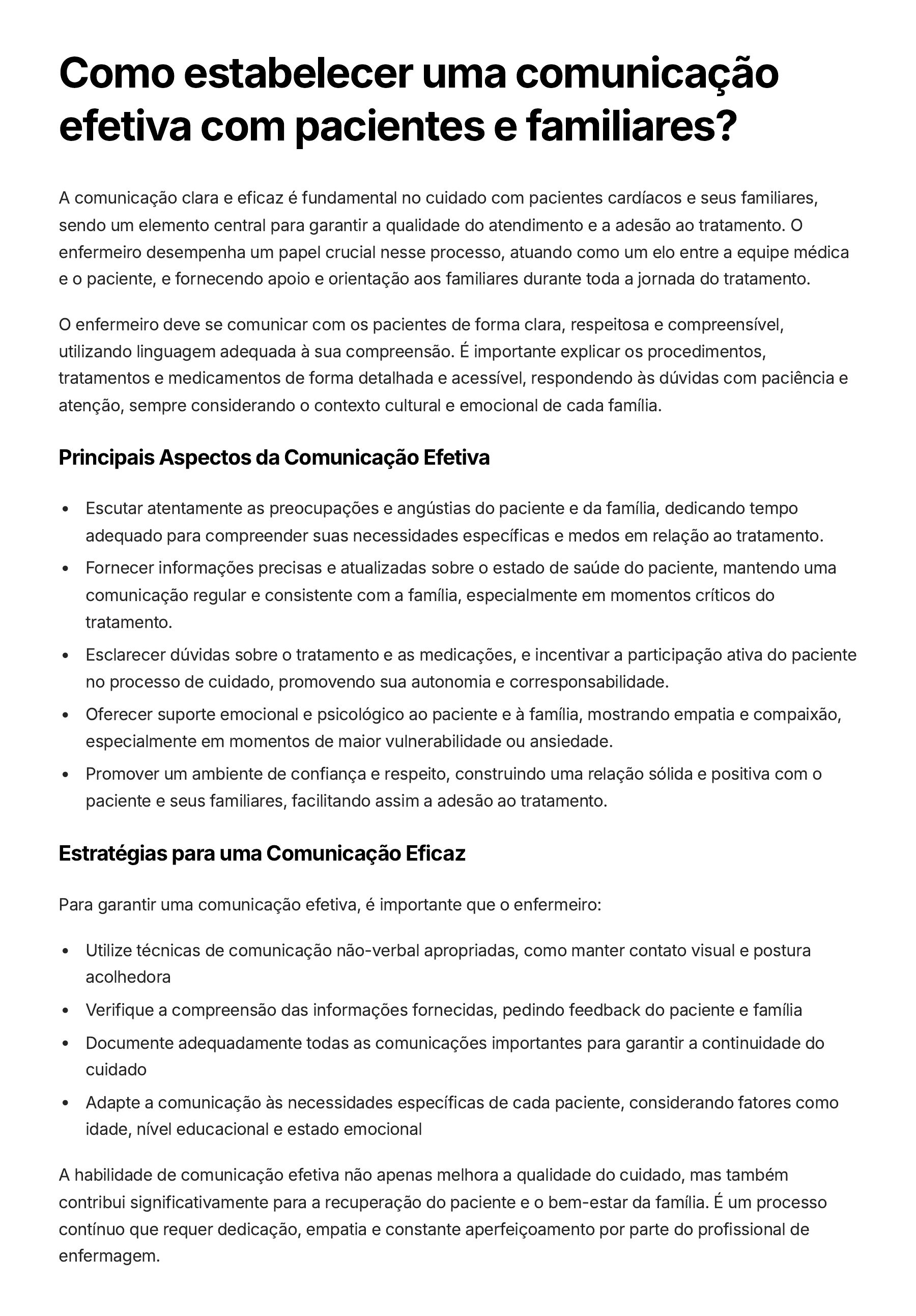 Como estabelecer uma comunicação efetiva com pacientes e familiares? A comunicação clara e eficaz é fundamental no cuidado com pacientes cardíacos e seus familiares, sendo um elemento central para garantir a qualidade do atendimento e a adesão ao tratamento. O enfermeiro desempenha um papel crucial nesse processo, atuando como um elo entre a equipe médica e o paciente, e fornecendo apoio e orientação aos familiares durante toda a jornada do tratamento. O enfermeiro deve se comunicar com os pacientes de forma clara, respeitosa e compreensível, utilizando linguagem adequada à sua compreensão. É importante explicar os procedimentos, tratamentos e medicamentos de forma detalhada e acessível, respondendo às dúvidas com paciência e atenção, sempre considerando o contexto cultural e emocional de cada família. Principais Aspectos da Comunicação Efetiva Escutar atentamente as preocupações e angústias do paciente e da família, dedicando tempo adequado para compreender suas necessidades específicas e medos em relação ao tratamento. Fornecer informações precisas e atualizadas sobre o estado de saúde do paciente, mantendo uma comunicação regular e consistente com a família, especialmente em momentos críticos do tratamento. Esclarecer dúvidas sobre o tratamento e as medicações, e incentivar a participação ativa do paciente no processo de cuidado, promovendo sua autonomia e corresponsabilidade. Oferecer suporte emocional e psicológico ao paciente e à família, mostrando empatia e compaixão, especialmente em momentos de maior vulnerabilidade ou ansiedade. Promover um ambiente de confiança e respeito, construindo uma relação sólida e positiva com o paciente e seus familiares, facilitando assim a adesão ao tratamento. Estratégias para uma Comunicação Eficaz Para garantir uma comunicação efetiva, é importante que o enfermeiro: Utilize técnicas de comunicação não-verbal apropriadas, como manter contato visual e postura acolhedora Verifique a compreensão das informações fornecidas, pedindo feedback do paciente e família Documente adequadamente todas as comunicações importantes para garantir a continuidade do cuidado Adapte a comunicação às necessidades específicas de cada paciente, considerando fatores como idade, nível educacional e estado emocional A habilidade de comunicação efetiva não apenas melhora a qualidade do cuidado, mas também contribui significativamente para a recuperação do paciente e o bem-estar da família. É um processo contínuo que requer dedicação, empatia e constante aperfeiçoamento por parte do profissional de enfermagem.