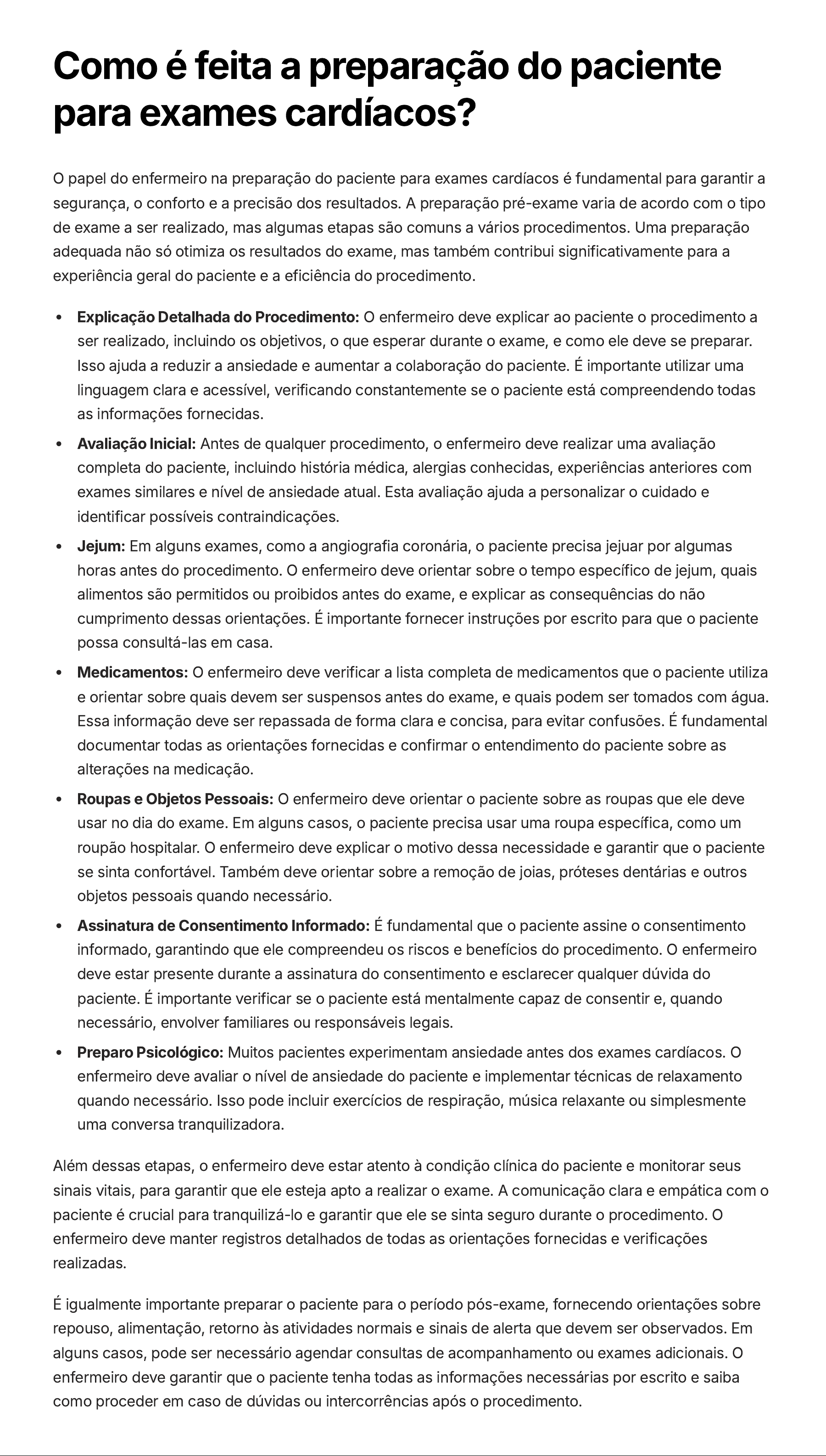 Como é feita a preparação do paciente para exames cardíacos? O papel do enfermeiro na preparação do paciente para exames cardíacos é fundamental para garantir a segurança, o conforto e a precisão dos resultados. A preparação pré-exame varia de acordo com o tipo de exame a ser realizado, mas algumas etapas são comuns a vários procedimentos. Uma preparação adequada não só otimiza os resultados do exame, mas também contribui significativamente para a experiência geral do paciente e a eficiência do procedimento. Explicação Detalhada do Procedimento: O enfermeiro deve explicar ao paciente o procedimento a ser realizado, incluindo os objetivos, o que esperar durante o exame, e como ele deve se preparar. Isso ajuda a reduzir a ansiedade e aumentar a colaboração do paciente. É importante utilizar uma linguagem clara e acessível, verificando constantemente se o paciente está compreendendo todas as informações fornecidas. Avaliação Inicial: Antes de qualquer procedimento, o enfermeiro deve realizar uma avaliação completa do paciente, incluindo história médica, alergias conhecidas, experiências anteriores com exames similares e nível de ansiedade atual. Esta avaliação ajuda a personalizar o cuidado e identificar possíveis contraindicações. Jejum: Em alguns exames, como a angiografia coronária, o paciente precisa jejuar por algumas horas antes do procedimento. O enfermeiro deve orientar sobre o tempo específico de jejum, quais alimentos são permitidos ou proibidos antes do exame, e explicar as consequências do não cumprimento dessas orientações. É importante fornecer instruções por escrito para que o paciente possa consultá-las em casa. Medicamentos: O enfermeiro deve verificar a lista completa de medicamentos que o paciente utiliza e orientar sobre quais devem ser suspensos antes do exame, e quais podem ser tomados com água. Essa informação deve ser repassada de forma clara e concisa, para evitar confusões. É fundamental documentar todas as orientações fornecidas e confirmar o entendimento do paciente sobre as alterações na medicação. Roupas e Objetos Pessoais: O enfermeiro deve orientar o paciente sobre as roupas que ele deve usar no dia do exame. Em alguns casos, o paciente precisa usar uma roupa específica, como um roupão hospitalar. O enfermeiro deve explicar o motivo dessa necessidade e garantir que o paciente se sinta confortável. Também deve orientar sobre a remoção de joias, próteses dentárias e outros objetos pessoais quando necessário. Assinatura de Consentimento Informado: É fundamental que o paciente assine o consentimento informado, garantindo que ele compreendeu os riscos e benefícios do procedimento. O enfermeiro deve estar presente durante a assinatura do consentimento e esclarecer qualquer dúvida do paciente. É importante verificar se o paciente está mentalmente capaz de consentir e, quando necessário, envolver familiares ou responsáveis legais. Preparo Psicológico: Muitos pacientes experimentam ansiedade antes dos exames cardíacos. O enfermeiro deve avaliar o nível de ansiedade do paciente e implementar técnicas de relaxamento quando necessário. Isso pode incluir exercícios de respiração, música relaxante ou simplesmente uma conversa tranquilizadora. Além dessas etapas, o enfermeiro deve estar atento à condição clínica do paciente e monitorar seus sinais vitais, para garantir que ele esteja apto a realizar o exame. A comunicação clara e empática com o paciente é crucial para tranquilizá-lo e garantir que ele se sinta seguro durante o procedimento. O enfermeiro deve manter registros detalhados de todas as orientações fornecidas e verificações realizadas. É igualmente importante preparar o paciente para o período pós-exame, fornecendo orientações sobre repouso, alimentação, retorno às atividades normais e sinais de alerta que devem ser observados. Em alguns casos, pode ser necessário agendar consultas de acompanhamento ou exames adicionais. O enfermeiro deve garantir que o paciente tenha todas as informações necessárias por escrito e saiba como proceder em caso de dúvidas ou intercorrências após o procedimento.