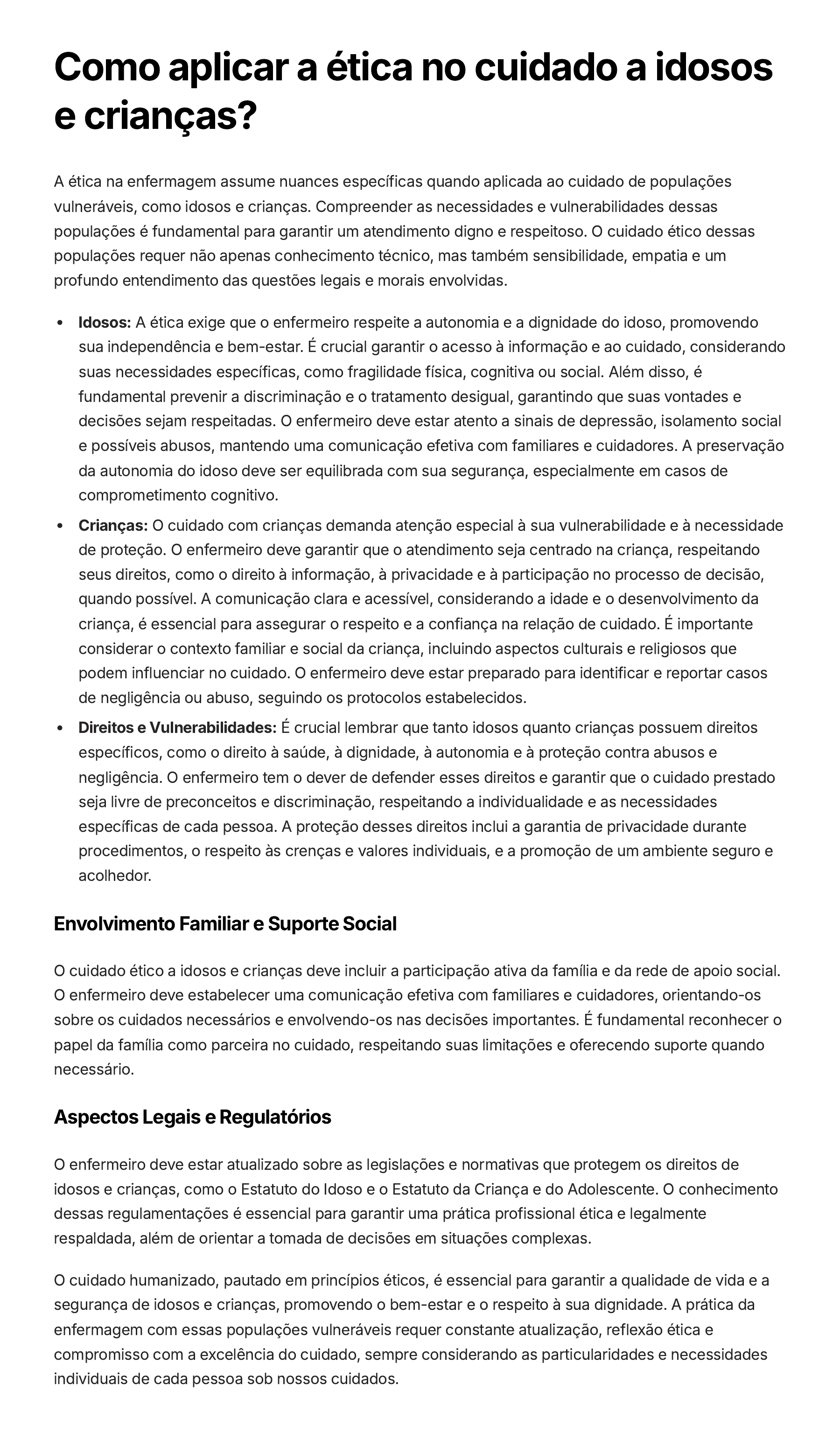 Como aplicar a ética no cuidado a idosos e crianças? A ética na enfermagem assume nuances específicas quando aplicada ao cuidado de populações vulneráveis, como idosos e crianças. Compreender as necessidades e vulnerabilidades dessas populações é fundamental para garantir um atendimento digno e respeitoso. O cuidado ético dessas populações requer não apenas conhecimento técnico, mas também sensibilidade, empatia e um profundo entendimento das questões legais e morais envolvidas. Idosos: A ética exige que o enfermeiro respeite a autonomia e a dignidade do idoso, promovendo sua independência e bem-estar. É crucial garantir o acesso à informação e ao cuidado, considerando suas necessidades específicas, como fragilidade física, cognitiva ou social. Além disso, é fundamental prevenir a discriminação e o tratamento desigual, garantindo que suas vontades e decisões sejam respeitadas. O enfermeiro deve estar atento a sinais de depressão, isolamento social e possíveis abusos, mantendo uma comunicação efetiva com familiares e cuidadores. A preservação da autonomia do idoso deve ser equilibrada com sua segurança, especialmente em casos de comprometimento cognitivo. Crianças: O cuidado com crianças demanda atenção especial à sua vulnerabilidade e à necessidade de proteção. O enfermeiro deve garantir que o atendimento seja centrado na criança, respeitando seus direitos, como o direito à informação, à privacidade e à participação no processo de decisão, quando possível. A comunicação clara e acessível, considerando a idade e o desenvolvimento da criança, é essencial para assegurar o respeito e a confiança na relação de cuidado. É importante considerar o contexto familiar e social da criança, incluindo aspectos culturais e religiosos que podem influenciar no cuidado. O enfermeiro deve estar preparado para identificar e reportar casos de negligência ou abuso, seguindo os protocolos estabelecidos. Direitos e Vulnerabilidades: É crucial lembrar que tanto idosos quanto crianças possuem direitos específicos, como o direito à saúde, à dignidade, à autonomia e à proteção contra abusos e negligência. O enfermeiro tem o dever de defender esses direitos e garantir que o cuidado prestado seja livre de preconceitos e discriminação, respeitando a individualidade e as necessidades específicas de cada pessoa. A proteção desses direitos inclui a garantia de privacidade durante procedimentos, o respeito às crenças e valores individuais, e a promoção de um ambiente seguro e acolhedor. Envolvimento Familiar e Suporte Social O cuidado ético a idosos e crianças deve incluir a participação ativa da família e da rede de apoio social. O enfermeiro deve estabelecer uma comunicação efetiva com familiares e cuidadores, orientando-os sobre os cuidados necessários e envolvendo-os nas decisões importantes. É fundamental reconhecer o papel da família como parceira no cuidado, respeitando suas limitações e oferecendo suporte quando necessário. Aspectos Legais e Regulatórios O enfermeiro deve estar atualizado sobre as legislações e normativas que protegem os direitos de idosos e crianças, como o Estatuto do Idoso e o Estatuto da Criança e do Adolescente. O conhecimento dessas regulamentações é essencial para garantir uma prática profissional ética e legalmente respaldada, além de orientar a tomada de decisões em situações complexas. O cuidado humanizado, pautado em princípios éticos, é essencial para garantir a qualidade de vida e a segurança de idosos e crianças, promovendo o bem-estar e o respeito à sua dignidade. A prática da enfermagem com essas populações vulneráveis requer constante atualização, reflexão ética e compromisso com a excelência do cuidado, sempre considerando as particularidades e necessidades individuais de cada pessoa sob nossos cuidados.