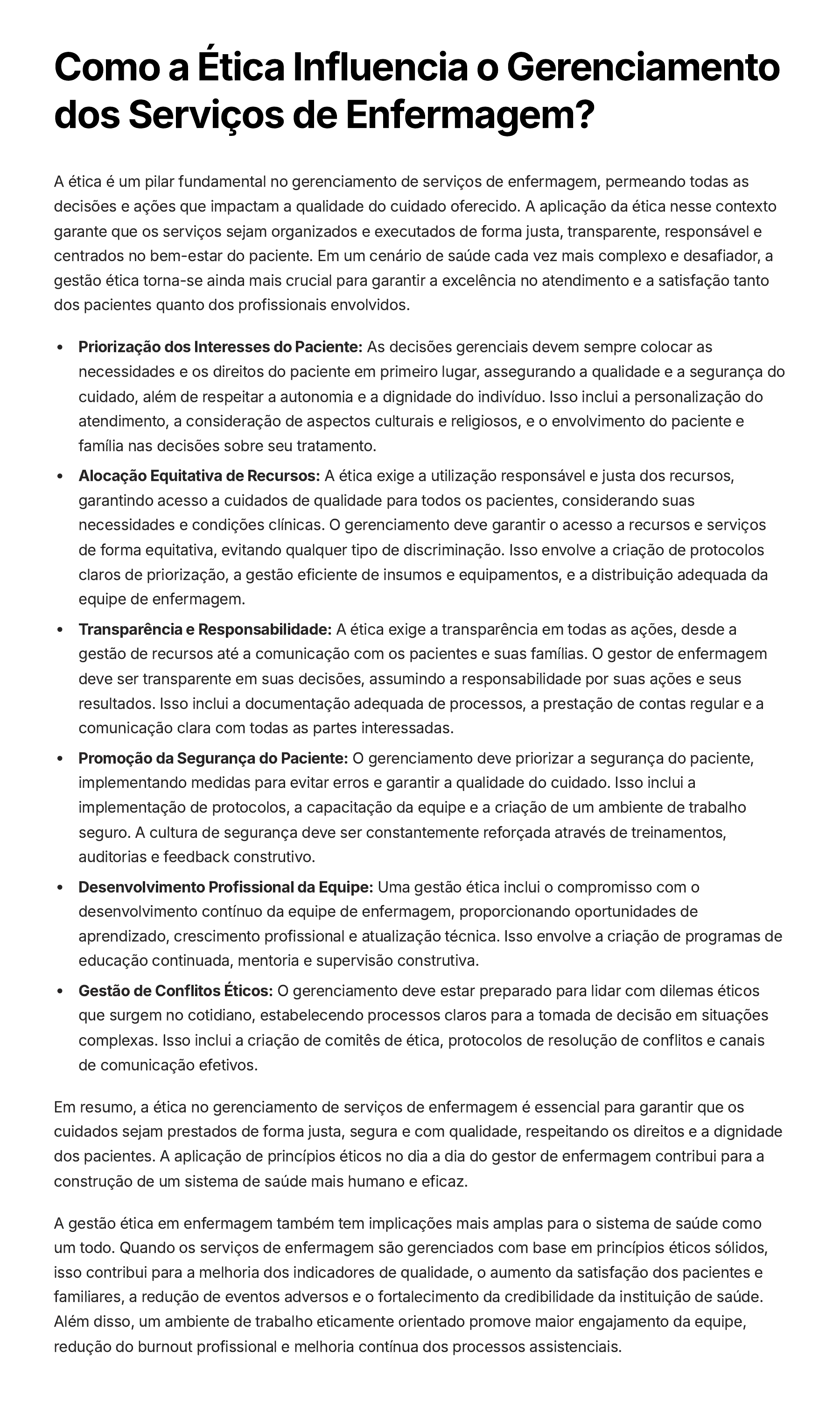Como a Ética Influencia o Gerenciamento dos Serviços de Enfermagem? A ética é um pilar fundamental no gerenciamento de serviços de enfermagem, permeando todas as decisões e ações que impactam a qualidade do cuidado oferecido. A aplicação da ética nesse contexto garante que os serviços sejam organizados e executados de forma justa, transparente, responsável e centrados no bem-estar do paciente. Em um cenário de saúde cada vez mais complexo e desafiador, a gestão ética torna-se ainda mais crucial para garantir a excelência no atendimento e a satisfação tanto dos pacientes quanto dos profissionais envolvidos. Priorização dos Interesses do Paciente: As decisões gerenciais devem sempre colocar as necessidades e os direitos do paciente em primeiro lugar, assegurando a qualidade e a segurança do cuidado, além de respeitar a autonomia e a dignidade do indivíduo. Isso inclui a personalização do atendimento, a consideração de aspectos culturais e religiosos, e o envolvimento do paciente e família nas decisões sobre seu tratamento. Alocação Equitativa de Recursos: A ética exige a utilização responsável e justa dos recursos, garantindo acesso a cuidados de qualidade para todos os pacientes, considerando suas necessidades e condições clínicas. O gerenciamento deve garantir o acesso a recursos e serviços de forma equitativa, evitando qualquer tipo de discriminação. Isso envolve a criação de protocolos claros de priorização, a gestão eficiente de insumos e equipamentos, e a distribuição adequada da equipe de enfermagem. Transparência e Responsabilidade: A ética exige a transparência em todas as ações, desde a gestão de recursos até a comunicação com os pacientes e suas famílias. O gestor de enfermagem deve ser transparente em suas decisões, assumindo a responsabilidade por suas ações e seus resultados. Isso inclui a documentação adequada de processos, a prestação de contas regular e a comunicação clara com todas as partes interessadas. Promoção da Segurança do Paciente: O gerenciamento deve priorizar a segurança do paciente, implementando medidas para evitar erros e garantir a qualidade do cuidado. Isso inclui a implementação de protocolos, a capacitação da equipe e a criação de um ambiente de trabalho seguro. A cultura de segurança deve ser constantemente reforçada através de treinamentos, auditorias e feedback construtivo. Desenvolvimento Profissional da Equipe: Uma gestão ética inclui o compromisso com o desenvolvimento contínuo da equipe de enfermagem, proporcionando oportunidades de aprendizado, crescimento profissional e atualização técnica. Isso envolve a criação de programas de educação continuada, mentoria e supervisão construtiva. Gestão de Conflitos Éticos: O gerenciamento deve estar preparado para lidar com dilemas éticos que surgem no cotidiano, estabelecendo processos claros para a tomada de decisão em situações complexas. Isso inclui a criação de comitês de ética, protocolos de resolução de conflitos e canais de comunicação efetivos. Em resumo, a ética no gerenciamento de serviços de enfermagem é essencial para garantir que os cuidados sejam prestados de forma justa, segura e com qualidade, respeitando os direitos e a dignidade dos pacientes. A aplicação de princípios éticos no dia a dia do gestor de enfermagem contribui para a construção de um sistema de saúde mais humano e eficaz. A gestão ética em enfermagem também tem implicações mais amplas para o sistema de saúde como um todo. Quando os serviços de enfermagem são gerenciados com base em princípios éticos sólidos, isso contribui para a melhoria dos indicadores de qualidade, o aumento da satisfação dos pacientes e familiares, a redução de eventos adversos e o fortalecimento da credibilidade da instituição de saúde. Além disso, um ambiente de trabalho eticamente orientado promove maior engajamento da equipe, redução do burnout profissional e melhoria contínua dos processos assistenciais.