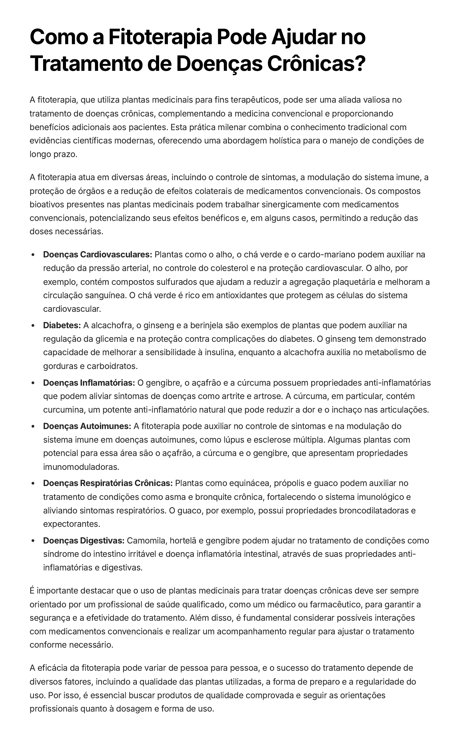 Como a Fitoterapia Pode Ajudar no Tratamento de Doenças Crônicas? A fitoterapia, que utiliza plantas medicinais para fins terapêuticos, pode ser uma aliada valiosa no tratamento de doenças crônicas, complementando a medicina convencional e proporcionando benefícios adicionais aos pacientes. Esta prática milenar combina o conhecimento tradicional com evidências científicas modernas, oferecendo uma abordagem holística para o manejo de condições de longo prazo. A fitoterapia atua em diversas áreas, incluindo o controle de sintomas, a modulação do sistema imune, a proteção de órgãos e a redução de efeitos colaterais de medicamentos convencionais. Os compostos bioativos presentes nas plantas medicinais podem trabalhar sinergicamente com medicamentos convencionais, potencializando seus efeitos benéficos e, em alguns casos, permitindo a redução das doses necessárias. Doenças Cardiovasculares: Plantas como o alho, o chá verde e o cardo-mariano podem auxiliar na redução da pressão arterial, no controle do colesterol e na proteção cardiovascular. O alho, por exemplo, contém compostos sulfurados que ajudam a reduzir a agregação plaquetária e melhoram a circulação sanguínea. O chá verde é rico em antioxidantes que protegem as células do sistema cardiovascular. Diabetes: A alcachofra, o ginseng e a berinjela são exemplos de plantas que podem auxiliar na regulação da glicemia e na proteção contra complicações do diabetes. O ginseng tem demonstrado capacidade de melhorar a sensibilidade à insulina, enquanto a alcachofra auxilia no metabolismo de gorduras e carboidratos. Doenças Inflamatórias: O gengibre, o açafrão e a cúrcuma possuem propriedades anti-inflamatórias que podem aliviar sintomas de doenças como artrite e artrose. A cúrcuma, em particular, contém curcumina, um potente anti-inflamatório natural que pode reduzir a dor e o inchaço nas articulações. Doenças Autoimunes: A fitoterapia pode auxiliar no controle de sintomas e na modulação do sistema imune em doenças autoimunes, como lúpus e esclerose múltipla. Algumas plantas com potencial para essa área são o açafrão, a cúrcuma e o gengibre, que apresentam propriedades imunomoduladoras. Doenças Respiratórias Crônicas: Plantas como equinácea, própolis e guaco podem auxiliar no tratamento de condições como asma e bronquite crônica, fortalecendo o sistema imunológico e aliviando sintomas respiratórios. O guaco, por exemplo, possui propriedades broncodilatadoras e expectorantes. Doenças Digestivas: Camomila, hortelã e gengibre podem ajudar no tratamento de condições como síndrome do intestino irritável e doença inflamatória intestinal, através de suas propriedades anti- inflamatórias e digestivas. É importante destacar que o uso de plantas medicinais para tratar doenças crônicas deve ser sempre orientado por um profissional de saúde qualificado, como um médico ou farmacêutico, para garantir a segurança e a efetividade do tratamento. Além disso, é fundamental considerar possíveis interações com medicamentos convencionais e realizar um acompanhamento regular para ajustar o tratamento conforme necessário. A eficácia da fitoterapia pode variar de pessoa para pessoa, e o sucesso do tratamento depende de diversos fatores, incluindo a qualidade das plantas utilizadas, a forma de preparo e a regularidade do uso. Por isso, é essencial buscar produtos de qualidade comprovada e seguir as orientações profissionais quanto à dosagem e forma de uso.