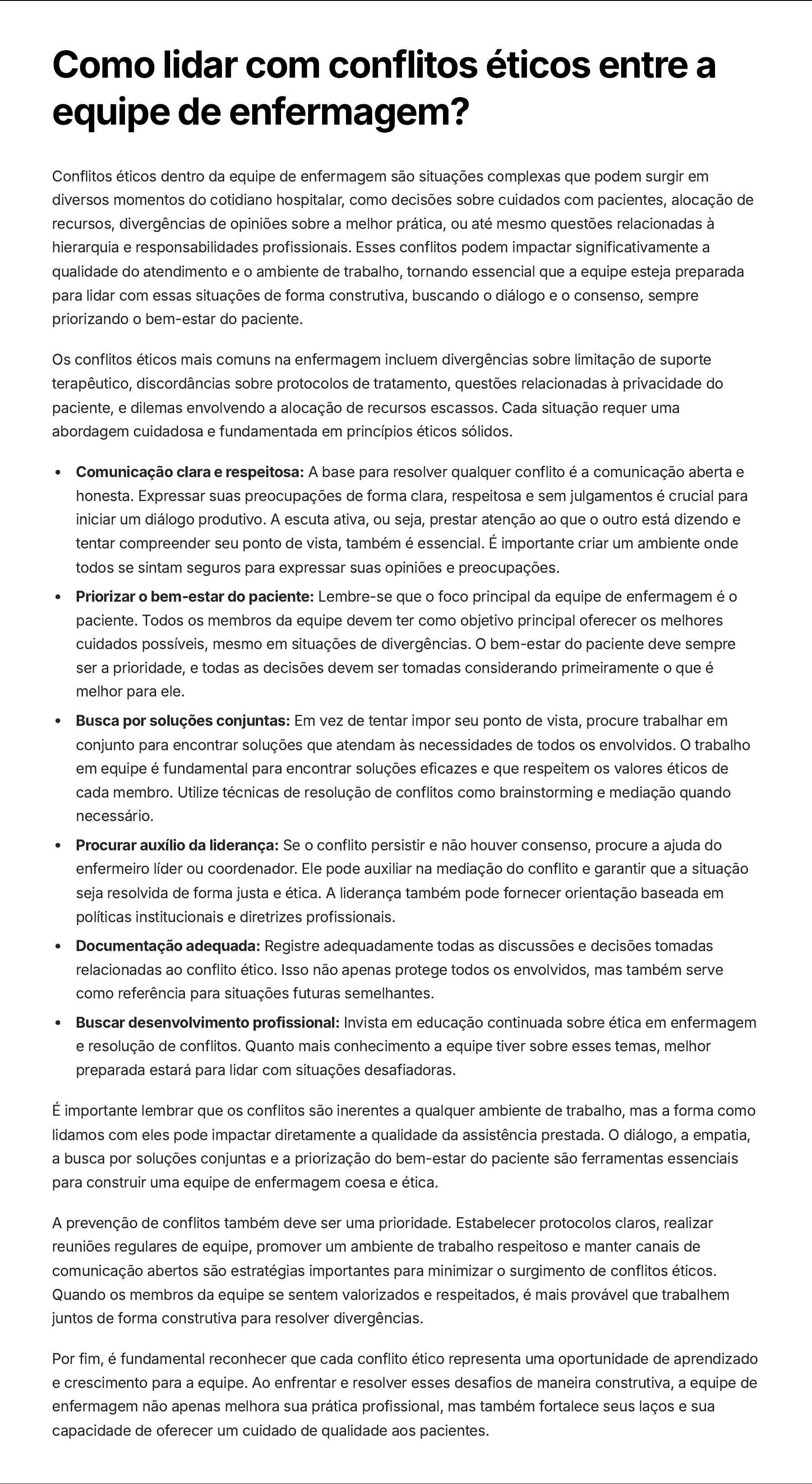 Como lidar com conflitos éticos entre a equipe de enfermagem? Conflitos éticos dentro da equipe de enfermagem são situações complexas que podem surgir em diversos momentos do cotidiano hospitalar, como decisões sobre cuidados com pacientes, alocação de recursos, divergências de opiniões sobre a melhor prática, ou até mesmo questões relacionadas à hierarquia e responsabilidades profissionais. Esses conflitos podem impactar significativamente a qualidade do atendimento e o ambiente de trabalho, tornando essencial que a equipe esteja preparada para lidar com essas situações de forma construtiva, buscando o diálogo e o consenso, sempre priorizando o bem-estar do paciente. Os conflitos éticos mais comuns na enfermagem incluem divergências sobre limitação de suporte terapêutico, discordâncias sobre protocolos de tratamento, questões relacionadas à privacidade do paciente, e dilemas envolvendo a alocação de recursos escassos. Cada situação requer uma abordagem cuidadosa e fundamentada em princípios éticos sólidos. Comunicação clara e respeitosa: A base para resolver qualquer conflito é a comunicação aberta e honesta. Expressar suas preocupações de forma clara, respeitosa e sem julgamentos é crucial para iniciar um diálogo produtivo. A escuta ativa, ou seja, prestar atenção ao que o outro está dizendo e tentar compreender seu ponto de vista, também é essencial. É importante criar um ambiente onde todos se sintam seguros para expressar suas opiniões e preocupações. Priorizar o bem-estar do paciente: Lembre-se que o foco principal da equipe de enfermagem é o paciente. Todos os membros da equipe devem ter como objetivo principal oferecer os melhores cuidados possíveis, mesmo em situações de divergências. O bem-estar do paciente deve sempre ser a prioridade, e todas as decisões devem ser tomadas considerando primeiramente o que é melhor para ele. Busca por soluções conjuntas: Em vez de tentar impor seu ponto de vista, procure trabalhar em conjunto para encontrar soluções que atendam às necessidades de todos os envolvidos. O trabalho em equipe é fundamental para encontrar soluções eficazes e que respeitem os valores éticos de cada membro. Utilize técnicas de resolução de conflitos como brainstorming e mediação quando necessário. Procurar auxílio da liderança: Se o conflito persistir e não houver consenso, procure a ajuda do enfermeiro líder ou coordenador. Ele pode auxiliar na mediação do conflito e garantir que a situação seja resolvida de forma justa e ética. A liderança também pode fornecer orientação baseada em políticas institucionais e diretrizes profissionais. Documentação adequada: Registre adequadamente todas as discussões e decisões tomadas relacionadas ao conflito ético. Isso não apenas protege todos os envolvidos, mas também serve como referência para situações futuras semelhantes. Buscar desenvolvimento profissional: Invista em educação continuada sobre ética em enfermagem e resolução de conflitos. Quanto mais conhecimento a equipe tiver sobre esses temas, melhor preparada estará para lidar com situações desafiadoras. É importante lembrar que os conflitos são inerentes a qualquer ambiente de trabalho, mas a forma como lidamos com eles pode impactar diretamente a qualidade da assistência prestada. O diálogo, a empatia, a busca por soluções conjuntas e a priorização do bem-estar do paciente são ferramentas essenciais para construir uma equipe de enfermagem coesa e ética. A prevenção de conflitos também deve ser uma prioridade. Estabelecer protocolos claros, realizar reuniões regulares de equipe, promover um ambiente de trabalho respeitoso e manter canais de comunicação abertos são estratégias importantes para minimizar o surgimento de conflitos éticos. Quando os membros da equipe se sentem valorizados e respeitados, é mais provável que trabalhem juntos de forma construtiva para resolver divergências. Por fim, é fundamental reconhecer que cada conflito ético representa uma oportunidade de aprendizado e crescimento para a equipe. Ao enfrentar e resolver esses desafios de maneira construtiva, a equipe de enfermagem não apenas melhora sua prática profissional, mas também fortalece seus laços e sua capacidade de oferecer um cuidado de qualidade aos pacientes.