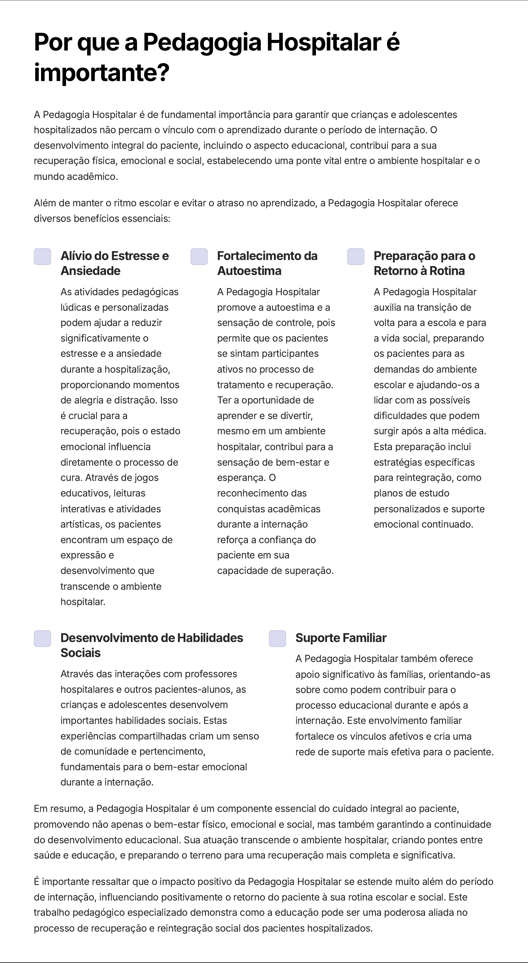 Por que a Pedagogia Hospitalar é importante? A Pedagogia Hospitalar é de fundamental importância para garantir que crianças e adolescentes hospitalizados não percam o vínculo com o aprendizado durante o período de internação. O desenvolvimento integral do paciente, incluindo o aspecto educacional, contribui para a sua recuperação física, emocional e social, estabelecendo uma ponte vital entre o ambiente hospitalar e o mundo acadêmico. Além de manter o ritmo escolar e evitar o atraso no aprendizado, a Pedagogia Hospitalar oferece diversos benefícios essenciais: Alívio do Estresse e Ansiedade As atividades pedagógicas lúdicas e personalizadas podem ajudar a reduzir significativamente o estresse e a ansiedade durante a hospitalização, proporcionando momentos de alegria e distração. Isso é crucial para a recuperação, pois o estado emocional influencia diretamente o processo de cura. Através de jogos educativos, leituras interativas e atividades artísticas, os pacientes encontram um espaço de expressão e desenvolvimento que transcende o ambiente hospitalar. Fortalecimento da Autoestima A Pedagogia Hospitalar promove a autoestima e a sensação de controle, pois permite que os pacientes se sintam participantes ativos no processo de tratamento e recuperação. Ter a oportunidade de aprender e se divertir, mesmo em um ambiente hospitalar, contribui para a sensação de bem-estar e esperança. O reconhecimento das conquistas acadêmicas durante a internação reforça a confiança do paciente em sua capacidade de superação. Preparação para o Retorno à Rotina A Pedagogia Hospitalar auxilia na transição de volta para a escola e para a vida social, preparando os pacientes para as demandas do ambiente escolar e ajudando-os a lidar com as possíveis dificuldades que podem surgir após a alta médica. Esta preparação inclui estratégias específicas para reintegração, como planos de estudo personalizados e suporte emocional continuado. Desenvolvimento de Habilidades Sociais Através das interações com professores hospitalares e outros pacientes-alunos, as crianças e adolescentes desenvolvem importantes habilidades sociais. Estas experiências compartilhadas criam um senso de comunidade e pertencimento, fundamentais para o bem-estar emocional durante a internação. Suporte Familiar A Pedagogia Hospitalar também oferece apoio significativo às famílias, orientando-as sobre como podem contribuir para o processo educacional durante e após a internação. Este envolvimento familiar fortalece os vínculos afetivos e cria uma rede de suporte mais efetiva para o paciente. Em resumo, a Pedagogia Hospitalar é um componente essencial do cuidado integral ao paciente, promovendo não apenas o bem-estar físico, emocional e social, mas também garantindo a continuidade do desenvolvimento educacional. Sua atuação transcende o ambiente hospitalar, criando pontes entre saúde e educação, e preparando o terreno para uma recuperação mais completa e significativa. É importante ressaltar que o impacto positivo da Pedagogia Hospitalar se estende muito além do período de internação, influenciando positivamente o retorno do paciente à sua rotina escolar e social. Este trabalho pedagógico especializado demonstra como a educação pode ser uma poderosa aliada no processo de recuperação e reintegração social dos pacientes hospitalizados.