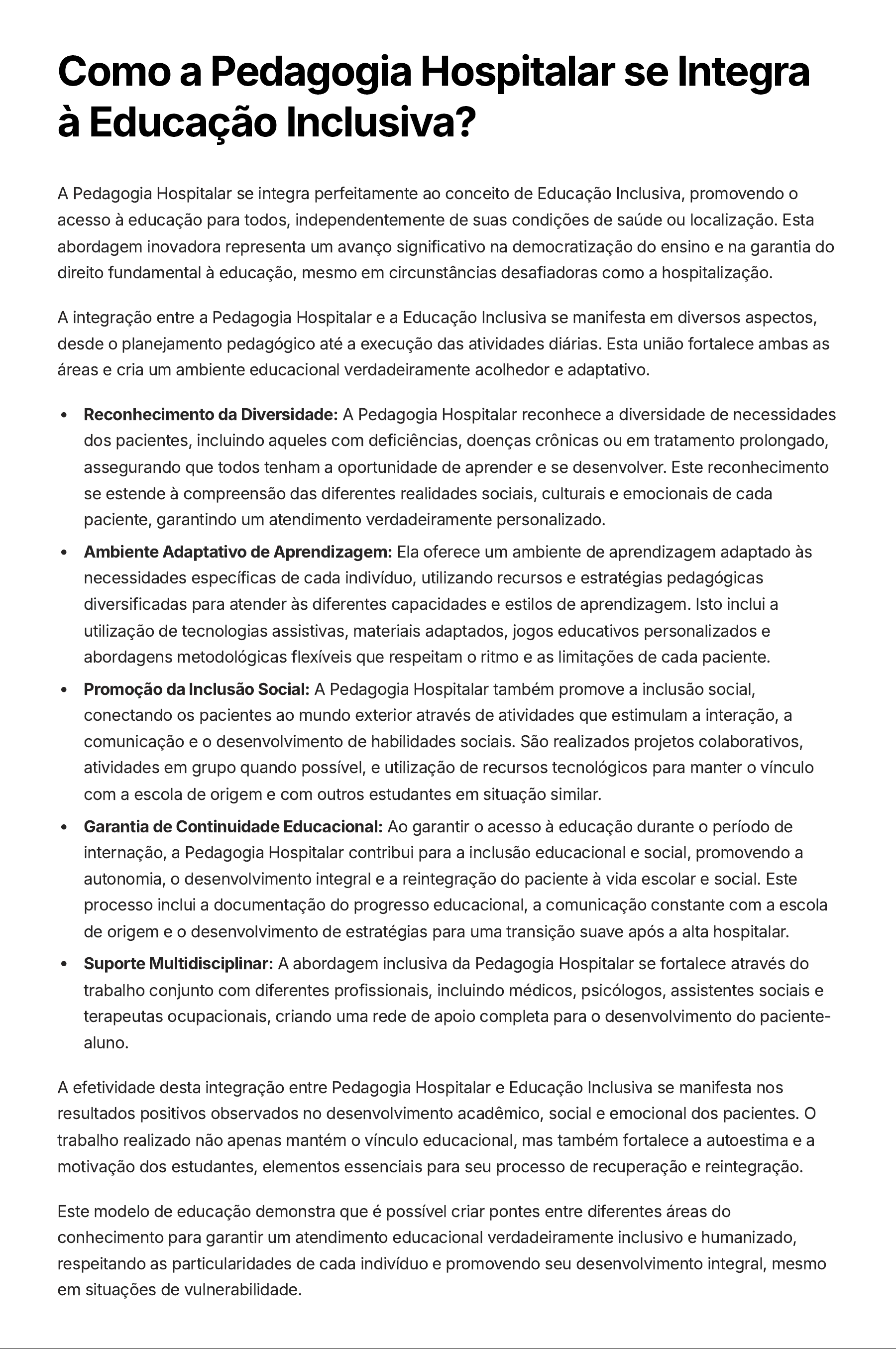 Como a Pedagogia Hospitalar se Integra à Educação Inclusiva? A Pedagogia Hospitalar se integra perfeitamente ao conceito de Educação Inclusiva, promovendo o acesso à educação para todos, independentemente de suas condições de saúde ou localização. Esta abordagem inovadora representa um avanço significativo na democratização do ensino e na garantia do direito fundamental à educação, mesmo em circunstâncias desafiadoras como a hospitalização. A integração entre a Pedagogia Hospitalar e a Educação Inclusiva se manifesta em diversos aspectos, desde o planejamento pedagógico até a execução das atividades diárias. Esta união fortalece ambas as áreas e cria um ambiente educacional verdadeiramente acolhedor e adaptativo. Reconhecimento da Diversidade: A Pedagogia Hospitalar reconhece a diversidade de necessidades dos pacientes, incluindo aqueles com deficiências, doenças crônicas ou em tratamento prolongado, assegurando que todos tenham a oportunidade de aprender e se desenvolver. Este reconhecimento se estende à compreensão das diferentes realidades sociais, culturais e emocionais de cada paciente, garantindo um atendimento verdadeiramente personalizado. Ambiente Adaptativo de Aprendizagem: Ela oferece um ambiente de aprendizagem adaptado às necessidades específicas de cada indivíduo, utilizando recursos e estratégias pedagógicas diversificadas para atender às diferentes capacidades e estilos de aprendizagem. Isto inclui a utilização de tecnologias assistivas, materiais adaptados, jogos educativos personalizados e abordagens metodológicas flexíveis que respeitam o ritmo e as limitações de cada paciente. Promoção da Inclusão Social: A Pedagogia Hospitalar também promove a inclusão social, conectando os pacientes ao mundo exterior através de atividades que estimulam a interação, a comunicação e o desenvolvimento de habilidades sociais. São realizados projetos colaborativos, atividades em grupo quando possível, e utilização de recursos tecnológicos para manter o vínculo com a escola de origem e com outros estudantes em situação similar. Garantia de Continuidade Educacional: Ao garantir o acesso à educação durante o período de internação, a Pedagogia Hospitalar contribui para a inclusão educacional e social, promovendo a autonomia, o desenvolvimento integral e a reintegração do paciente à vida escolar e social. Este processo inclui a documentação do progresso educacional, a comunicação constante com a escola de origem e o desenvolvimento de estratégias para uma transição suave após a alta hospitalar. Suporte Multidisciplinar: A abordagem inclusiva da Pedagogia Hospitalar se fortalece através do trabalho conjunto com diferentes profissionais, incluindo médicos, psicólogos, assistentes sociais e terapeutas ocupacionais, criando uma rede de apoio completa para o desenvolvimento do paciente- aluno. A efetividade desta integração entre Pedagogia Hospitalar e Educação Inclusiva se manifesta nos resultados positivos observados no desenvolvimento acadêmico, social e emocional dos pacientes. O trabalho realizado não apenas mantém o vínculo educacional, mas também fortalece a autoestima e a motivação dos estudantes, elementos essenciais para seu processo de recuperação e reintegração. Este modelo de educação demonstra que é possível criar pontes entre diferentes áreas do conhecimento para garantir um atendimento educacional verdadeiramente inclusivo e humanizado, respeitando as particularidades de cada indivíduo e promovendo seu desenvolvimento integral, mesmo em situações de vulnerabilidade.