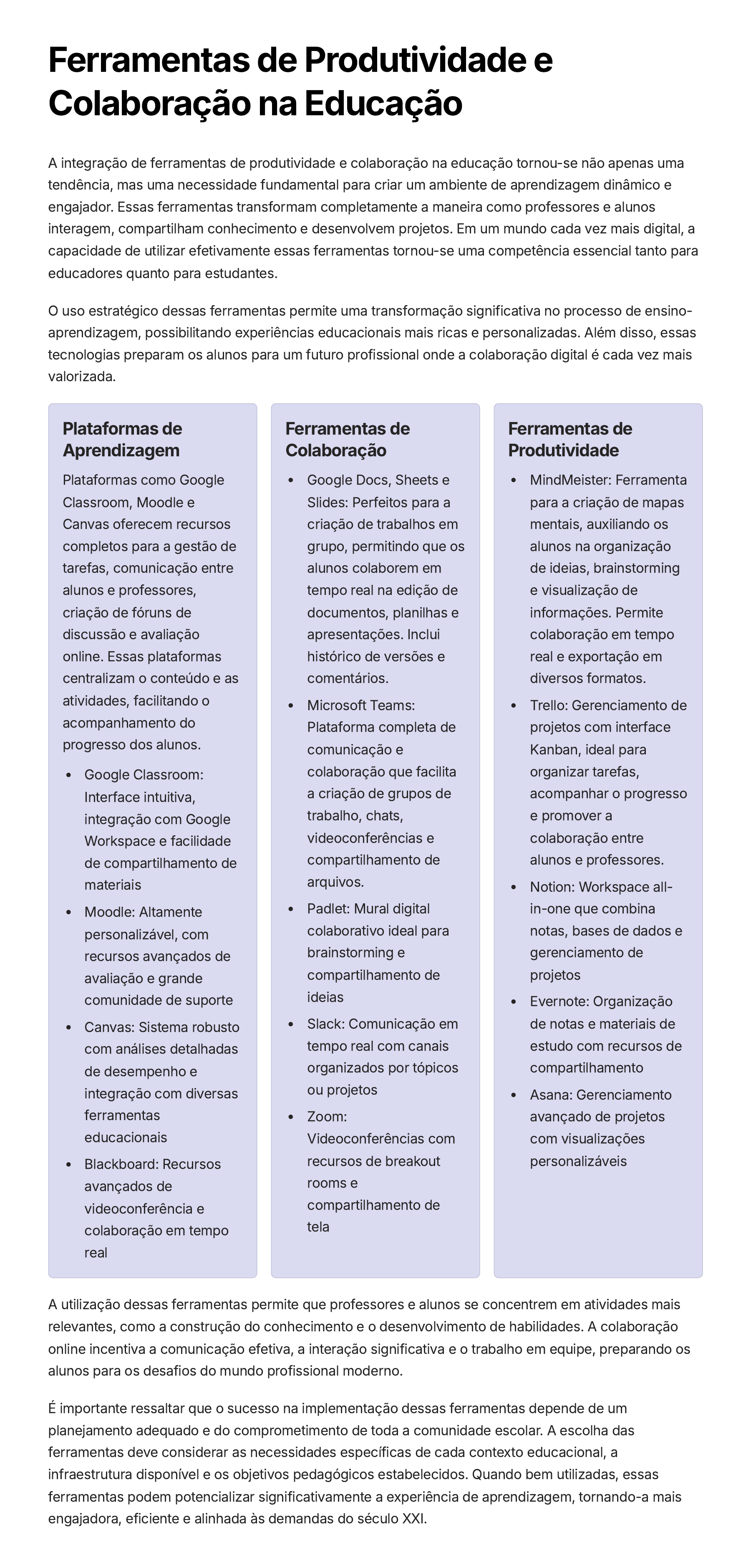 Ferramentas de Produtividade e Colaboração na Educação A integração de ferramentas de produtividade e colaboração na educação tornou-se não apenas uma tendência, mas uma necessidade fundamental para criar um ambiente de aprendizagem dinâmico e engajador. Essas ferramentas transformam completamente a maneira como professores e alunos interagem, compartilham conhecimento e desenvolvem projetos. Em um mundo cada vez mais digital, a capacidade de utilizar efetivamente essas ferramentas tornou-se uma competência essencial tanto para educadores quanto para estudantes. O uso estratégico dessas ferramentas permite uma transformação significativa no processo de ensino- aprendizagem, possibilitando experiências educacionais mais ricas e personalizadas. Além disso, essas tecnologias preparam os alunos para um futuro profissional onde a colaboração digital é cada vez mais valorizada. Plataformas de Aprendizagem Plataformas como Google Classroom, Moodle e Canvas oferecem recursos completos para a gestão de tarefas, comunicação entre alunos e professores, criação de fóruns de discussão e avaliação online. Essas plataformas centralizam o conteúdo e as atividades, facilitando o acompanhamento do progresso dos alunos. Google Classroom: Interface intuitiva, integração com Google Workspace e facilidade de compartilhamento de materiais Moodle: Altamente personalizável, com recursos avançados de avaliação e grande comunidade de suporte Canvas: Sistema robusto com análises detalhadas de desempenho e integração com diversas ferramentas educacionais Blackboard: Recursos avançados de videoconferência e colaboração em tempo real Ferramentas de Colaboração Google Docs, Sheets e Slides: Perfeitos para a criação de trabalhos em grupo, permitindo que os alunos colaborem em tempo real na edição de documentos, planilhas e apresentações. Inclui histórico de versões e comentários. Microsoft Teams: Plataforma completa de comunicação e colaboração que facilita a criação de grupos de trabalho, chats, videoconferências e compartilhamento de arquivos. Padlet: Mural digital colaborativo ideal para brainstorming e compartilhamento de ideias Slack: Comunicação em tempo real com canais organizados por tópicos ou projetos Zoom: Videoconferências com recursos de breakout rooms e compartilhamento de tela Ferramentas de Produtividade MindMeister: Ferramenta para a criação de mapas mentais, auxiliando os alunos na organização de ideias, brainstorming e visualização de informações. Permite colaboração em tempo real e exportação em diversos formatos. Trello: Gerenciamento de projetos com interface Kanban, ideal para organizar tarefas, acompanhar o progresso e promover a colaboração entre alunos e professores. Notion: Workspace all- in-one que combina notas, bases de dados e gerenciamento de projetos Evernote: Organização de notas e materiais de estudo com recursos de compartilhamento Asana: Gerenciamento avançado de projetos com visualizações personalizáveis A utilização dessas ferramentas permite que professores e alunos se concentrem em atividades mais relevantes, como a construção do conhecimento e o desenvolvimento de habilidades. A colaboração online incentiva a comunicação efetiva, a interação significativa e o trabalho em equipe, preparando os alunos para os desafios do mundo profissional moderno. É importante ressaltar que o sucesso na implementação dessas ferramentas depende de um planejamento adequado e do comprometimento de toda a comunidade escolar. A escolha das ferramentas deve considerar as necessidades específicas de cada contexto educacional, a infraestrutura disponível e os objetivos pedagógicos estabelecidos. Quando bem utilizadas, essas ferramentas podem potencializar significativamente a experiência de aprendizagem, tornando-a mais engajadora, eficiente e alinhada às demandas do século XXI.