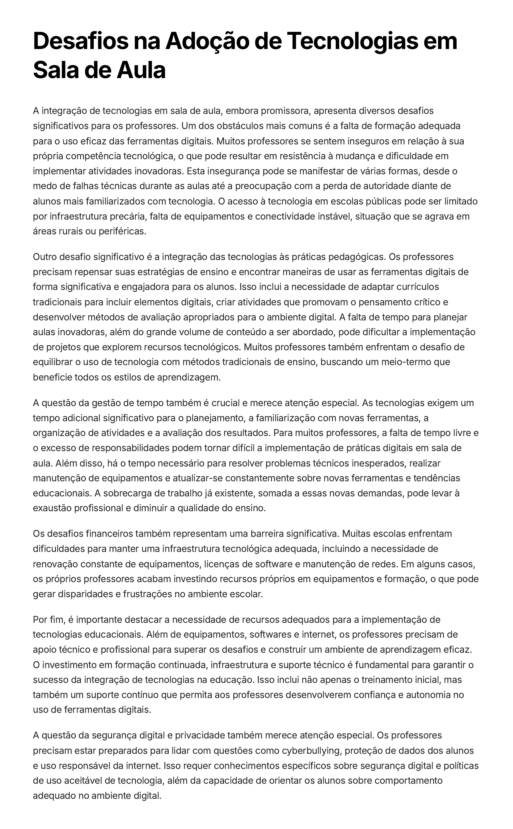 Desafios na Adoção de Tecnologias em Sala de Aula A integração de tecnologias em sala de aula, embora promissora, apresenta diversos desafios significativos para os professores. Um dos obstáculos mais comuns é a falta de formação adequada para o uso eficaz das ferramentas digitais. Muitos professores se sentem inseguros em relação à sua própria competência tecnológica, o que pode resultar em resistência à mudança e dificuldade em implementar atividades inovadoras. Esta insegurança pode se manifestar de várias formas, desde o medo de falhas técnicas durante as aulas até a preocupação com a perda de autoridade diante de alunos mais familiarizados com tecnologia. O acesso à tecnologia em escolas públicas pode ser limitado por infraestrutura precária, falta de equipamentos e conectividade instável, situação que se agrava em áreas rurais ou periféricas. Outro desafio significativo é a integração das tecnologias às práticas pedagógicas. Os professores precisam repensar suas estratégias de ensino e encontrar maneiras de usar as ferramentas digitais de forma significativa e engajadora para os alunos. Isso inclui a necessidade de adaptar currículos tradicionais para incluir elementos digitais, criar atividades que promovam o pensamento crítico e desenvolver métodos de avaliação apropriados para o ambiente digital. A falta de tempo para planejar aulas inovadoras, além do grande volume de conteúdo a ser abordado, pode dificultar a implementação de projetos que explorem recursos tecnológicos. Muitos professores também enfrentam o desafio de equilibrar o uso de tecnologia com métodos tradicionais de ensino, buscando um meio-termo que beneficie todos os estilos de aprendizagem. A questão da gestão de tempo também é crucial e merece atenção especial. As tecnologias exigem um tempo adicional significativo para o planejamento, a familiarização com novas ferramentas, a organização de atividades e a avaliação dos resultados. Para muitos professores, a falta de tempo livre e o excesso de responsabilidades podem tornar difícil a implementação de práticas digitais em sala de aula. Além disso, há o tempo necessário para resolver problemas técnicos inesperados, realizar manutenção de equipamentos e atualizar-se constantemente sobre novas ferramentas e tendências educacionais. A sobrecarga de trabalho já existente, somada a essas novas demandas, pode levar à exaustão profissional e diminuir a qualidade do ensino. Os desafios financeiros também representam uma barreira significativa. Muitas escolas enfrentam dificuldades para manter uma infraestrutura tecnológica adequada, incluindo a necessidade de renovação constante de equipamentos, licenças de software e manutenção de redes. Em alguns casos, os próprios professores acabam investindo recursos próprios em equipamentos e formação, o que pode gerar disparidades e frustrações no ambiente escolar. Por fim, é importante destacar a necessidade de recursos adequados para a implementação de tecnologias educacionais. Além de equipamentos, softwares e internet, os professores precisam de apoio técnico e profissional para superar os desafios e construir um ambiente de aprendizagem eficaz. O investimento em formação continuada, infraestrutura e suporte técnico é fundamental para garantir o sucesso da integração de tecnologias na educação. Isso inclui não apenas o treinamento inicial, mas também um suporte contínuo que permita aos professores desenvolverem confiança e autonomia no uso de ferramentas digitais. A questão da segurança digital e privacidade também merece atenção especial. Os professores precisam estar preparados para lidar com questões como cyberbullying, proteção de dados dos alunos e uso responsável da internet. Isso requer conhecimentos específicos sobre segurança digital e políticas de uso aceitável de tecnologia, além da capacidade de orientar os alunos sobre comportamento adequado no ambiente digital.