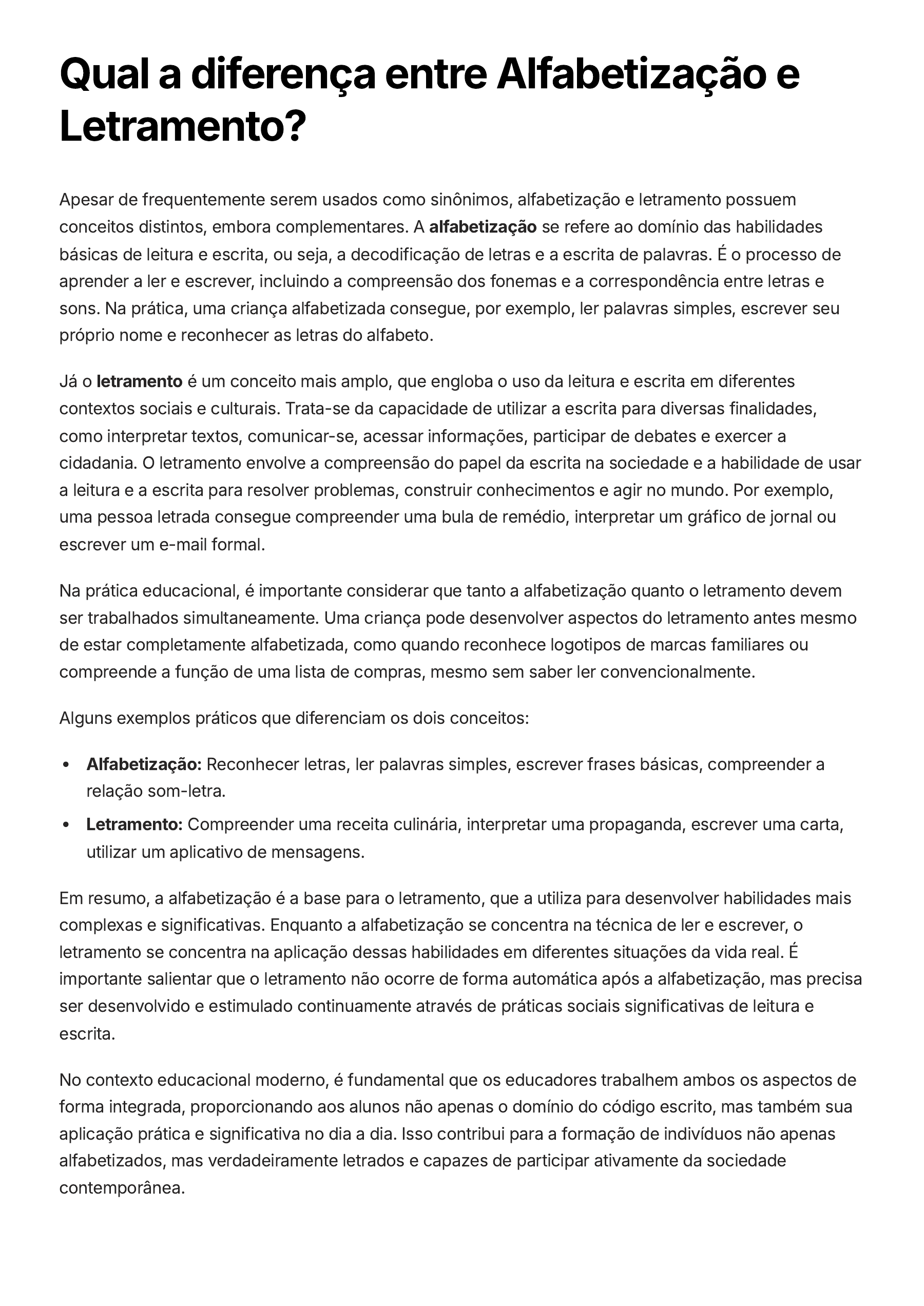 Qual a diferença entre Alfabetização e Letramento? Apesar de frequentemente serem usados como sinônimos, alfabetização e letramento possuem conceitos distintos, embora complementares. A alfabetização se refere ao domínio das habilidades básicas de leitura e escrita, ou seja, a decodificação de letras e a escrita de palavras. É o processo de aprender a ler e escrever, incluindo a compreensão dos fonemas e a correspondência entre letras e sons. Na prática, uma criança alfabetizada consegue, por exemplo, ler palavras simples, escrever seu próprio nome e reconhecer as letras do alfabeto. Já o letramento é um conceito mais amplo, que engloba o uso da leitura e escrita em diferentes contextos sociais e culturais. Trata-se da capacidade de utilizar a escrita para diversas finalidades, como interpretar textos, comunicar-se, acessar informações, participar de debates e exercer a cidadania. O letramento envolve a compreensão do papel da escrita na sociedade e a habilidade de usar a leitura e a escrita para resolver problemas, construir conhecimentos e agir no mundo. Por exemplo, uma pessoa letrada consegue compreender uma bula de remédio, interpretar um gráfico de jornal ou escrever um e-mail formal. Na prática educacional, é importante considerar que tanto a alfabetização quanto o letramento devem ser trabalhados simultaneamente. Uma criança pode desenvolver aspectos do letramento antes mesmo de estar completamente alfabetizada, como quando reconhece logotipos de marcas familiares ou compreende a função de uma lista de compras, mesmo sem saber ler convencionalmente. Alguns exemplos práticos que diferenciam os dois conceitos: Alfabetização: Reconhecer letras, ler palavras simples, escrever frases básicas, compreender a relação som-letra. Letramento: Compreender uma receita culinária, interpretar uma propaganda, escrever uma carta, utilizar um aplicativo de mensagens. Em resumo, a alfabetização é a base para o letramento, que a utiliza para desenvolver habilidades mais complexas e significativas. Enquanto a alfabetização se concentra na técnica de ler e escrever, o letramento se concentra na aplicação dessas habilidades em diferentes situações da vida real. É importante salientar que o letramento não ocorre de forma automática após a alfabetização, mas precisa ser desenvolvido e estimulado continuamente através de práticas sociais significativas de leitura e escrita. No contexto educacional moderno, é fundamental que os educadores trabalhem ambos os aspectos de forma integrada, proporcionando aos alunos não apenas o domínio do código escrito, mas também sua aplicação prática e significativa no dia a dia. Isso contribui para a formação de indivíduos não apenas alfabetizados, mas verdadeiramente letrados e capazes de participar ativamente da sociedade contemporânea.