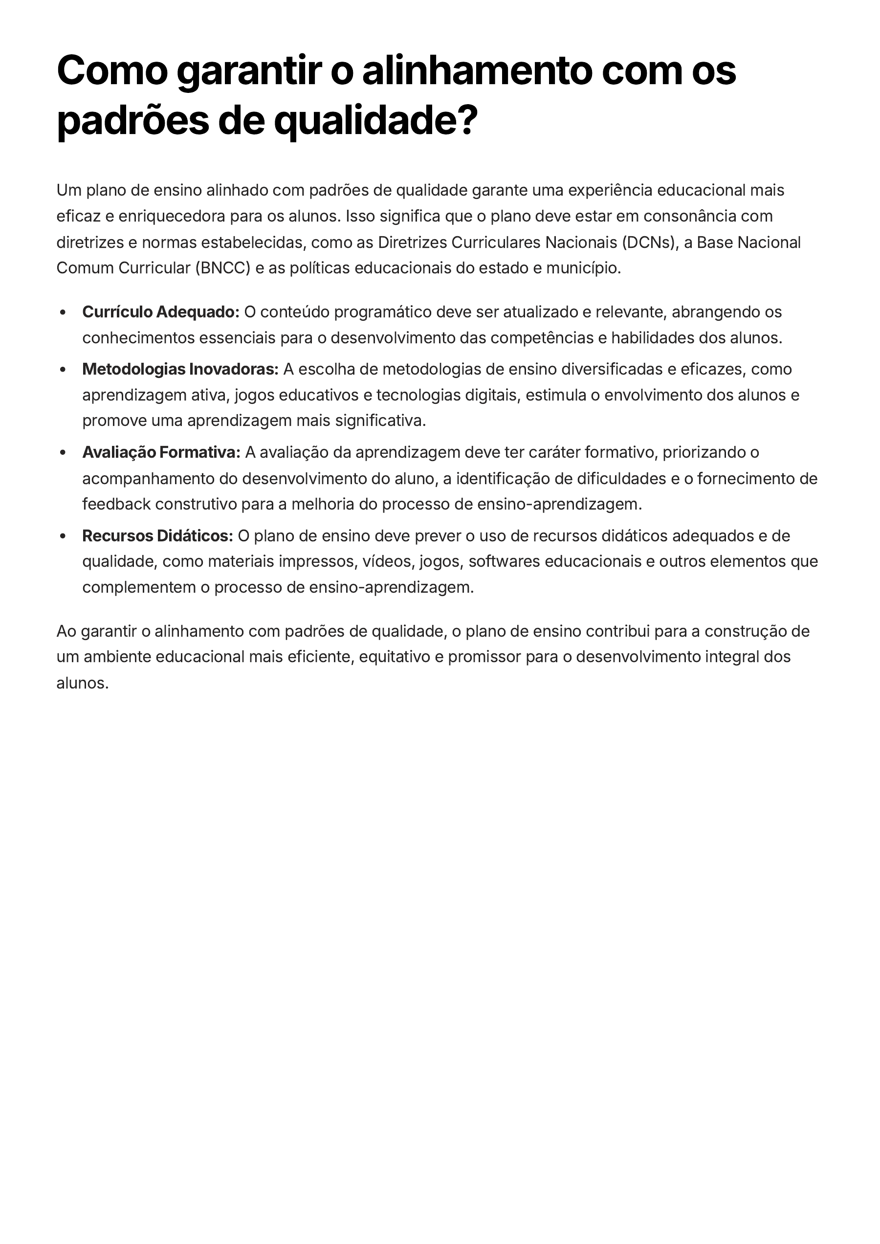Como garantir o alinhamento com os padrões de qualidade? Um plano de ensino alinhado com padrões de qualidade garante uma experiência educacional mais eficaz e enriquecedora para os alunos. Isso significa que o plano deve estar em consonância com diretrizes e normas estabelecidas, como as Diretrizes Curriculares Nacionais (DCNs), a Base Nacional Comum Curricular (BNCC) e as políticas educacionais do estado e município. Currículo Adequado: O conteúdo programático deve ser atualizado e relevante, abrangendo os conhecimentos essenciais para o desenvolvimento das competências e habilidades dos alunos. Metodologias Inovadoras: A escolha de metodologias de ensino diversificadas e eficazes, como aprendizagem ativa, jogos educativos e tecnologias digitais, estimula o envolvimento dos alunos e promove uma aprendizagem mais significativa. Avaliação Formativa: A avaliação da aprendizagem deve ter caráter formativo, priorizando o acompanhamento do desenvolvimento do aluno, a identificação de dificuldades e o fornecimento de feedback construtivo para a melhoria do processo de ensino-aprendizagem. Recursos Didáticos: O plano de ensino deve prever o uso de recursos didáticos adequados e de qualidade, como materiais impressos, vídeos, jogos, softwares educacionais e outros elementos que complementem o processo de ensino-aprendizagem. Ao garantir o alinhamento com padrões de qualidade, o plano de ensino contribui para a construção de um ambiente educacional mais eficiente, equitativo e promissor para o desenvolvimento integral dos alunos. Como atender às necessidades específicas dos alunos em sala de aula? A elaboração de planos de ensino deve considerar a diversidade presente em sala de aula, incluindo alunos com necessidades específicas. Essa atenção garante a inclusão e o acesso à aprendizagem para todos. É fundamental reconhecer que cada aluno possui um ritmo e estilo de aprendizagem próprios, e que algumas necessidades podem demandar adaptações no planejamento. Para atender a essas necessidades, o professor deve: Identificar e analisar as necessidades individuais dos alunos. Desenvolver estratégias de ensino e recursos didáticos adequados. Promover a acessibilidade, garantindo o acesso a recursos e materiais adaptados. Criar um ambiente inclusivo e acolhedor, respeitando a individualidade de cada aluno. Estabelecer comunicação aberta e constante com os pais ou responsáveis. Trabalhar em conjunto com profissionais especializados, como psicopedagogos, psicólogos e especialistas em educação especial. A inclusão de alunos com necessidades específicas no processo de ensino-aprendizagem é um desafio que exige planejamento, sensibilidade e compromisso por parte do professor. As adaptações no plano de ensino devem ser realizadas de forma individualizada, respeitando as características e necessidades de cada aluno, e buscando promover a participação e o desenvolvimento de todos. Como Promover o Desenvolvimento Integral dos Alunos? O plano de ensino deve promover o desenvolvimento integral dos alunos, abrangendo as dimensões cognitiva, socioemocional, física e cultural. Isso significa que o plano deve oferecer oportunidades para os alunos: Desenvolver habilidades cognitivas como pensamento crítico, criatividade, resolução de problemas, comunicação e trabalho em equipe. Fortalecer a autoestima, a empatia, a autogestão, a resiliência e outras habilidades socioemocionais importantes para o bem-estar e o sucesso na vida. Promover a saúde física e o bem-estar por meio de atividades que incentivam a prática de exercícios, uma alimentação saudável e hábitos de higiene. Explorar a cultura, a arte, a história e outras áreas do conhecimento que enriquecem a vida e ampliam o horizonte dos alunos. Um plano de ensino que promove o desenvolvimento integral prepara os alunos para os desafios da vida moderna, capacitando-os a serem cidadãos ativos, responsáveis e capazes de contribuir positivamente para a sociedade.