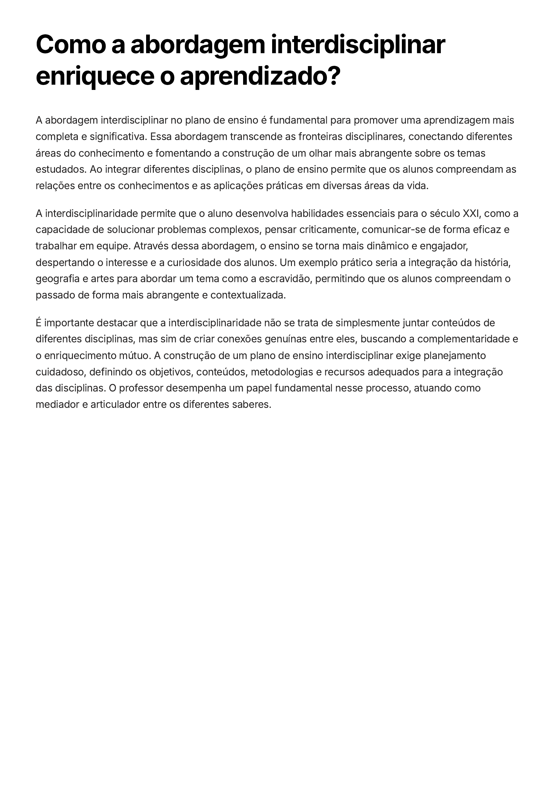 Como a abordagem interdisciplinar enriquece o aprendizado? A abordagem interdisciplinar no plano de ensino é fundamental para promover uma aprendizagem mais completa e significativa. Essa abordagem transcende as fronteiras disciplinares, conectando diferentes áreas do conhecimento e fomentando a construção de um olhar mais abrangente sobre os temas estudados. Ao integrar diferentes disciplinas, o plano de ensino permite que os alunos compreendam as relações entre os conhecimentos e as aplicações práticas em diversas áreas da vida. A interdisciplinaridade permite que o aluno desenvolva habilidades essenciais para o século XXI, como a capacidade de solucionar problemas complexos, pensar criticamente, comunicar-se de forma eficaz e trabalhar em equipe. Através dessa abordagem, o ensino se torna mais dinâmico e engajador, despertando o interesse e a curiosidade dos alunos. Um exemplo prático seria a integração da história, geografia e artes para abordar um tema como a escravidão, permitindo que os alunos compreendam o passado de forma mais abrangente e contextualizada. É importante destacar que a interdisciplinaridade não se trata de simplesmente juntar conteúdos de diferentes disciplinas, mas sim de criar conexões genuínas entre eles, buscando a complementaridade e o enriquecimento mútuo. A construção de um plano de ensino interdisciplinar exige planejamento cuidadoso, definindo os objetivos, conteúdos, metodologias e recursos adequados para a integração das disciplinas. O professor desempenha um papel fundamental nesse processo, atuando como mediador e articulador entre os diferentes saberes. Como implementar estratégias de diferenciação no ensino? As estratégias de diferenciação no planejamento de ensino visam atender às necessidades individuais dos alunos, promovendo a inclusão e o aprendizado personalizado. Ao considerar os diferentes ritmos de aprendizagem, estilos de aprendizado e níveis de conhecimento, o professor cria um ambiente educacional mais equitativo e eficaz. Recursos Didáticos Adaptáveis: Oferecer materiais em diferentes formatos (texto, áudio, vídeo, recursos visuais), além de disponibilizar ferramentas de apoio como legendas, traduções e interpretação de LIBRAS. Atividades Diferenciadas: Adaptar o nível de complexidade das atividades, proporcionar opções de trabalho individual, em grupo ou colaborativo, e oferecer atividades opcionais para aprofundamento ou revisão. Avaliação Flexível: Utilizar diferentes instrumentos de avaliação, como portfólios, trabalhos práticos, projetos, apresentações, testes e autoavaliações. Considerar o processo de aprendizagem e o desenvolvimento de habilidades, além do desempenho em provas. Acompanhamento Individualizado: Monitorar o progresso de cada aluno, oferecer suporte personalizado e adaptar o ensino de acordo com as necessidades e dificuldades específicas. A implementação de estratégias de diferenciação requer planejamento, criatividade e conhecimento aprofundado dos alunos. É importante buscar constante atualização e aprimoramento das práticas pedagógicas para garantir um ensino inclusivo e de qualidade para todos. Como garantir a acessibilidade e inclusão no ambiente educacional? A acessibilidade e a inclusão são pilares fundamentais para a construção de um ambiente de ensino equitativo e de qualidade. O plano de ensino deve contemplar medidas que garantam a participação e o aprendizado de todos os alunos, independentemente de suas necessidades e características. A acessibilidade, nesse contexto, refere-se à criação de condições e recursos que possibilitem a participação plena de alunos com deficiência, transtornos globais do desenvolvimento e altas habilidades/superdotação. É essencial que o plano de ensino inclua adaptações curriculares, recursos pedagógicos específicos, como softwares de acessibilidade e materiais em Braille, além de profissionais capacitados para atender às necessidades desses alunos. A inclusão, por sua vez, vai além da acessibilidade física e engloba a valorização da diversidade, a construção de um ambiente escolar acolhedor e respeitoso com as diferenças, e o desenvolvimento de estratégias pedagógicas que atendam às necessidades individuais de cada aluno. É preciso considerar as diferentes culturas, idiomas, origens socioeconômicas e níveis de desenvolvimento dos alunos, promovendo a interação e o respeito mútuo. O plano de ensino deve, portanto, ser elaborado com foco na inclusão, buscando criar um ambiente educacional que promova a participação, o desenvolvimento e o aprendizado de todos os alunos, independentemente de suas características.