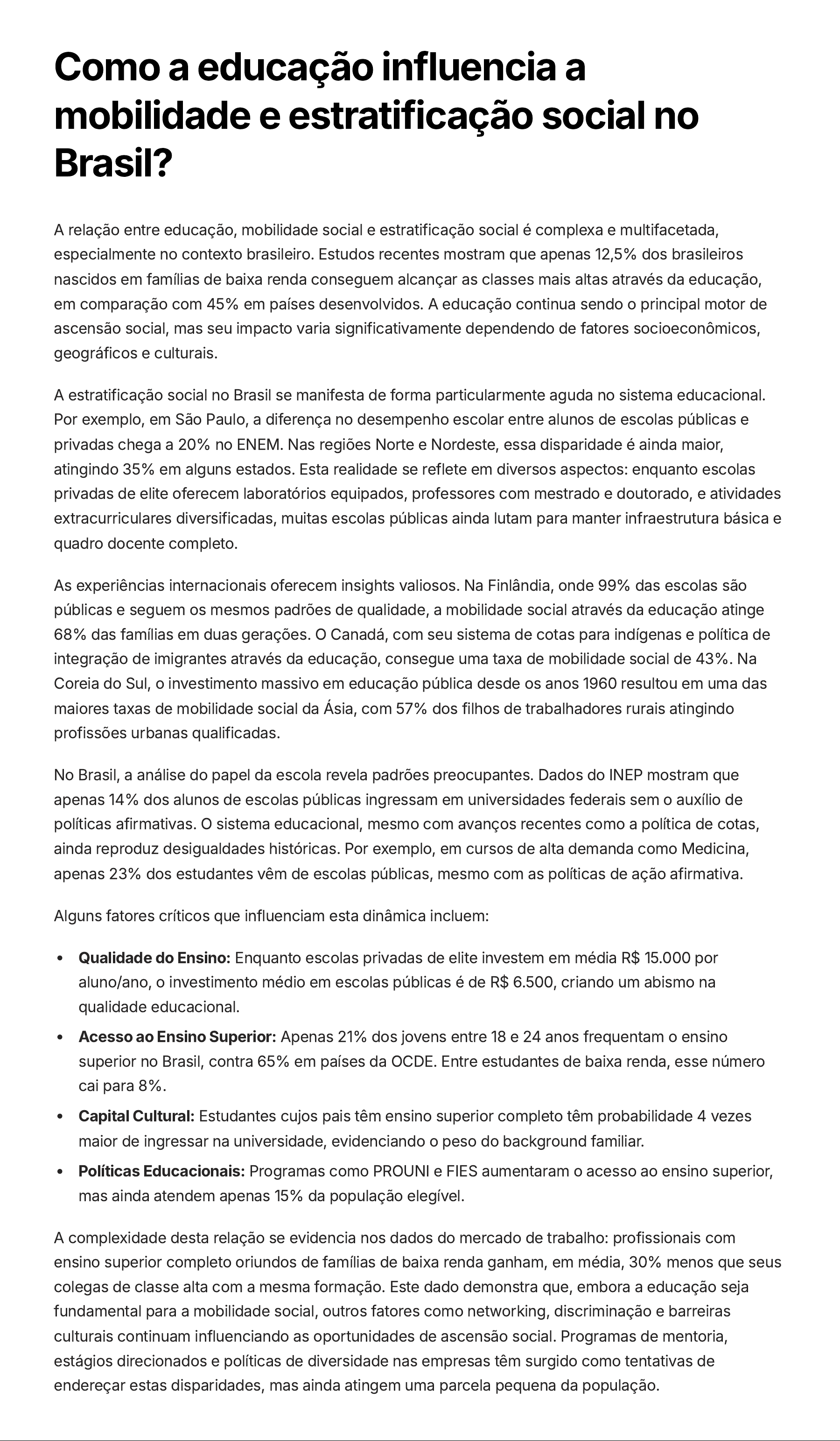 Como a educação influencia a mobilidade e estratificação social no Brasil? A relação entre educação, mobilidade social e estratificação social é complexa e multifacetada, especialmente no contexto brasileiro. Estudos recentes mostram que apenas 12,5% dos brasileiros nascidos em famílias de baixa renda conseguem alcançar as classes mais altas através da educação, em comparação com 45% em países desenvolvidos. A educação continua sendo o principal motor de ascensão social, mas seu impacto varia significativamente dependendo de fatores socioeconômicos, geográficos e culturais. A estratificação social no Brasil se manifesta de forma particularmente aguda no sistema educacional. Por exemplo, em São Paulo, a diferença no desempenho escolar entre alunos de escolas públicas e privadas chega a 20% no ENEM. Nas regiões Norte e Nordeste, essa disparidade é ainda maior, atingindo 35% em alguns estados. Esta realidade se reflete em diversos aspectos: enquanto escolas privadas de elite oferecem laboratórios equipados, professores com mestrado e doutorado, e atividades extracurriculares diversificadas, muitas escolas públicas ainda lutam para manter infraestrutura básica e quadro docente completo. As experiências internacionais oferecem insights valiosos. Na Finlândia, onde 99% das escolas são públicas e seguem os mesmos padrões de qualidade, a mobilidade social através da educação atinge 68% das famílias em duas gerações. O Canadá, com seu sistema de cotas para indígenas e política de integração de imigrantes através da educação, consegue uma taxa de mobilidade social de 43%. Na Coreia do Sul, o investimento massivo em educação pública desde os anos 1960 resultou em uma das maiores taxas de mobilidade social da Ásia, com 57% dos filhos de trabalhadores rurais atingindo profissões urbanas qualificadas. No Brasil, a análise do papel da escola revela padrões preocupantes. Dados do INEP mostram que apenas 14% dos alunos de escolas públicas ingressam em universidades federais sem o auxílio de políticas afirmativas. O sistema educacional, mesmo com avanços recentes como a política de cotas, ainda reproduz desigualdades históricas. Por exemplo, em cursos de alta demanda como Medicina, apenas 23% dos estudantes vêm de escolas públicas, mesmo com as políticas de ação afirmativa. Alguns fatores críticos que influenciam esta dinâmica incluem: Qualidade do Ensino: Enquanto escolas privadas de elite investem em média R$ 15.000 por aluno/ano, o investimento médio em escolas públicas é de R$ 6.500, criando um abismo na qualidade educacional. Acesso ao Ensino Superior: Apenas 21% dos jovens entre 18 e 24 anos frequentam o ensino superior no Brasil, contra 65% em países da OCDE. Entre estudantes de baixa renda, esse número cai para 8%. Capital Cultural: Estudantes cujos pais têm ensino superior completo têm probabilidade 4 vezes maior de ingressar na universidade, evidenciando o peso do background familiar. Políticas Educacionais: Programas como PROUNI e FIES aumentaram o acesso ao ensino superior, mas ainda atendem apenas 15% da população elegível. A complexidade desta relação se evidencia nos dados do mercado de trabalho: profissionais com ensino superior completo oriundos de famílias de baixa renda ganham, em média, 30% menos que seus colegas de classe alta com a mesma formação. Este dado demonstra que, embora a educação seja fundamental para a mobilidade social, outros fatores como networking, discriminação e barreiras culturais continuam influenciando as oportunidades de ascensão social. Programas de mentoria, estágios direcionados e políticas de diversidade nas empresas têm surgido como tentativas de endereçar estas disparidades, mas ainda atingem uma parcela pequena da população.