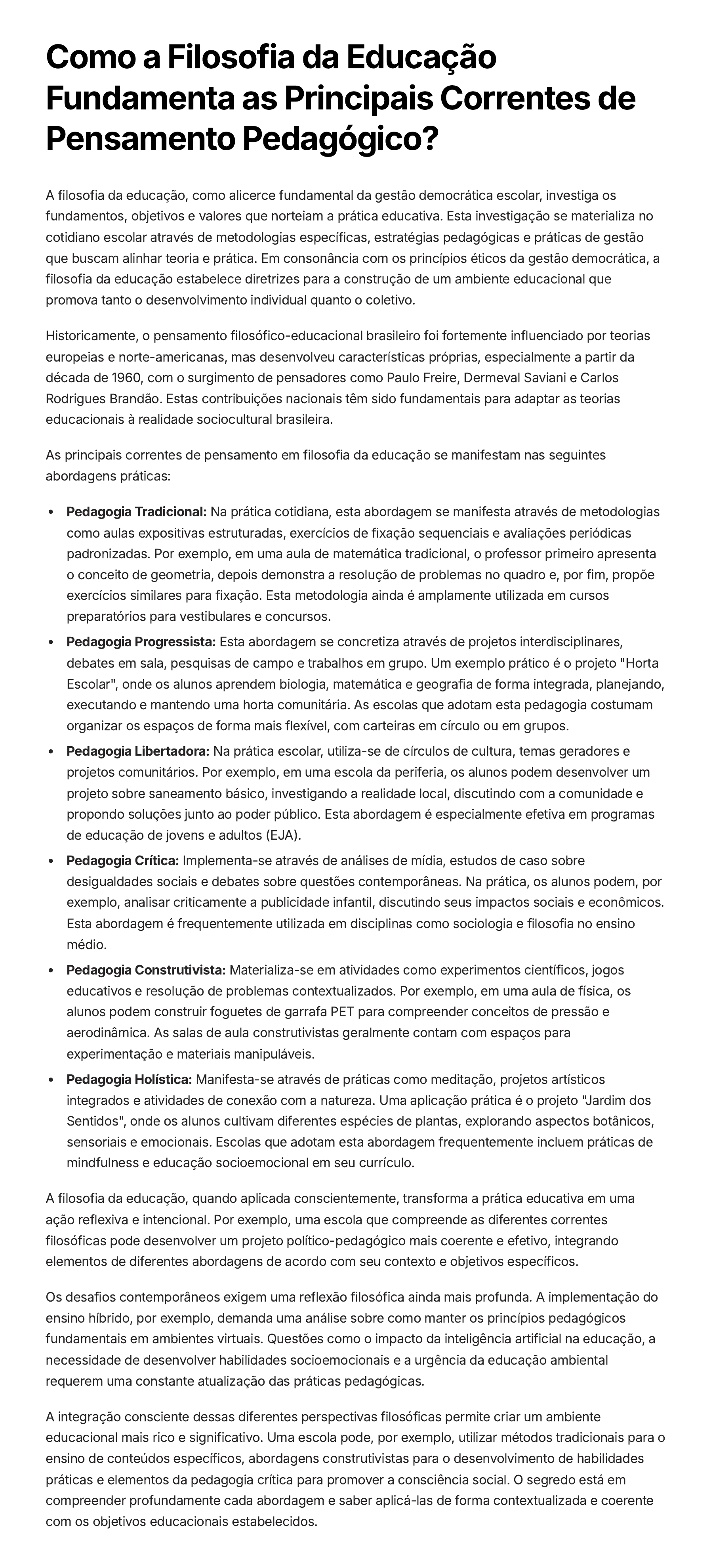 Como a Filosofia da Educação Fundamenta as Principais Correntes de Pensamento Pedagógico? A filosofia da educação, como alicerce fundamental da gestão democrática escolar, investiga os fundamentos, objetivos e valores que norteiam a prática educativa. Esta investigação se materializa no cotidiano escolar através de metodologias específicas, estratégias pedagógicas e práticas de gestão que buscam alinhar teoria e prática. Em consonância com os princípios éticos da gestão democrática, a filosofia da educação estabelece diretrizes para a construção de um ambiente educacional que promova tanto o desenvolvimento individual quanto o coletivo. Historicamente, o pensamento filosófico-educacional brasileiro foi fortemente influenciado por teorias europeias e norte-americanas, mas desenvolveu características próprias, especialmente a partir da década de 1960, com o surgimento de pensadores como Paulo Freire, Dermeval Saviani e Carlos Rodrigues Brandão. Estas contribuições nacionais têm sido fundamentais para adaptar as teorias educacionais à realidade sociocultural brasileira. As principais correntes de pensamento em filosofia da educação se manifestam nas seguintes abordagens práticas: Pedagogia Tradicional: Na prática cotidiana, esta abordagem se manifesta através de metodologias como aulas expositivas estruturadas, exercícios de fixação sequenciais e avaliações periódicas padronizadas. Por exemplo, em uma aula de matemática tradicional, o professor primeiro apresenta o conceito de geometria, depois demonstra a resolução de problemas no quadro e, por fim, propõe exercícios similares para fixação. Esta metodologia ainda é amplamente utilizada em cursos preparatórios para vestibulares e concursos. Pedagogia Progressista: Esta abordagem se concretiza através de projetos interdisciplinares, debates em sala, pesquisas de campo e trabalhos em grupo. Um exemplo prático é o projeto "Horta Escolar", onde os alunos aprendem biologia, matemática e geografia de forma integrada, planejando, executando e mantendo uma horta comunitária. As escolas que adotam esta pedagogia costumam organizar os espaços de forma mais flexível, com carteiras em círculo ou em grupos. Pedagogia Libertadora: Na prática escolar, utiliza-se de círculos de cultura, temas geradores e projetos comunitários. Por exemplo, em uma escola da periferia, os alunos podem desenvolver um projeto sobre saneamento básico, investigando a realidade local, discutindo com a comunidade e propondo soluções junto ao poder público. Esta abordagem é especialmente efetiva em programas de educação de jovens e adultos (EJA). Pedagogia Crítica: Implementa-se através de análises de mídia, estudos de caso sobre desigualdades sociais e debates sobre questões contemporâneas. Na prática, os alunos podem, por exemplo, analisar criticamente a publicidade infantil, discutindo seus impactos sociais e econômicos. Esta abordagem é frequentemente utilizada em disciplinas como sociologia e filosofia no ensino médio. Pedagogia Construtivista: Materializa-se em atividades como experimentos científicos, jogos educativos e resolução de problemas contextualizados. Por exemplo, em uma aula de física, os alunos podem construir foguetes de garrafa PET para compreender conceitos de pressão e aerodinâmica. As salas de aula construtivistas geralmente contam com espaços para experimentação e materiais manipuláveis. Pedagogia Holística: Manifesta-se através de práticas como meditação, projetos artísticos integrados e atividades de conexão com a natureza. Uma aplicação prática é o projeto "Jardim dos Sentidos", onde os alunos cultivam diferentes espécies de plantas, explorando aspectos botânicos, sensoriais e emocionais. Escolas que adotam esta abordagem frequentemente incluem práticas de mindfulness e educação socioemocional em seu currículo. A filosofia da educação, quando aplicada conscientemente, transforma a prática educativa em uma ação reflexiva e intencional. Por exemplo, uma escola que compreende as diferentes correntes filosóficas pode desenvolver um projeto político-pedagógico mais coerente e efetivo, integrando elementos de diferentes abordagens de acordo com seu contexto e objetivos específicos. Os desafios contemporâneos exigem uma reflexão filosófica ainda mais profunda. A implementação do ensino híbrido, por exemplo, demanda uma análise sobre como manter os princípios pedagógicos fundamentais em ambientes virtuais. Questões como o impacto da inteligência artificial na educação, a necessidade de desenvolver habilidades socioemocionais e a urgência da educação ambiental requerem uma constante atualização das práticas pedagógicas. A integração consciente dessas diferentes perspectivas filosóficas permite criar um ambiente educacional mais rico e significativo. Uma escola pode, por exemplo, utilizar métodos tradicionais para o ensino de conteúdos específicos, abordagens construtivistas para o desenvolvimento de habilidades práticas e elementos da pedagogia crítica para promover a consciência social. O segredo está em compreender profundamente cada abordagem e saber aplicá-las de forma contextualizada e coerente com os objetivos educacionais estabelecidos.