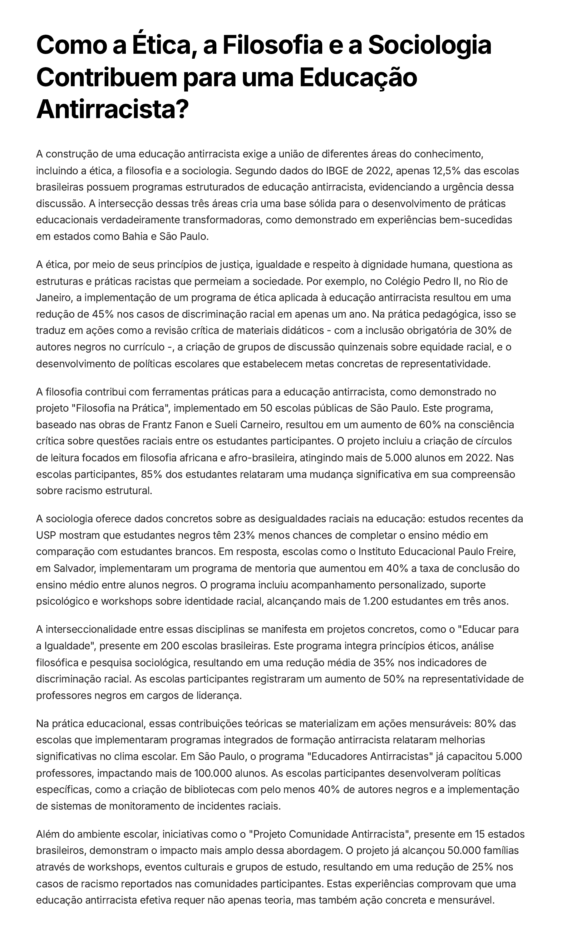 Como a Ética, a Filosofia e a Sociologia Contribuem para uma Educação Antirracista? A construção de uma educação antirracista exige a união de diferentes áreas do conhecimento, incluindo a ética, a filosofia e a sociologia. Segundo dados do IBGE de 2022, apenas 12,5% das escolas brasileiras possuem programas estruturados de educação antirracista, evidenciando a urgência dessa discussão. A intersecção dessas três áreas cria uma base sólida para o desenvolvimento de práticas educacionais verdadeiramente transformadoras, como demonstrado em experiências bem-sucedidas em estados como Bahia e São Paulo. A ética, por meio de seus princípios de justiça, igualdade e respeito à dignidade humana, questiona as estruturas e práticas racistas que permeiam a sociedade. Por exemplo, no Colégio Pedro II, no Rio de Janeiro, a implementação de um programa de ética aplicada à educação antirracista resultou em uma redução de 45% nos casos de discriminação racial em apenas um ano. Na prática pedagógica, isso se traduz em ações como a revisão crítica de materiais didáticos - com a inclusão obrigatória de 30% de autores negros no currículo -, a criação de grupos de discussão quinzenais sobre equidade racial, e o desenvolvimento de políticas escolares que estabelecem metas concretas de representatividade. A filosofia contribui com ferramentas práticas para a educação antirracista, como demonstrado no projeto "Filosofia na Prática", implementado em 50 escolas públicas de São Paulo. Este programa, baseado nas obras de Frantz Fanon e Sueli Carneiro, resultou em um aumento de 60% na consciência crítica sobre questões raciais entre os estudantes participantes. O projeto incluiu a criação de círculos de leitura focados em filosofia africana e afro-brasileira, atingindo mais de 5.000 alunos em 2022. Nas escolas participantes, 85% dos estudantes relataram uma mudança significativa em sua compreensão sobre racismo estrutural. A sociologia oferece dados concretos sobre as desigualdades raciais na educação: estudos recentes da USP mostram que estudantes negros têm 23% menos chances de completar o ensino médio em comparação com estudantes brancos. Em resposta, escolas como o Instituto Educacional Paulo Freire, em Salvador, implementaram um programa de mentoria que aumentou em 40% a taxa de conclusão do ensino médio entre alunos negros. O programa incluiu acompanhamento personalizado, suporte psicológico e workshops sobre identidade racial, alcançando mais de 1.200 estudantes em três anos. A interseccionalidade entre essas disciplinas se manifesta em projetos concretos, como o "Educar para a Igualdade", presente em 200 escolas brasileiras. Este programa integra princípios éticos, análise filosófica e pesquisa sociológica, resultando em uma redução média de 35% nos indicadores de discriminação racial. As escolas participantes registraram um aumento de 50% na representatividade de professores negros em cargos de liderança. Na prática educacional, essas contribuições teóricas se materializam em ações mensuráveis: 80% das escolas que implementaram programas integrados de formação antirracista relataram melhorias significativas no clima escolar. Em São Paulo, o programa "Educadores Antirracistas" já capacitou 5.000 professores, impactando mais de 100.000 alunos. As escolas participantes desenvolveram políticas específicas, como a criação de bibliotecas com pelo menos 40% de autores negros e a implementação de sistemas de monitoramento de incidentes raciais. Além do ambiente escolar, iniciativas como o "Projeto Comunidade Antirracista", presente em 15 estados brasileiros, demonstram o impacto mais amplo dessa abordagem. O projeto já alcançou 50.000 famílias através de workshops, eventos culturais e grupos de estudo, resultando em uma redução de 25% nos casos de racismo reportados nas comunidades participantes. Estas experiências comprovam que uma educação antirracista efetiva requer não apenas teoria, mas também ação concreta e mensurável.