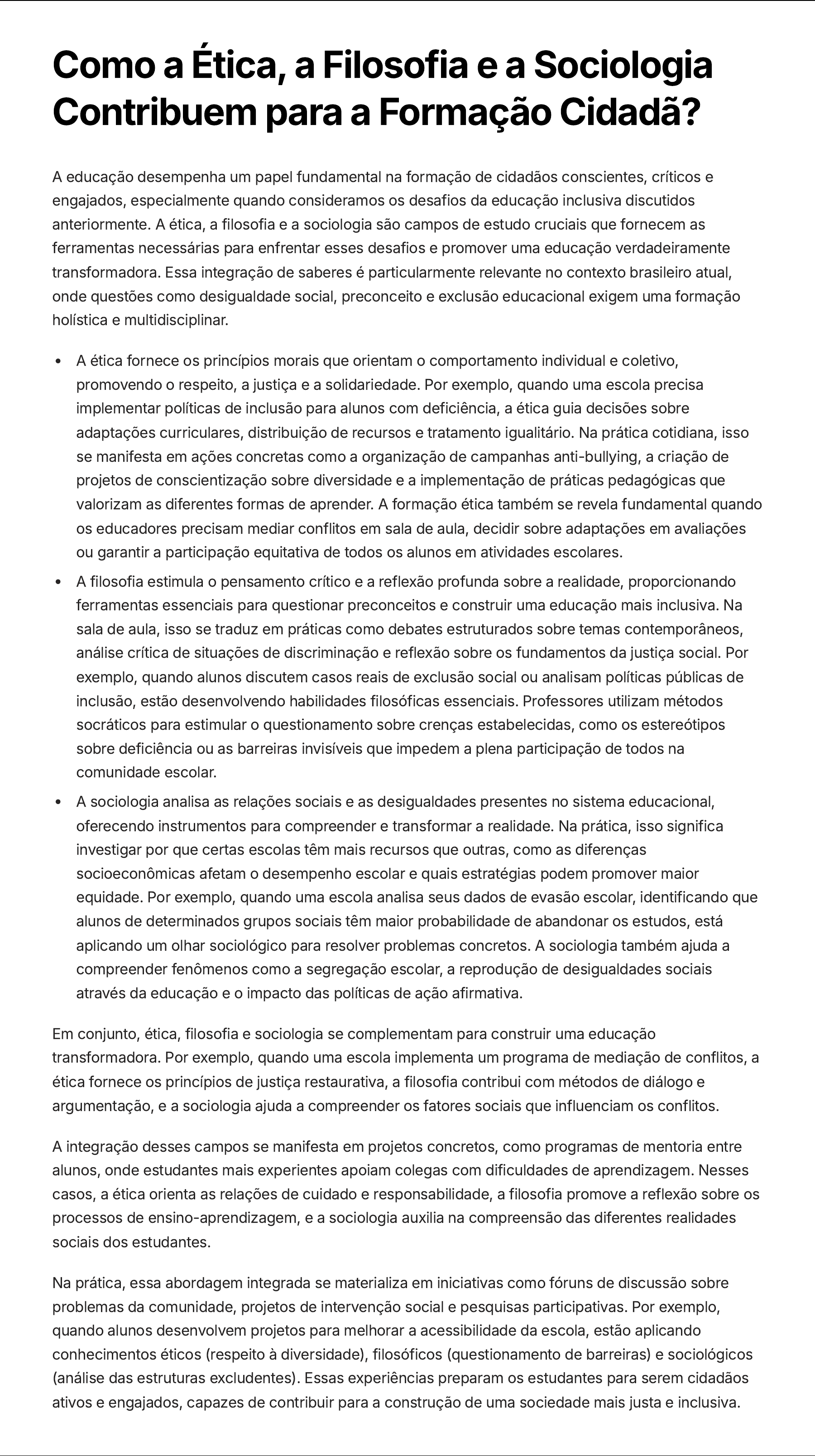 Como a Ética, a Filosofia e a Sociologia Contribuem para a Formação Cidadã? A educação desempenha um papel fundamental na formação de cidadãos conscientes, críticos e engajados, especialmente quando consideramos os desafios da educação inclusiva discutidos anteriormente. A ética, a filosofia e a sociologia são campos de estudo cruciais que fornecem as ferramentas necessárias para enfrentar esses desafios e promover uma educação verdadeiramente transformadora. Essa integração de saberes é particularmente relevante no contexto brasileiro atual, onde questões como desigualdade social, preconceito e exclusão educacional exigem uma formação holística e multidisciplinar. A ética fornece os princípios morais que orientam o comportamento individual e coletivo, promovendo o respeito, a justiça e a solidariedade. Por exemplo, quando uma escola precisa implementar políticas de inclusão para alunos com deficiência, a ética guia decisões sobre adaptações curriculares, distribuição de recursos e tratamento igualitário. Na prática cotidiana, isso se manifesta em ações concretas como a organização de campanhas anti-bullying, a criação de projetos de conscientização sobre diversidade e a implementação de práticas pedagógicas que valorizam as diferentes formas de aprender. A formação ética também se revela fundamental quando os educadores precisam mediar conflitos em sala de aula, decidir sobre adaptações em avaliações ou garantir a participação equitativa de todos os alunos em atividades escolares. A filosofia estimula o pensamento crítico e a reflexão profunda sobre a realidade, proporcionando ferramentas essenciais para questionar preconceitos e construir uma educação mais inclusiva. Na sala de aula, isso se traduz em práticas como debates estruturados sobre temas contemporâneos, análise crítica de situações de discriminação e reflexão sobre os fundamentos da justiça social. Por exemplo, quando alunos discutem casos reais de exclusão social ou analisam políticas públicas de inclusão, estão desenvolvendo habilidades filosóficas essenciais. Professores utilizam métodos socráticos para estimular o questionamento sobre crenças estabelecidas, como os estereótipos sobre deficiência ou as barreiras invisíveis que impedem a plena participação de todos na comunidade escolar. A sociologia analisa as relações sociais e as desigualdades presentes no sistema educacional, oferecendo instrumentos para compreender e transformar a realidade. Na prática, isso significa investigar por que certas escolas têm mais recursos que outras, como as diferenças socioeconômicas afetam o desempenho escolar e quais estratégias podem promover maior equidade. Por exemplo, quando uma escola analisa seus dados de evasão escolar, identificando que alunos de determinados grupos sociais têm maior probabilidade de abandonar os estudos, está aplicando um olhar sociológico para resolver problemas concretos. A sociologia também ajuda a compreender fenômenos como a segregação escolar, a reprodução de desigualdades sociais através da educação e o impacto das políticas de ação afirmativa. Em conjunto, ética, filosofia e sociologia se complementam para construir uma educação transformadora. Por exemplo, quando uma escola implementa um programa de mediação de conflitos, a ética fornece os princípios de justiça restaurativa, a filosofia contribui com métodos de diálogo e argumentação, e a sociologia ajuda a compreender os fatores sociais que influenciam os conflitos. A integração desses campos se manifesta em projetos concretos, como programas de mentoria entre alunos, onde estudantes mais experientes apoiam colegas com dificuldades de aprendizagem. Nesses casos, a ética orienta as relações de cuidado e responsabilidade, a filosofia promove a reflexão sobre os processos de ensino-aprendizagem, e a sociologia auxilia na compreensão das diferentes realidades sociais dos estudantes. Na prática, essa abordagem integrada se materializa em iniciativas como fóruns de discussão sobre problemas da comunidade, projetos de intervenção social e pesquisas participativas. Por exemplo, quando alunos desenvolvem projetos para melhorar a acessibilidade da escola, estão aplicando conhecimentos éticos (respeito à diversidade), filosóficos (questionamento de barreiras) e sociológicos (análise das estruturas excludentes). Essas experiências preparam os estudantes para serem cidadãos ativos e engajados, capazes de contribuir para a construção de uma sociedade mais justa e inclusiva.