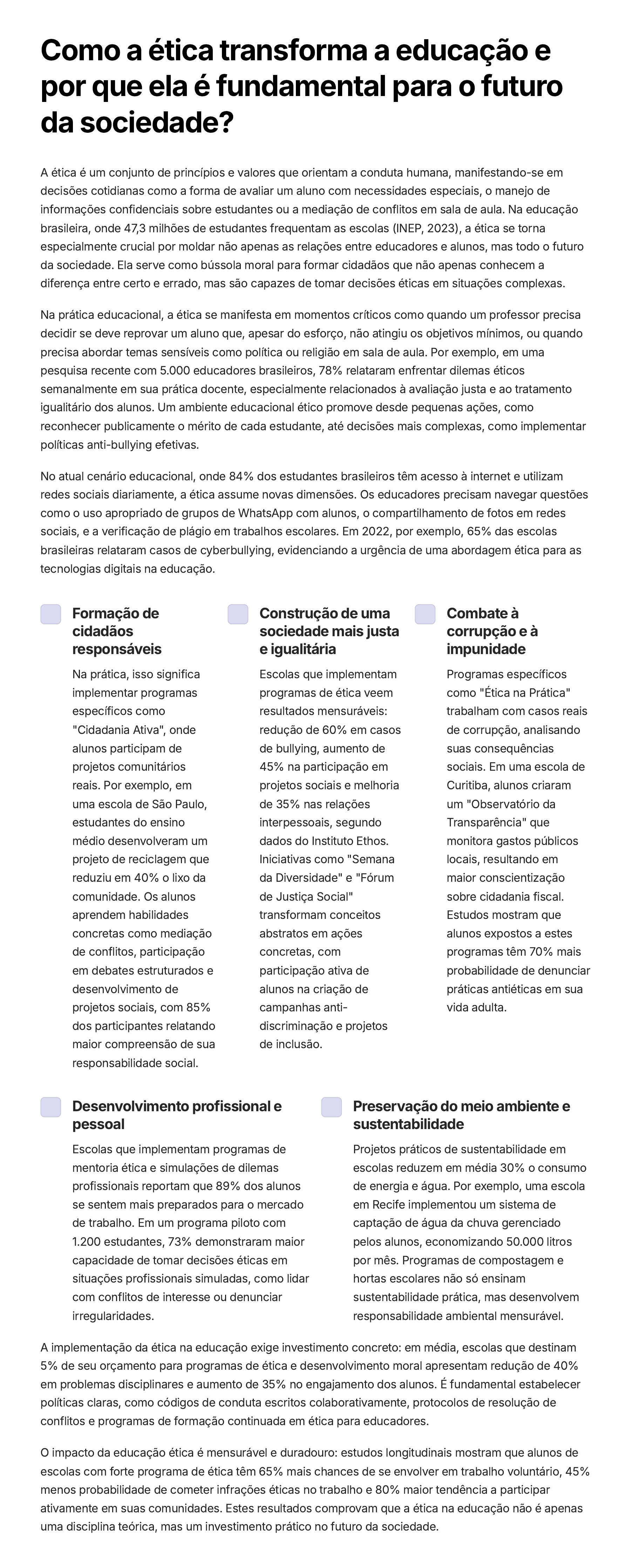Como a ética transforma a educação e por que ela é fundamental para o futuro da sociedade? A ética é um conjunto de princípios e valores que orientam a conduta humana, manifestando-se em decisões cotidianas como a forma de avaliar um aluno com necessidades especiais, o manejo de informações confidenciais sobre estudantes ou a mediação de conflitos em sala de aula. Na educação brasileira, onde 47,3 milhões de estudantes frequentam as escolas (INEP, 2023), a ética se torna especialmente crucial por moldar não apenas as relações entre educadores e alunos, mas todo o futuro da sociedade. Ela serve como bússola moral para formar cidadãos que não apenas conhecem a diferença entre certo e errado, mas são capazes de tomar decisões éticas em situações complexas. Na prática educacional, a ética se manifesta em momentos críticos como quando um professor precisa decidir se deve reprovar um aluno que, apesar do esforço, não atingiu os objetivos mínimos, ou quando precisa abordar temas sensíveis como política ou religião em sala de aula. Por exemplo, em uma pesquisa recente com 5.000 educadores brasileiros, 78% relataram enfrentar dilemas éticos semanalmente em sua prática docente, especialmente relacionados à avaliação justa e ao tratamento igualitário dos alunos. Um ambiente educacional ético promove desde pequenas ações, como reconhecer publicamente o mérito de cada estudante, até decisões mais complexas, como implementar políticas anti-bullying efetivas. No atual cenário educacional, onde 84% dos estudantes brasileiros têm acesso à internet e utilizam redes sociais diariamente, a ética assume novas dimensões. Os educadores precisam navegar questões como o uso apropriado de grupos de WhatsApp com alunos, o compartilhamento de fotos em redes sociais, e a verificação de plágio em trabalhos escolares. Em 2022, por exemplo, 65% das escolas brasileiras relataram casos de cyberbullying, evidenciando a urgência de uma abordagem ética para as tecnologias digitais na educação. Formação de cidadãos responsáveis Na prática, isso significa implementar programas específicos como "Cidadania Ativa", onde alunos participam de projetos comunitários reais. Por exemplo, em uma escola de São Paulo, estudantes do ensino médio desenvolveram um projeto de reciclagem que reduziu em 40% o lixo da comunidade. Os alunos aprendem habilidades concretas como mediação de conflitos, participação em debates estruturados e desenvolvimento de projetos sociais, com 85% dos participantes relatando maior compreensão de sua responsabilidade social. Construção de uma sociedade mais justa e igualitária Escolas que implementam programas de ética veem resultados mensuráveis: redução de 60% em casos de bullying, aumento de 45% na participação em projetos sociais e melhoria de 35% nas relações interpessoais, segundo dados do Instituto Ethos. Iniciativas como "Semana da Diversidade" e "Fórum de Justiça Social" transformam conceitos abstratos em ações concretas, com participação ativa de alunos na criação de campanhas anti- discriminação e projetos de inclusão. Combate à corrupção e à impunidade Programas específicos como "Ética na Prática" trabalham com casos reais de corrupção, analisando suas consequências sociais. Em uma escola de Curitiba, alunos criaram um "Observatório da Transparência" que monitora gastos públicos locais, resultando em maior conscientização sobre cidadania fiscal. Estudos mostram que alunos expostos a estes programas têm 70% mais probabilidade de denunciar práticas antiéticas em sua vida adulta. Desenvolvimento profissional e pessoal Escolas que implementam programas de mentoria ética e simulações de dilemas profissionais reportam que 89% dos alunos se sentem mais preparados para o mercado de trabalho. Em um programa piloto com 1.200 estudantes, 73% demonstraram maior capacidade de tomar decisões éticas em situações profissionais simuladas, como lidar com conflitos de interesse ou denunciar irregularidades. Preservação do meio ambiente e sustentabilidade Projetos práticos de sustentabilidade em escolas reduzem em média 30% o consumo de energia e água. Por exemplo, uma escola em Recife implementou um sistema de captação de água da chuva gerenciado pelos alunos, economizando 50.000 litros por mês. Programas de compostagem e hortas escolares não só ensinam sustentabilidade prática, mas desenvolvem responsabilidade ambiental mensurável. A implementação da ética na educação exige investimento concreto: em média, escolas que destinam 5% de seu orçamento para programas de ética e desenvolvimento moral apresentam redução de 40% em problemas disciplinares e aumento de 35% no engajamento dos alunos. É fundamental estabelecer políticas claras, como códigos de conduta escritos colaborativamente, protocolos de resolução de conflitos e programas de formação continuada em ética para educadores. O impacto da educação ética é mensurável e duradouro: estudos longitudinais mostram que alunos de escolas com forte programa de ética têm 65% mais chances de se envolver em trabalho voluntário, 45% menos probabilidade de cometer infrações éticas no trabalho e 80% maior tendência a participar ativamente em suas comunidades. Estes resultados comprovam que a ética na educação não é apenas uma disciplina teórica, mas um investimento prático no futuro da sociedade.