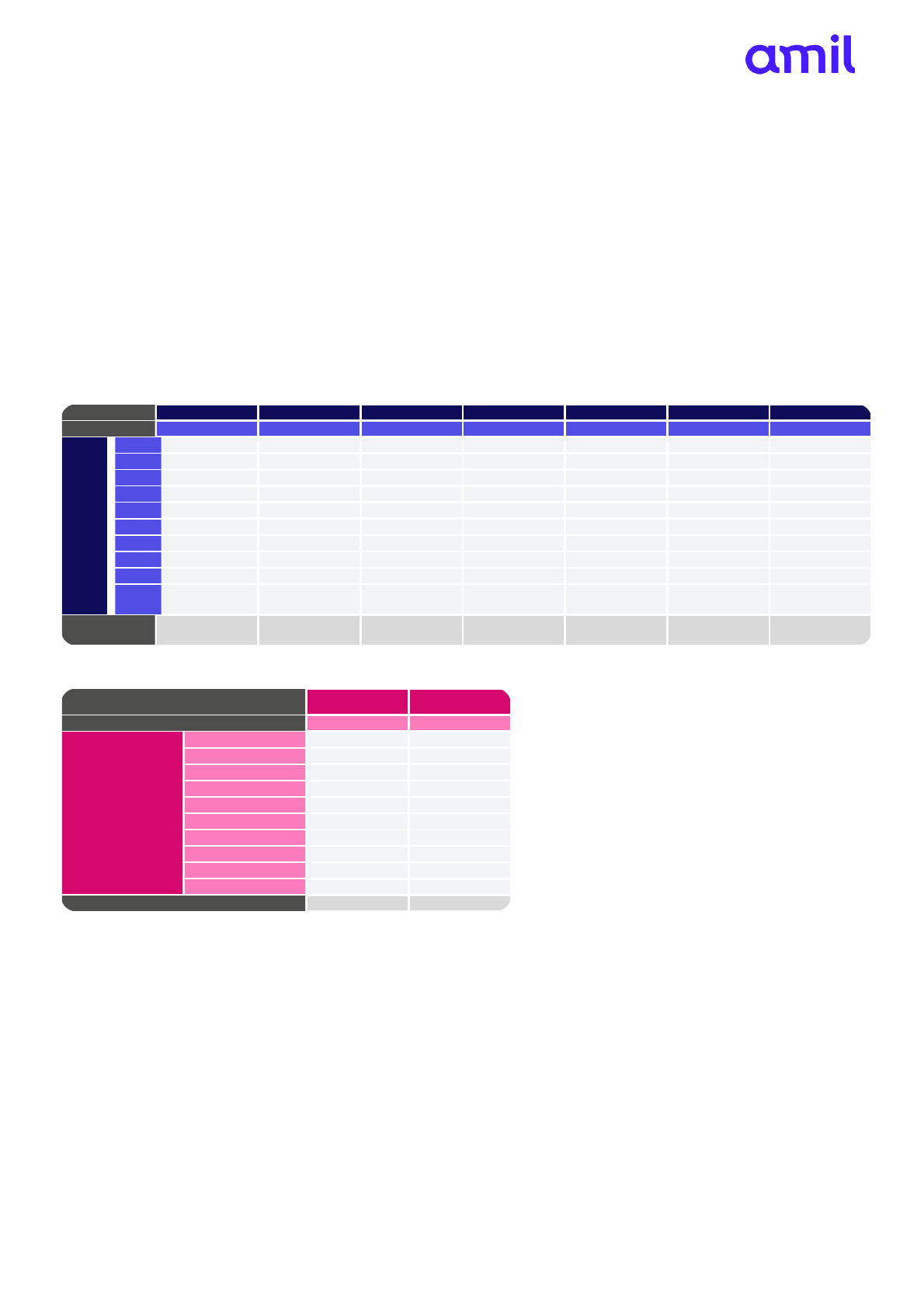 Sempre utilize a versão mais atualizada deste material. Data da impressão: 01/11/2024 Página 1 de 17 Tabela de Preços - Linha Selecionada Planos PME - Porte I - Total de 2 vidas Região: RIO DE JANEIRO Com Coparticipação 30%: Nesta modalidade de coparticipação, o cliente paga uma pequena parte do valor do procedimento que realizar e, com isso, tem uma mensalidade 25% menor se comparado ao plano com coparticipação parcial. Ainda existe um limite máximo a ser pago por procedimento, oferecendo mais segurança e controle para o seu cliente. Compulsório: Contratação obrigatória para 100% do quadro societário e/ou dos funcionários com vinculo empregatício. Não é válido para empresas MEI. Amil S380 Amil S380 Amil S450 Amil S450 Amil S750 R1 Amil S750 R2 Amil S750 R3 QC QP QC QP QP QP QP 196,49 218,10 226,33 251,23 292,87 295,78 319,43 229,89 255,18 264,81 293,93 342,66 346,06 373,73 280,47 311,32 323,06 358,60 418,04 422,19 455,96 336,57 373,58 387,68 430,32 501,65 506,63 547,15 353,39 392,26 407,06 451,84 526,73 531,96 574,51 388,73 431,48 447,77 497,02 579,41 585,16 631,95 485,92 539,35 559,71 621,27 724,27 731,46 789,94 534,51 593,28 615,68 683,40 796,69 804,60 868,93 668,14 741,61 769,60 854,24 995,86 1005,75 1086,17 1169,24 1297,81 1346,80 1494,93 1742,75 1760,07 1900,79 963778 963779 963780 963781 963783 963784 963785 Amil One S2500 R1 Amil One S2500 R2 QP QP 630,03 715,21 737,14 836,80 899,31 1020,90 1079,17 1225,08 1133,13 1286,33 1246,44 1414,97 1558,04 1768,72 1713,85 1945,58 2142,32 2431,98 3749,05 4255,97 963788 963789 Preços e planos válidos de 01/11/2024 até 30/11/2024 e somente da regional de vendas do RIO DE JANEIRO. No boleto dos produtos com coparticipação, serão cobradas a mensalidade do plano e a coparticipação, discriminadamente. Quando da utilização do sistema de livre escolha, a coparticipação será debitada do valor a ser reembolsado. Os valores das tabelas dos planos PME portes I e II são referência. Para ter acesso aos valores exatos, consultar o proposta on-line. Plano Acomodação Faixa Etária 00-18 19-23 24-28 29-33 34-38 39-43 44-48 49-53 54-58 59 ou + Código do Plano Plano Acomodação Faixa Etária 00-18 19-23 24-28 29-33 34-38 39-43 44-48 49-53 54-58 59 ou + Código do Plano Sempre utilize a versão mais atualizada deste material. Data da impressão: 01/11/2024 Página 2 de 17 Livre Adesão: Sem a obrigatoriedade de 100% da população da empresa ser incluída no plano, sejam sócios, administradores e diretores, sejam funcionários. Amil S380 Amil S380 Amil S450 Amil S450 Amil S750 R1 Amil S750 R2 Amil S750 R3 QC QP QC QP QP QP QP 234,81 260,64 270,47 300,22 349,98 353,46 381,73 274,73 304,95 316,45 351,26 409,48 413,54 446,62 335,17 372,04 386,06 428,54 499,57 504,52 544,87 402,20 446,44 463,28 514,24 599,49 605,43 653,84 422,31 468,77 486,44 539,96 629,47 635,71 686,53 464,54 515,64 535,09 593,96 692,42 699,27 755,18 580,68 644,56 668,86 742,45 865,52 874,09 943,97 638,74 709,01 735,75 816,69 952,07 961,50 1038,38 798,43 886,26 919,69 1020,86 1190,10 1201,87 1297,97 1397,25 1550,96 1609,46 1786,51 2082,67 2103,27 2271,45 963778 963779 963780 963781 963783 963784 963785 Amil One S2500 R1 Amil One S2500 R2 QP QP 752,90 854,70 880,90 1000,00 1074,70 1220,00 1289,64 1463,99 1354,12 1537,19 1489,54 1690,91 1861,92 2113,64 2048,11 2325,01 2560,14 2906,26 4480,25 5085,96 963788 963789 Preços e planos válidos de 01/11/2024 até 30/11/2024 e somente da regional de vendas do RIO DE JANEIRO. No boleto dos produtos com coparticipação, serão cobradas a mensalidade do plano e a coparticipação, discriminadamente. Quando da utilização do sistema de livre escolha, a coparticipação será debitada do valor a ser reembolsado. Os valores das tabelas dos planos PME portes I e II são referência. Para ter acesso aos valores exatos, consultar o proposta on-line. Plano Acomodação Faixa Etária 00-18 19-23 24-28 29-33 34-38 39-43 44-48 49-53 54-58 59 ou + Código do Plano Plano Acomodação Faixa Etária 00-18 19-23 24-28 29-33 34-38 39-43 44-48 49-53 54-58 59 ou + Código do Plano Sempre utilize a versão mais atualizada deste material. Data da impressão: 01/11/2024 Página 3 de 17 Planos PME - Porte I - Total de 3 a 4 vidas Região: RIO DE JANEIRO Com Coparticipação 30%: Nesta modalidade de coparticipação, o cliente paga uma pequena parte do valor do procedimento que realizar e, com isso, tem uma mensalidade 25% menor se comparado ao plano com coparticipação parcial. Ainda existe um limite máximo a ser pago por procedimento, oferecendo mais segurança e controle para o seu cliente. Compulsório: Contratação obrigatória para 100% do quadro societário e/ou dos funcionários com vinculo empregatício. Não é válido para empresas MEI. Amil S380 Amil S380 Amil S450 Amil S450 Amil S750 R1 Amil S750 R2 Amil S750 R3 QC QP QC QP QP QP QP 196,49 218,10 226,33 251,23 292,87 295,78 319,43 229,89 255,18 264,81 293,93 342,66 346,06 373,73 280,47 311,32 323,06 358,60 418,04 422,19 455,96 336,57 373,58 387,68 430,32 501,65 506,63 547,15 353,39 392,26 407,06 451,84 526,73 531,96 574,51 388,73 431,48 447,77 497,02 579,41 585,16 631,95 485,92 539,35 559,71 621,27 724,27 731,46 789,94 534,51 593,28 615,68 683,40 796,69 804,60 868,93 668,14 741,61 769,60 854,24 995,86 1005,75 1086,17 1169,24 1297,81 1346,80 1494,93 1742,75 1760,07 1900,79 963778 963779 963780 963781 963783 963784 963785 Amil One S2500 R1 Amil One S2500 R2 QP QP 630,03 715,21 737,14 836,80 899,31 1020,90 1079,17 1225,08 1133,13 1286,33 1246,44 1414,97 1558,04 1768,72 1713,85 1945,58 2142,32 2431,98 3749,05 4255,97 963788 963789 Preços e planos válidos de 01/11/2024 até 30/11/2024 e somente da regional de vendas do RIO DE JANEIRO. No boleto dos produtos com coparticipação, serão cobradas a mensalidade do plano e a coparticipação, discriminadamente. Quando da utilização do sistema de livre escolha, a coparticipação será debitada do valor a ser reembolsado. Os val