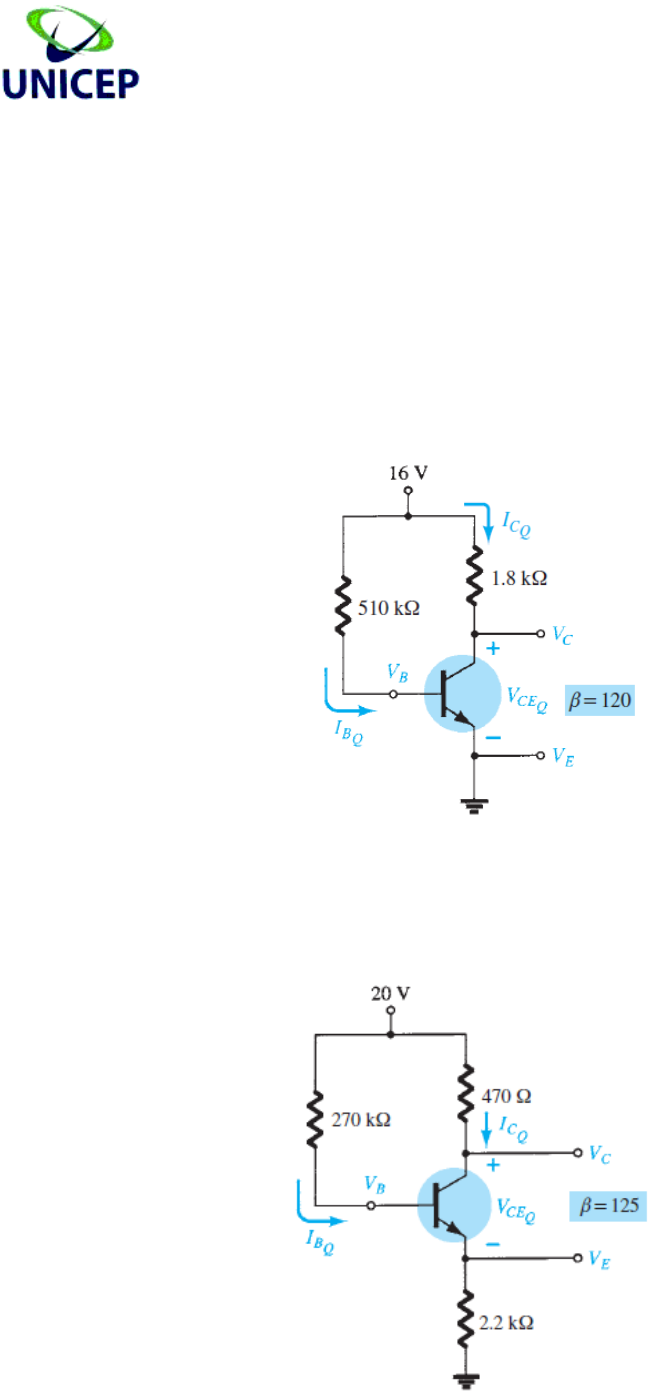 1 Centro Universitário Central Paulista Segunda Lista de Exercícios de Eletrônica Engenharia de Computação Prof. Mário L. Botêga Jr. 1. Considere a configuração emissor comum com polarização fixa, mostrada na Figura 1 e determine: IBQ; ICQ; VCEQ; VC; VB; VE. Figura 1 2. Considere a configuração emissor comum com polarização estável de emissor, mostrada na Figura 2 e determine: IBQ; ICQ; VCEQ; VC; VB; VE. Figura 2 2 3. Considere as informações fornecidas na Figura 3 e calcule: ; VCC; RB. Figura 3 4. Considere a configuração emissor comum com polarização por divisão de tensão, mostrada na Figura 4 e determine: IBQ; ICQ; VCEQ; VC; VB; VE. Figura 4 3 5. Considere as informações fornecidas na Figura 5 e calcule: IC; VE; VCC; VCE; VB; R1. Figura 5 6. Considere a configuração emissor comum com polarização fixa, mostrada na Figura 6 e determine: Zi; Zo; Av; Ai. Figura 6 4 7. Considere a configuração emissor comum com polarização por divisão de tensão, mostrada na Figura 7, considere hoe = gos e determine: a) re; Zi; Zo; Av b) Recalcule Av se for conectado uma carga de 1 kΩ na saída do amplificador. Figura 7 8. Para um JFET com IDSS = 6,0 mA e Vp = -4,5 V, determine: a) ID para VGS = - 2 V b) VGS para ID = 3 mA 9. Um JFET possui ponto Q definido por IDQ = 3,0 mA e VGS = -3,0 V. Determine IDSS se Vp = -6,0 V. 10. Usando a equação de Shockley, determine IDQ e VDSQ para o circuito da Figura 8. Figura 8 5 11. Para o circuito da Figura 9 determine: a) IDQ e VGSQ b) VDS, VD, VG e VS Figura 9 12. Para o circuito da Figura 10 determine: a) VG b) IDQ e VGSQ c) VDSQ d) VD e VS Figura 10